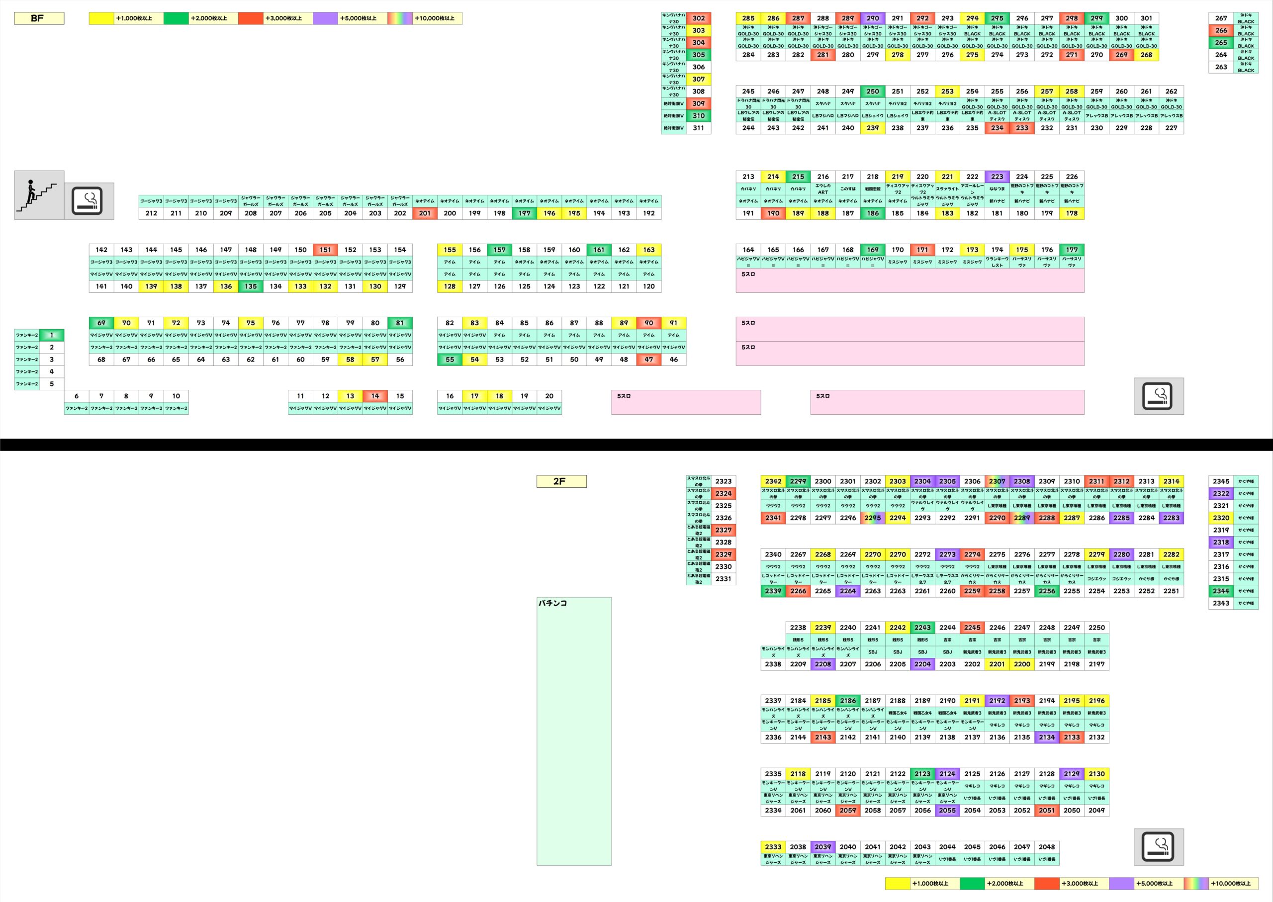 この日の結果は総差枚+17.9万枚、台平均+407枚とかなり優秀。傾向通り様々なエリアで数多くの高配分機種が見受けられ、大量出玉の優秀台が至るところで散見されました。