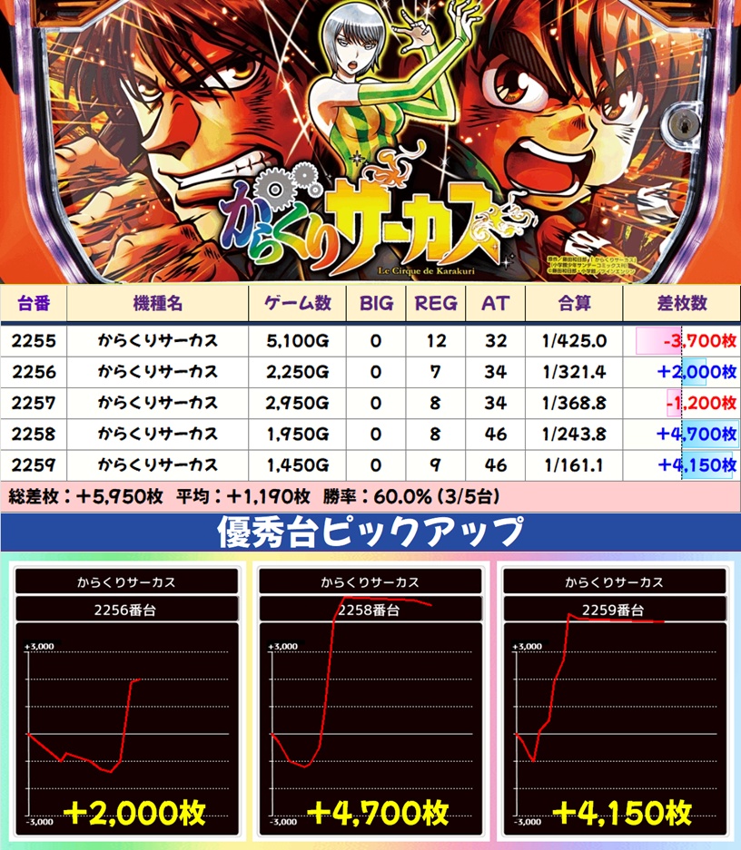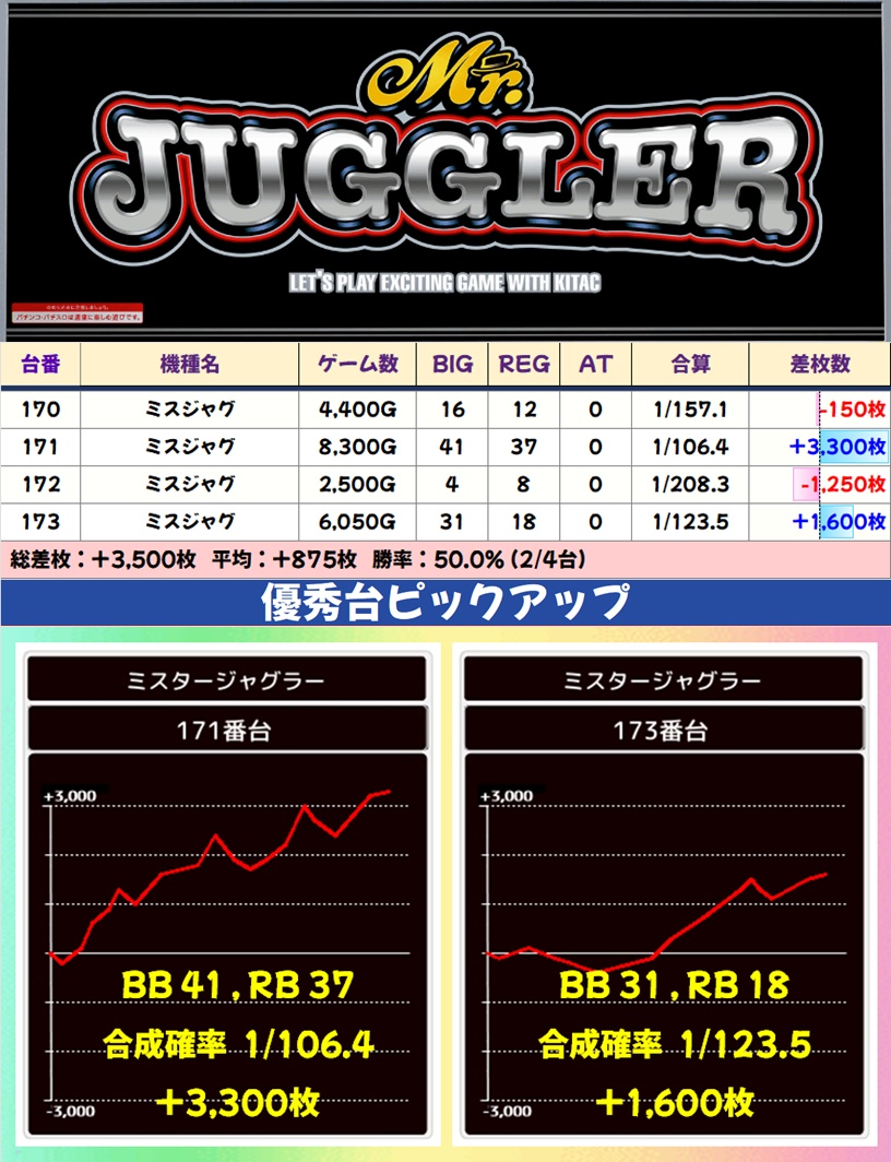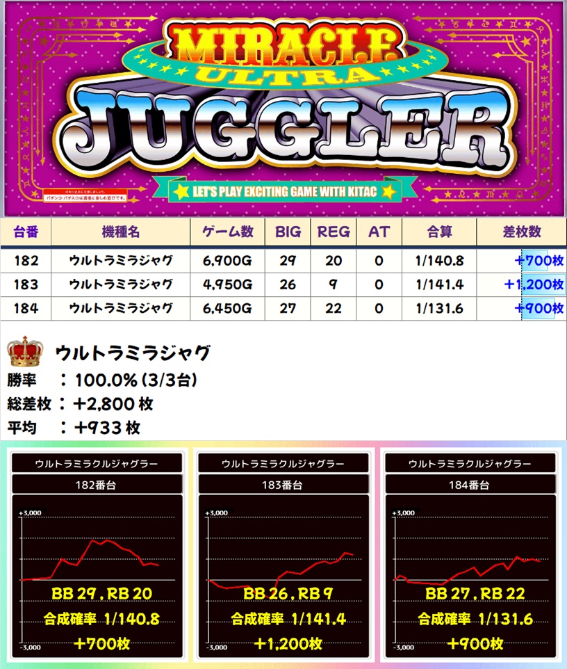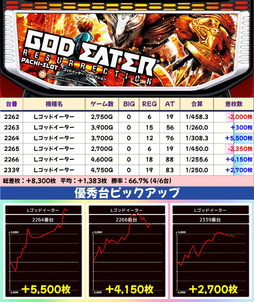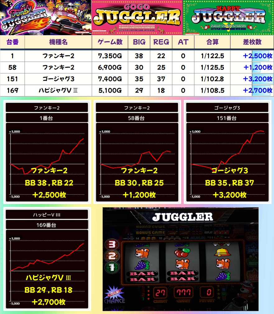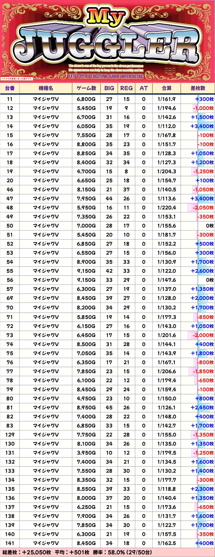 勝率は50%超となっており全体の約半分がプラス差枚。つまり、それだけ多くのお宝が用意されていたということ。今回に限らず毎回充実した仕掛けに期待できるので、次回以降も足を運ぶことをオススメします。