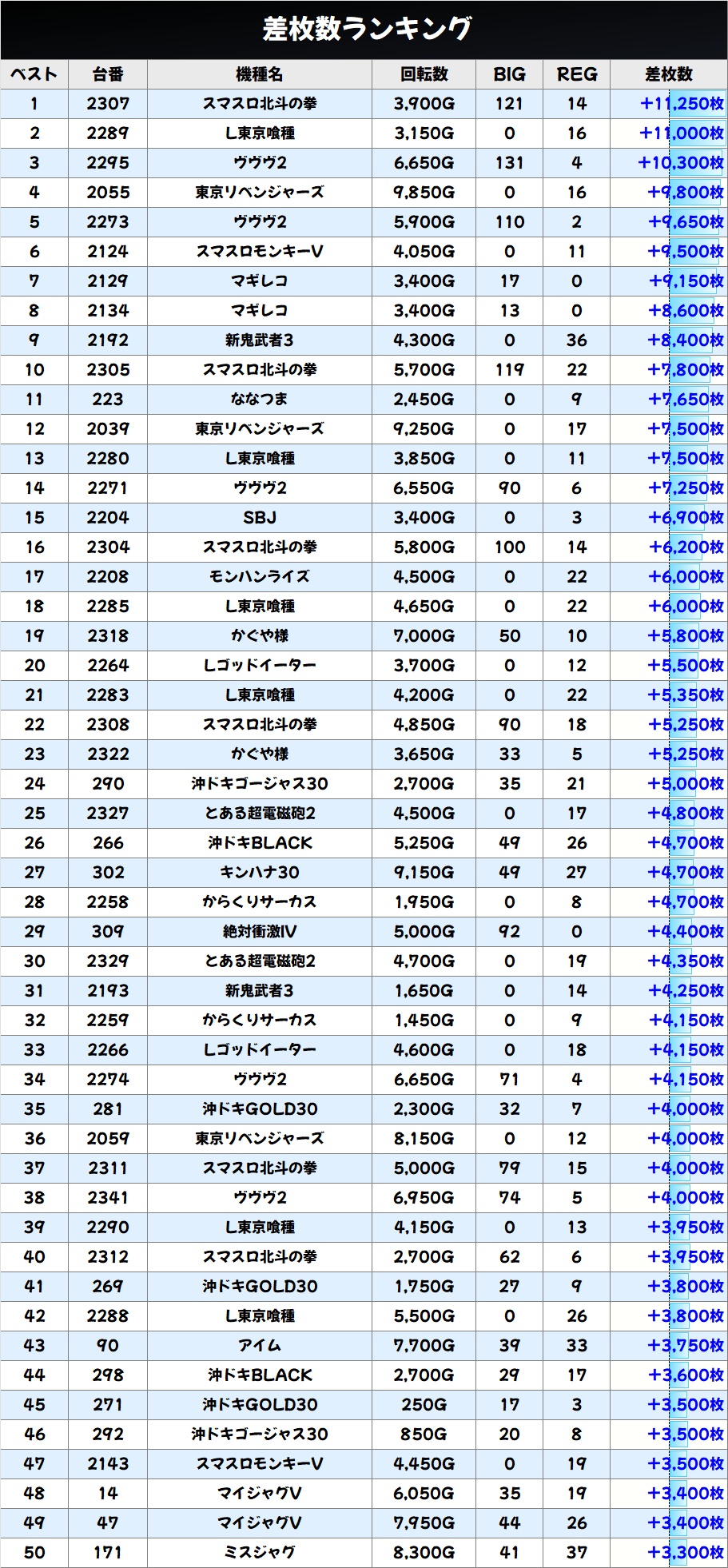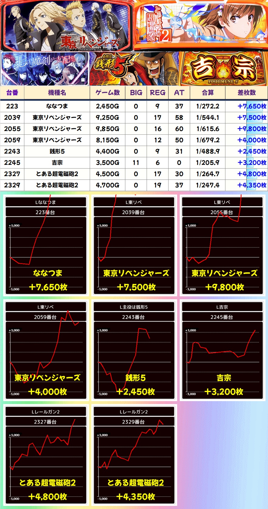 仕掛け外と思われた機種にも単品の優秀台が盛りだくさん。東リベは3台が+4,000枚オーバーで1台は万枚目前。とある超電磁砲2にも+4,000枚オーバー台が2台あったり、バラエティのななつまに+7,000枚オーバー台があったりと、全エリア満遍なくお宝が散りばめられていた様子が窺えます。