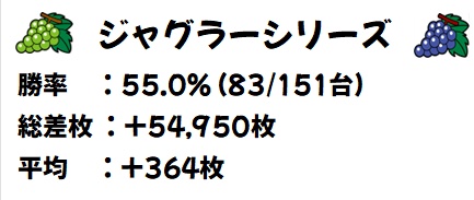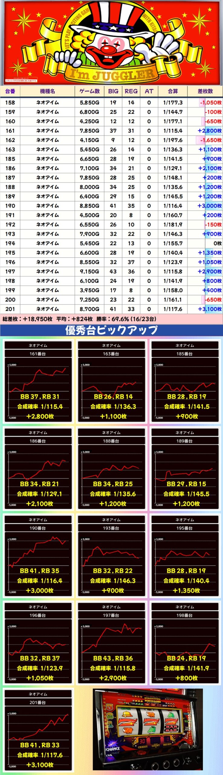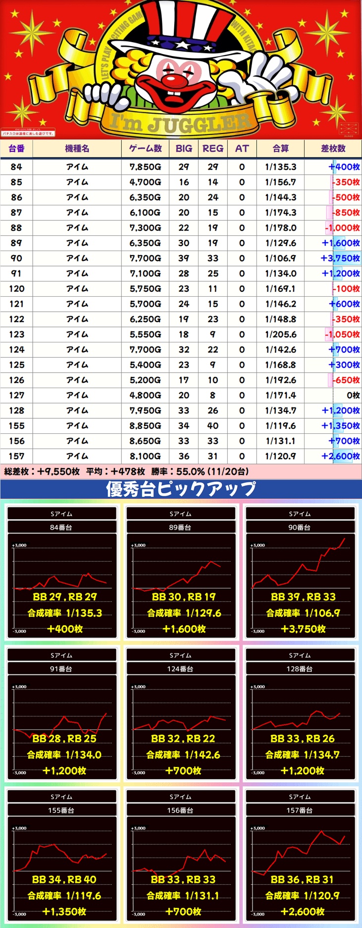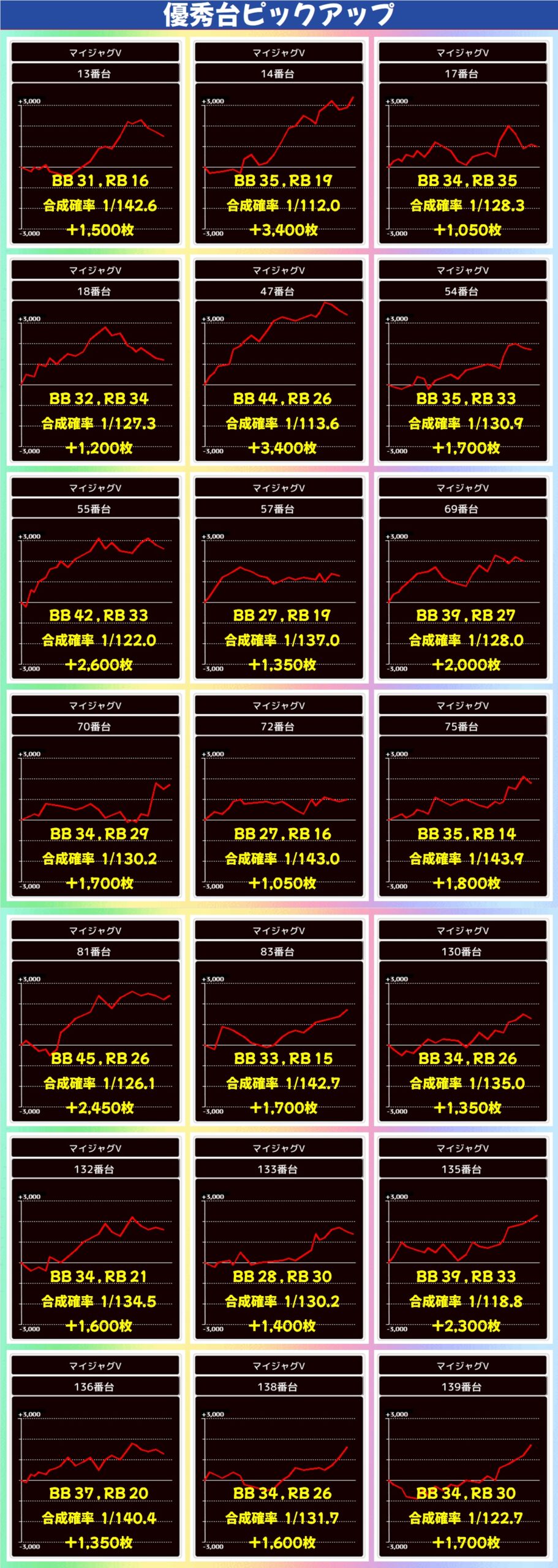 少台数機種ではウルトラミラジャグが3台全てプラスで平均+933枚という好成績。ミスジャグも半数がプラスと好調で、+3,000枚オーバーの優秀台が出現しました。多台数機種ではマイジャグV・ネオアイム・アイムが1/2系濃厚と思われる内容。いずれも高勝率となっており、それぞれに合算良好台が散見されました。