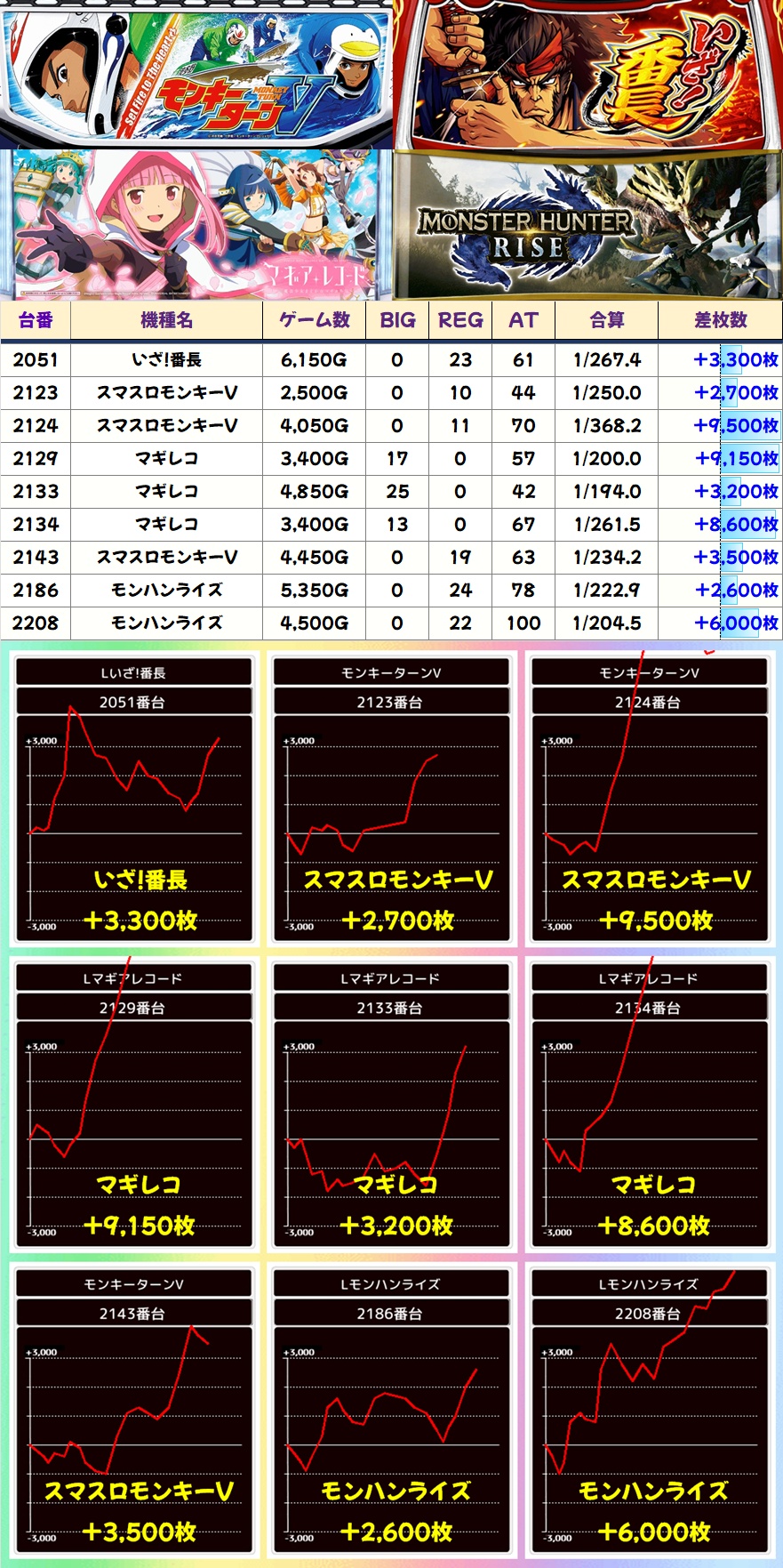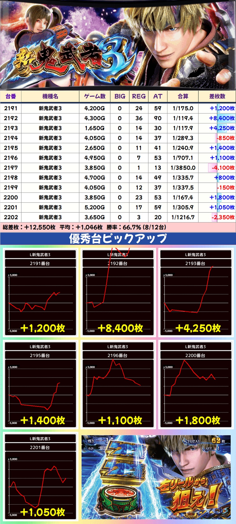 ほかにも高配分以上と思われる好調機種がまだまだありました。新台のヴヴヴ2からは万枚突破台や+9,000枚オーバー台といった大量出玉が複数出現。新鬼武者3・絶対衝激Ⅳも高勝率となっており、新台系にもしっかり仕掛けが用意されていました。