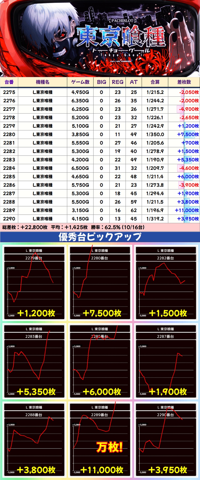 毎日オススメ機種はスマスロ北斗・東京喰種が1/2系濃厚となっており、双方から万枚突破台が出現。かぐや様にも+5,000枚オーバー台が複数あり、全体的に賑わっていました。