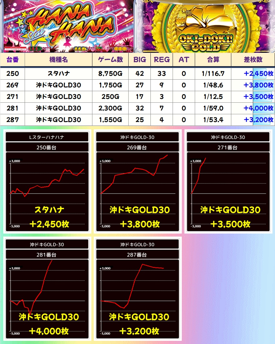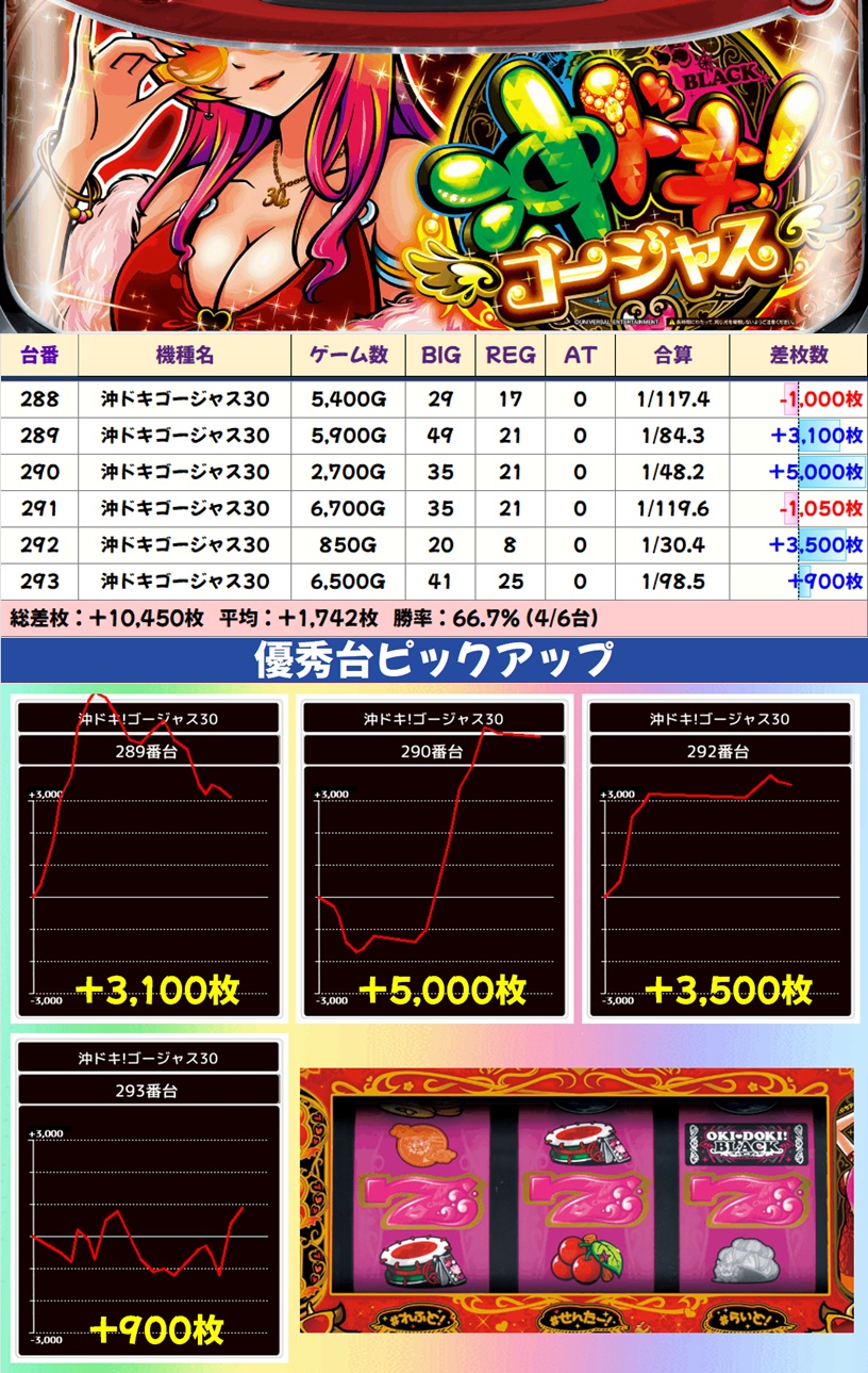 単品ではスタハナ・沖ドキGOLDにも+2,000枚オーバーの優秀台が確認でき、仕掛け外の機種にも満遍なくお宝が投入されていた様子が窺えます。3のつく日の沖スロはお宝満載なので、せひとも狙ってみてください。