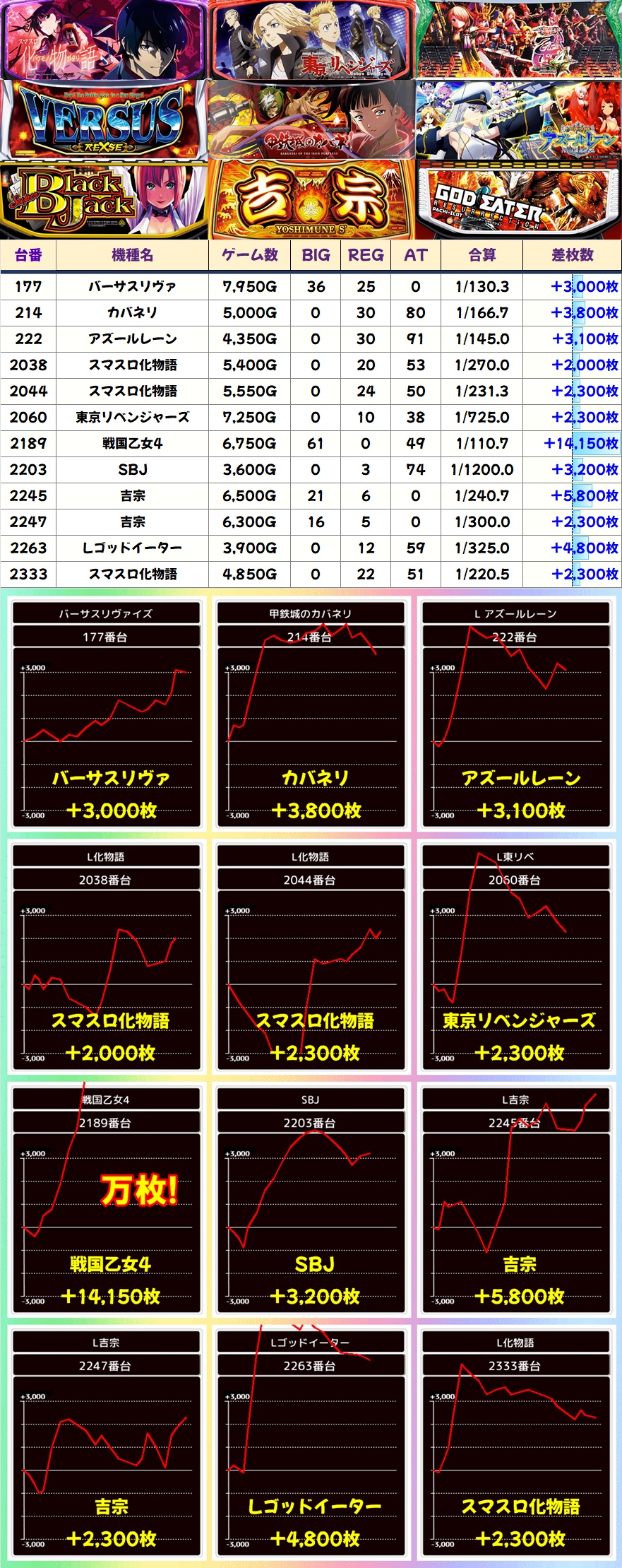 ほかにも様々な機種から単品の優秀台が出現。戦国乙女4に万枚突破台が確認できたほか、最新台のスマスロ化物語に+2,000枚オーバー台が複数あったりと、幅広くお宝が散りばめられていた様子が窺えました。