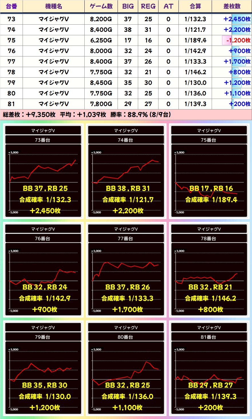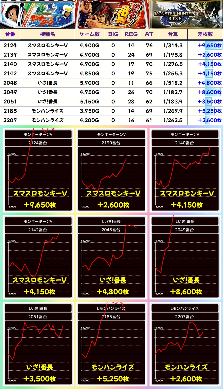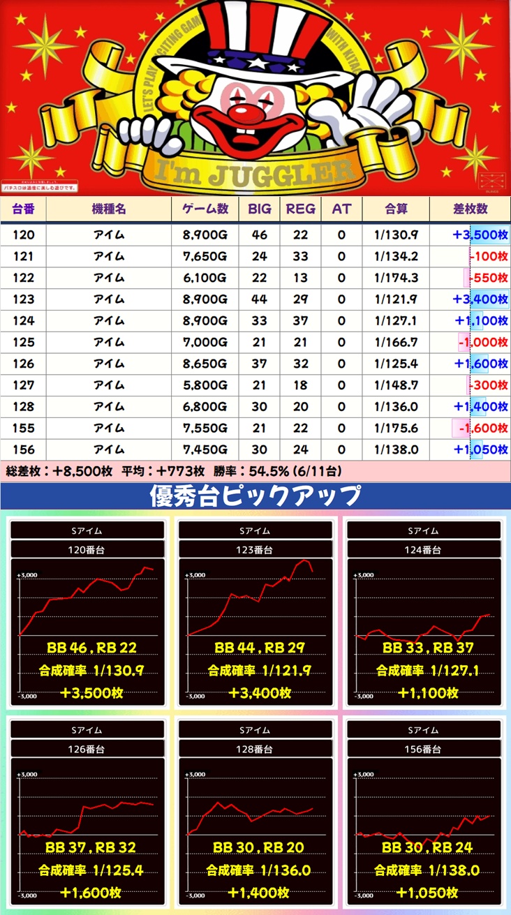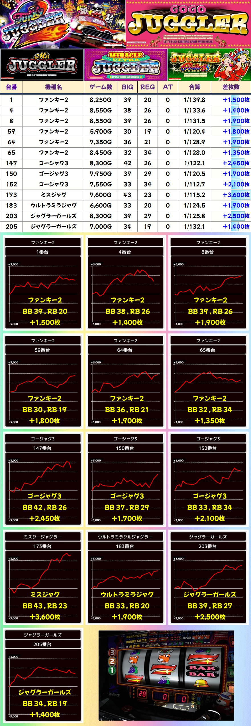 それ以外にも+1,000枚以上の優秀台が盛りだくさん。紹介していない台のなかにも多くのお宝台があったことでしょう。ジャグラーコーナーもかなり注力されているので、堅い勝負を好まれる方はジャグから攻めるのも手です。