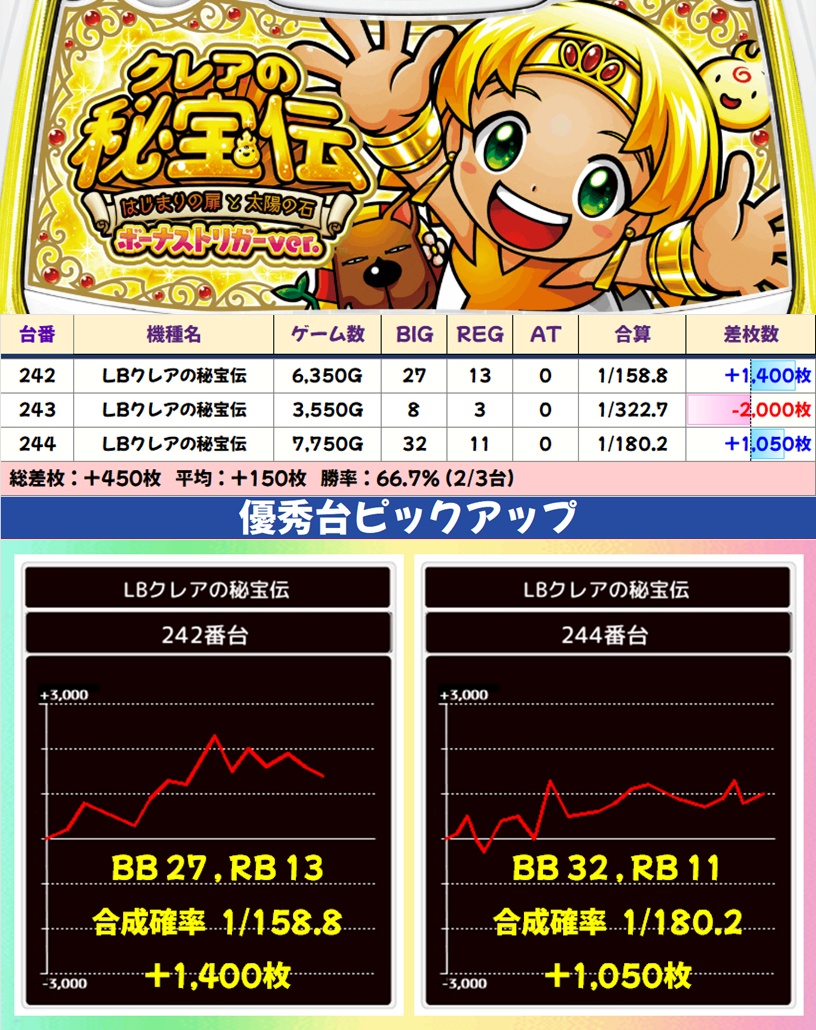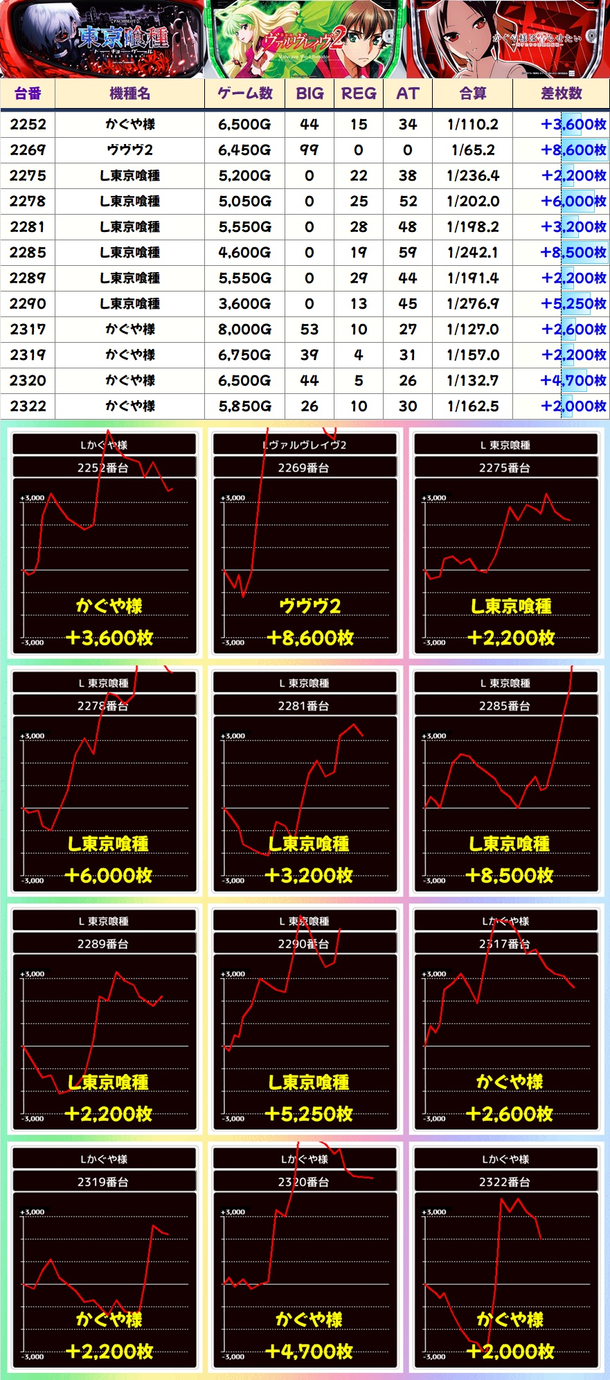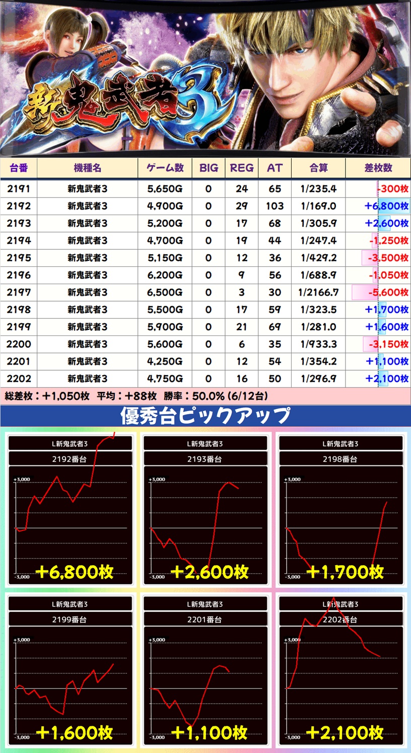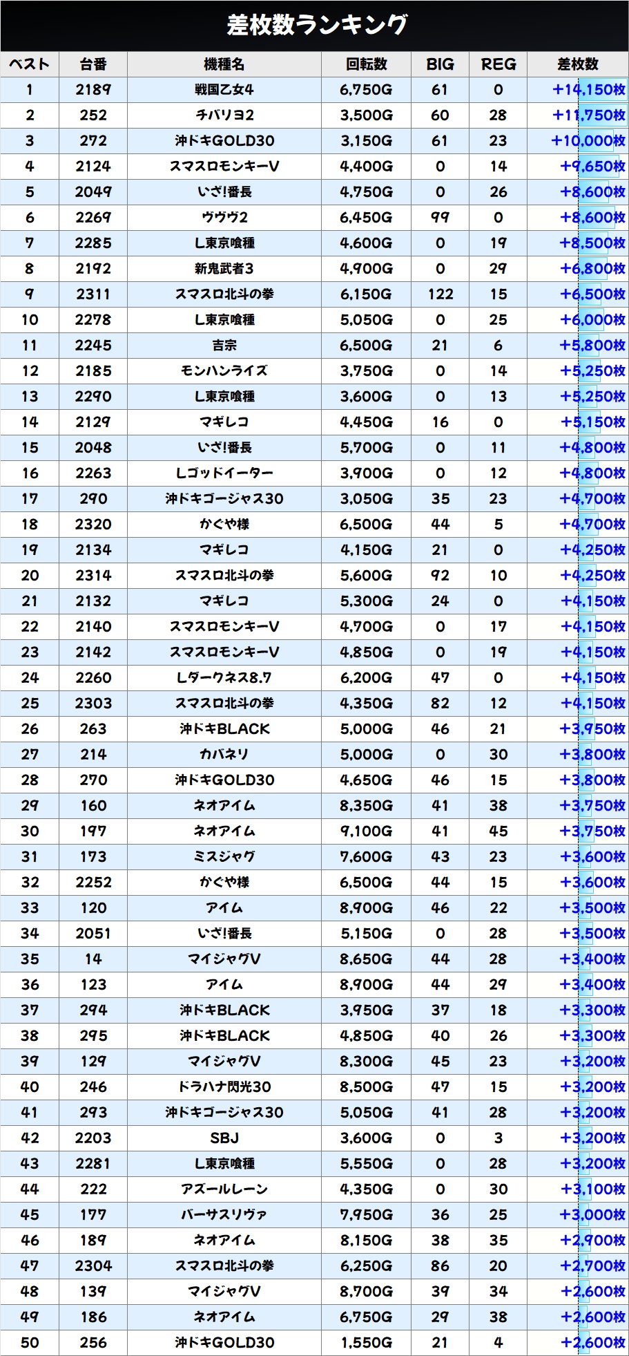 それ以外にも+1,000枚以上の優秀台が盛りだくさん。紹介していない台のなかにも多くのお宝台があったことでしょう。ジャグラーコーナーもかなり注力されているので、堅い勝負を好まれる方はジャグから攻めるのも手です。