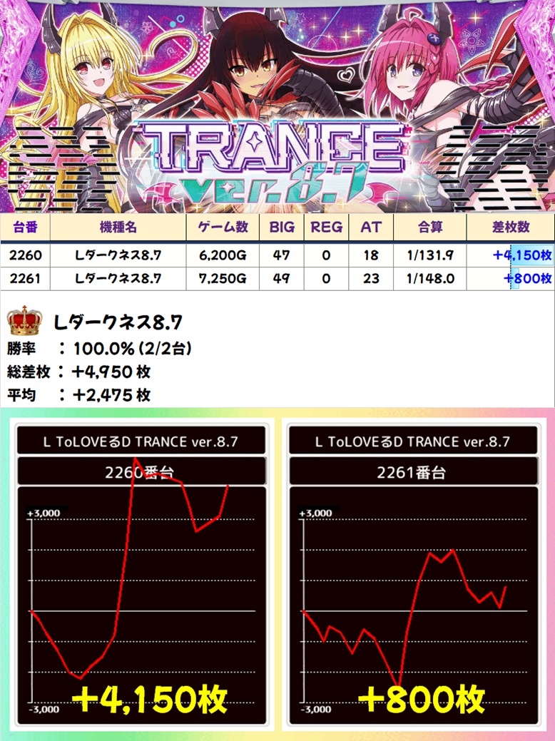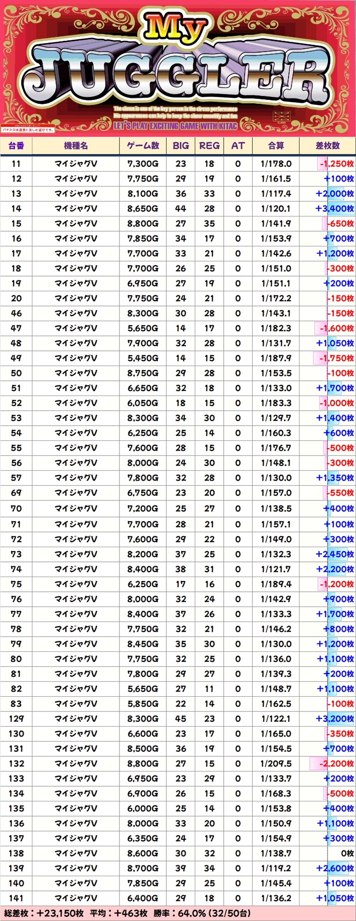 今回はジャグラーシリーズも全体的に高勝率となっており、シリーズ総差枚は約+5万枚という素晴らしい結果に。高配分&並び仕掛けはもちろんのこと、各機種に当たりがあったのではないかと思われる状況でした。