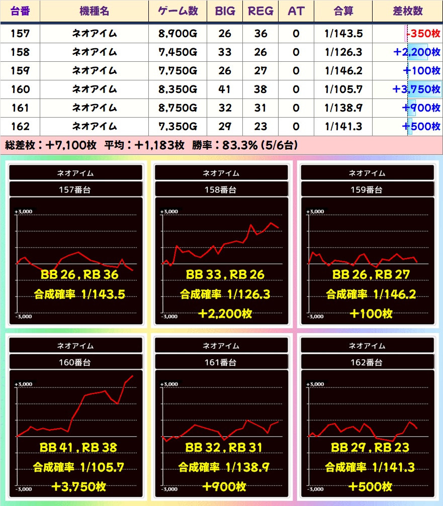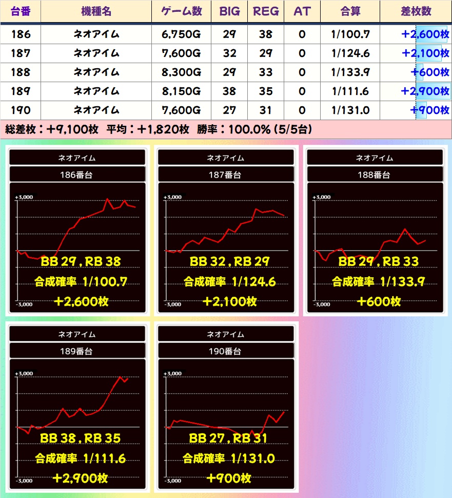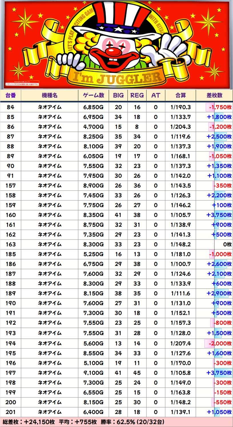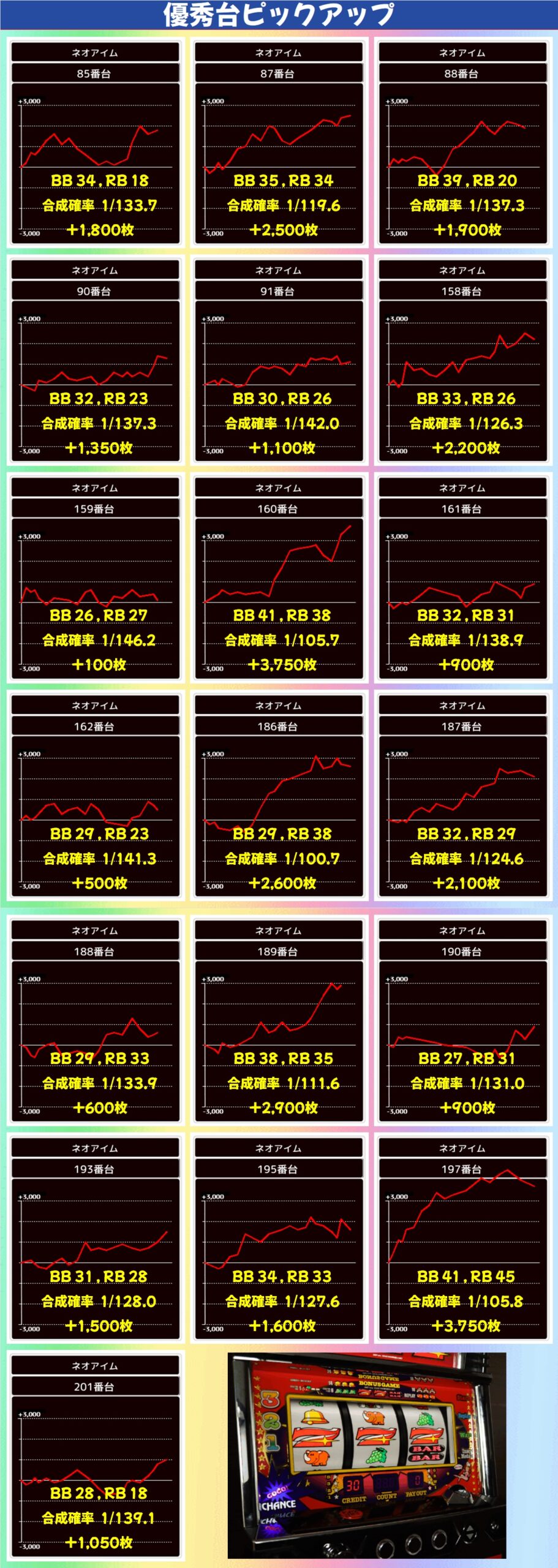 好調機種は複数あり、ネオアイム・アイムが1/2系濃厚、マイジャグVが高配分と思われる結果。多台数のネオアイム&マイジャグVには並びで出ている箇所も確認でき、塊仕掛けも多分に含まれていたものと思われます。