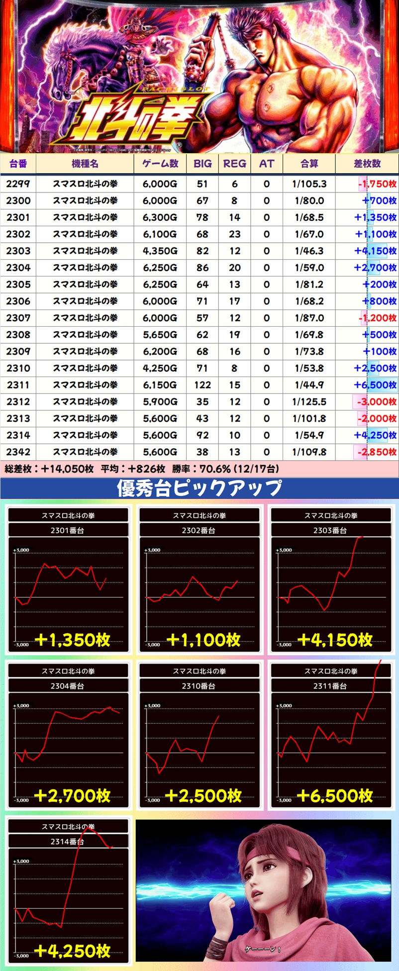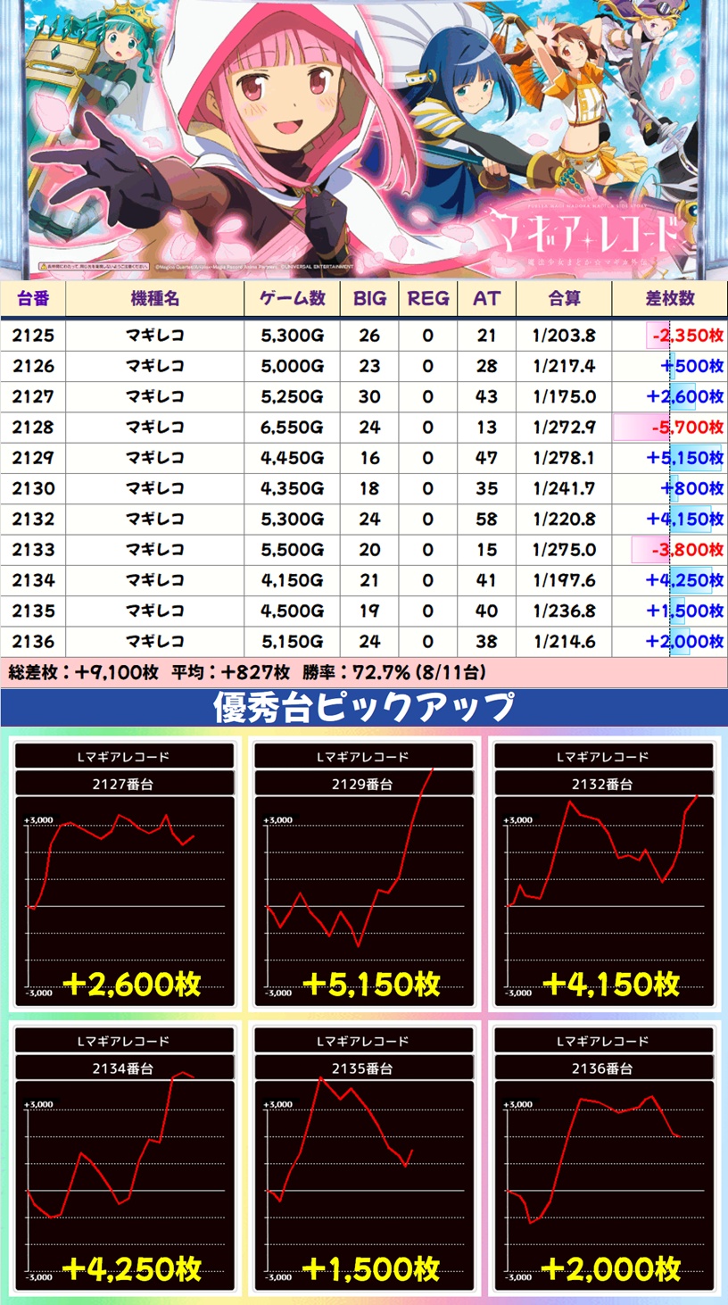 主力機&毎日オススメ機種にも必ず仕掛けがあります。主力機ではマギレコが1/2系濃厚、毎日オススメ機種ではスマスロ北斗が高配分と思われる結果で、多くの優秀台が出現しました。