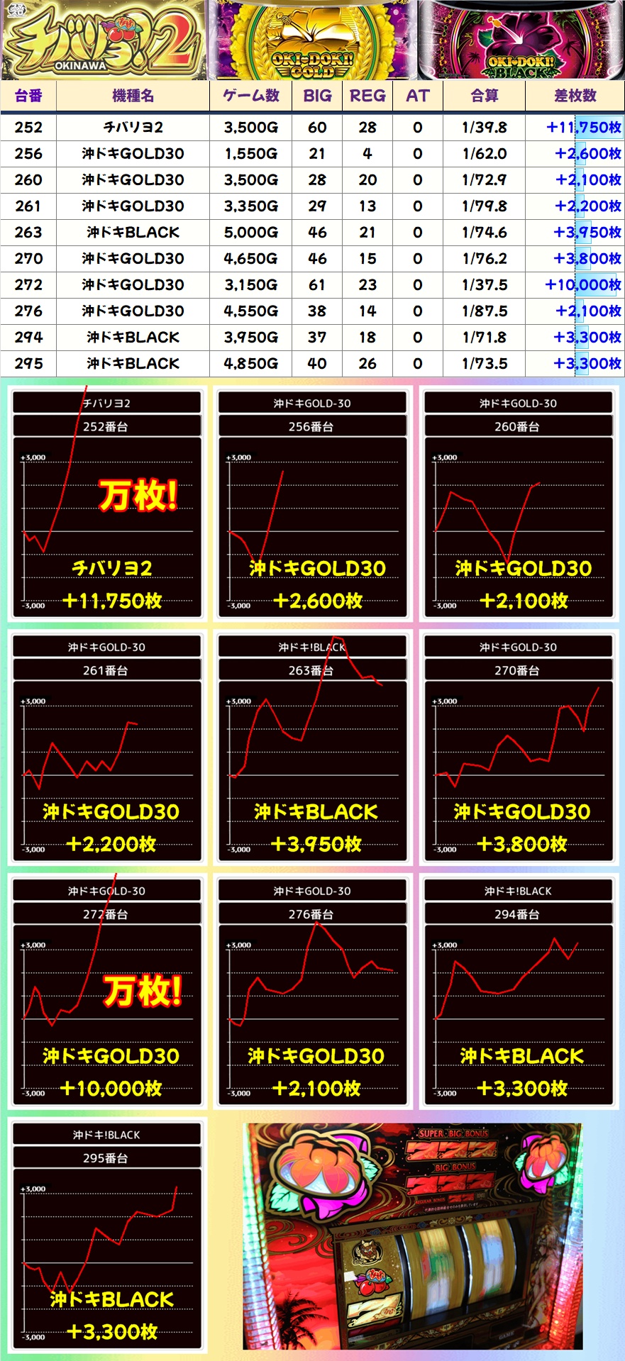 また、単品も盛りだくさんで、チバリヨ2・沖ドキGOLDからは万枚突破台も確認。いずれもほぼ一撃での万枚奪取はお見事でした。ご覧の通り、3のつく日の沖スロコーナーはお宝満載の状況になっているので、次回以降も要注目!