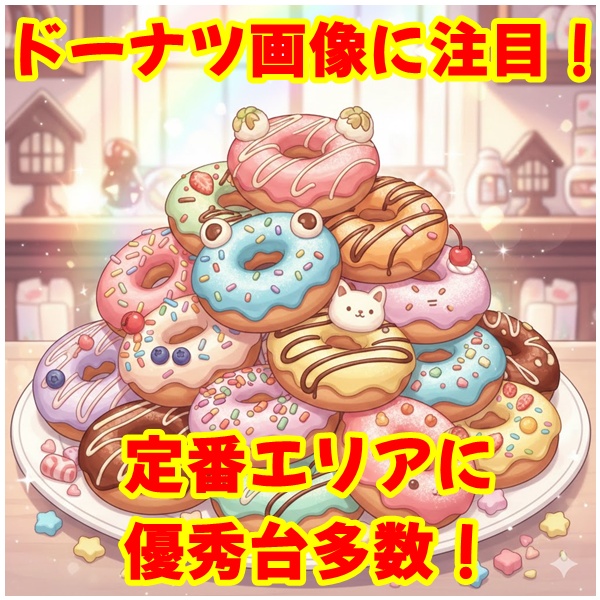 今回も公式ポストから追撃ポストがあり、下記画像が投稿されました。毎回ドーナッツ画像出現時はジャグに優秀仕掛けが用意され、今回も画像にまつわる機種が優秀となりました。