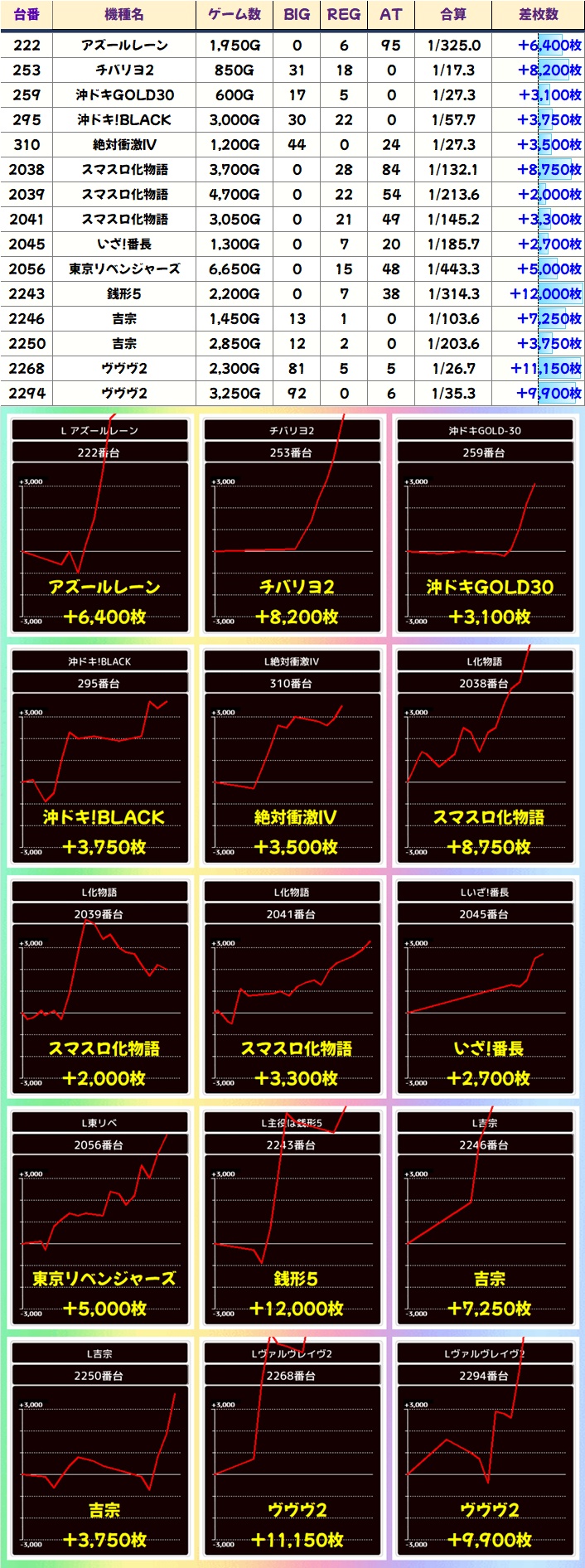 単品優秀台も数多くあり!ヴヴヴ2た銭形5からは万枚クラスも!直近3か月は新台系からも優秀台が確認できており、今回も化物語が9000枚の結果を残しました