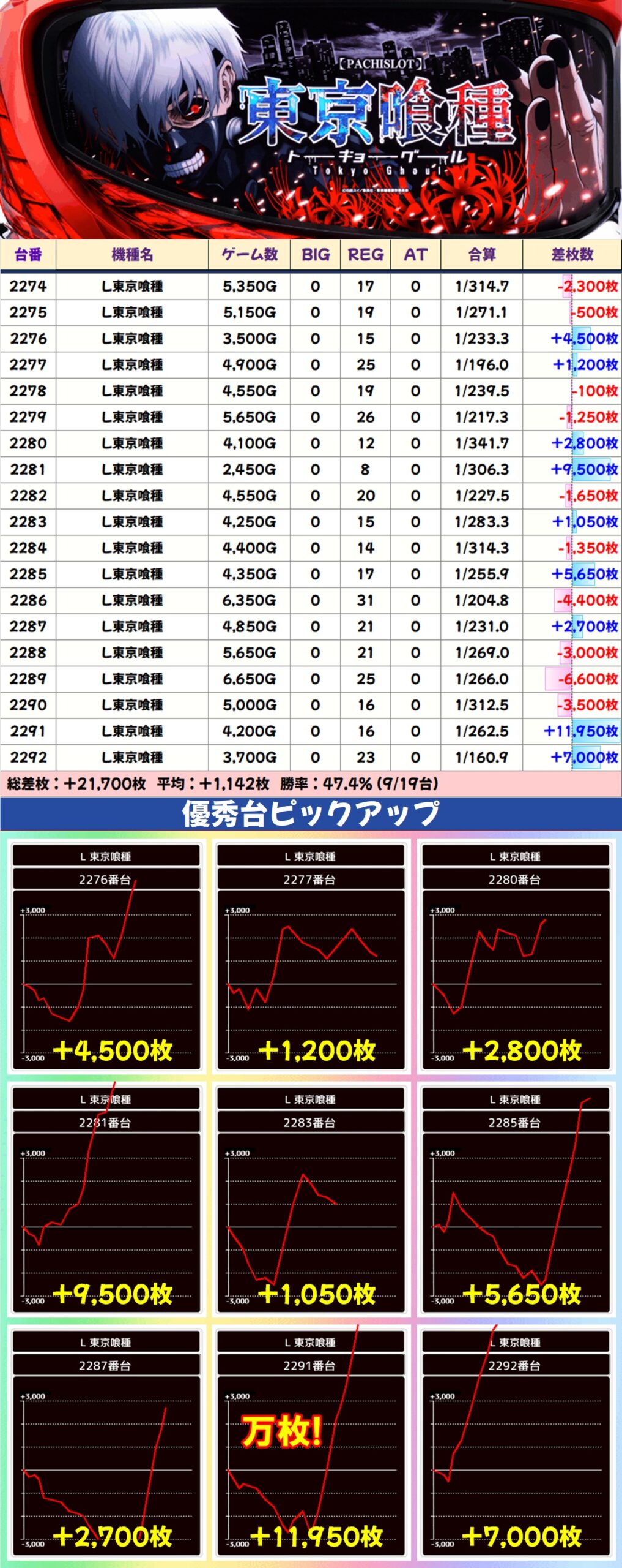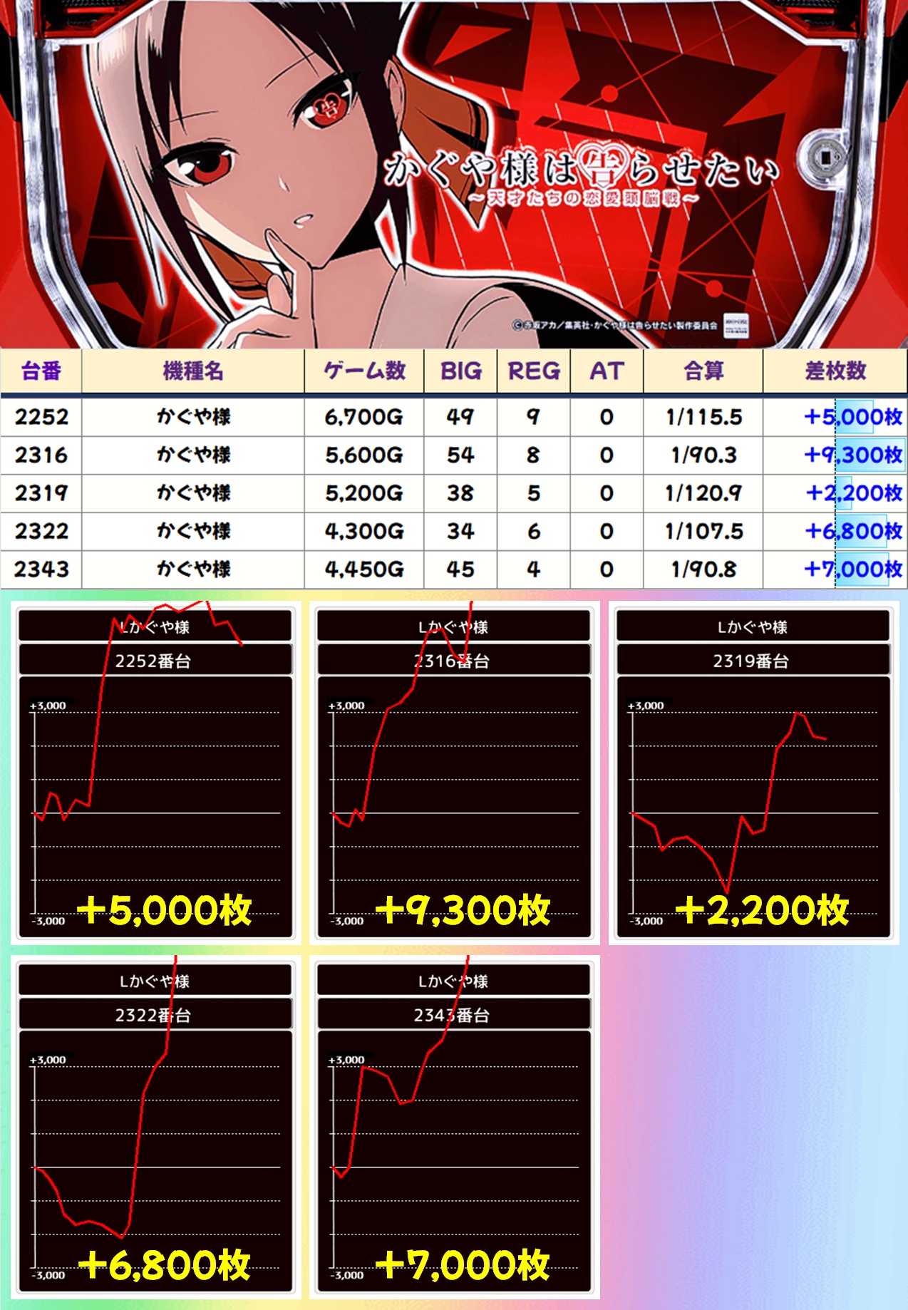 それ以外にも毎日オススメ機種はお宝満載となっており、万枚突破台が3台出現したヴヴヴ2は平均+2,000枚オーバーの好成績を記録。東京喰種にも万枚突破台が確認でき、かぐや様も4台が+5,000枚オーバーと、どの機種も大量出玉が狙える仕掛けがふんだんに盛り込まれていました。