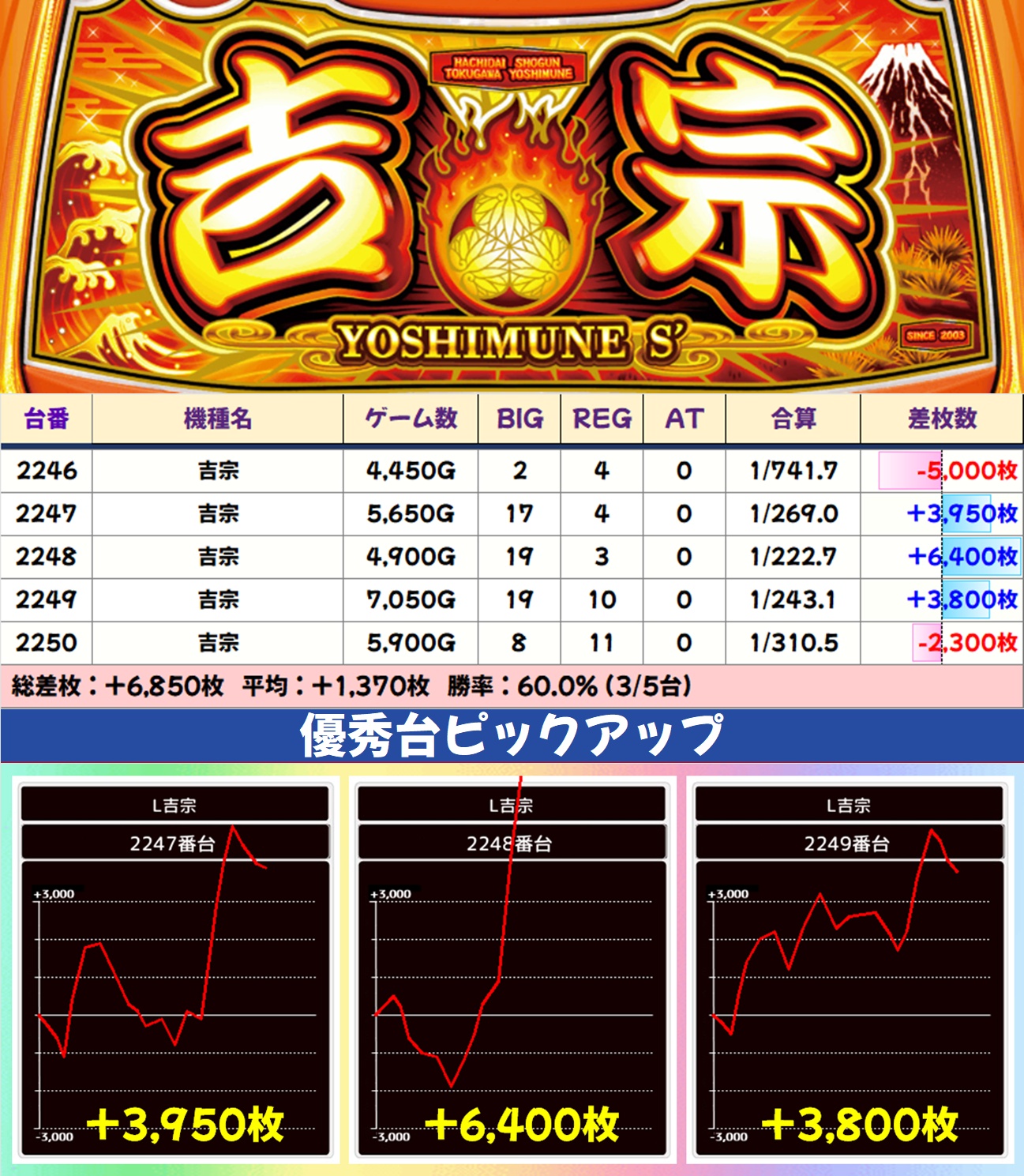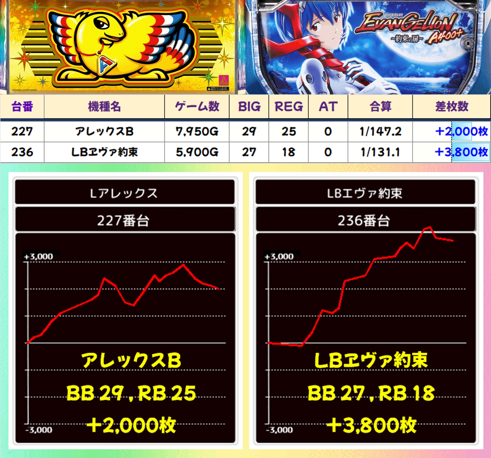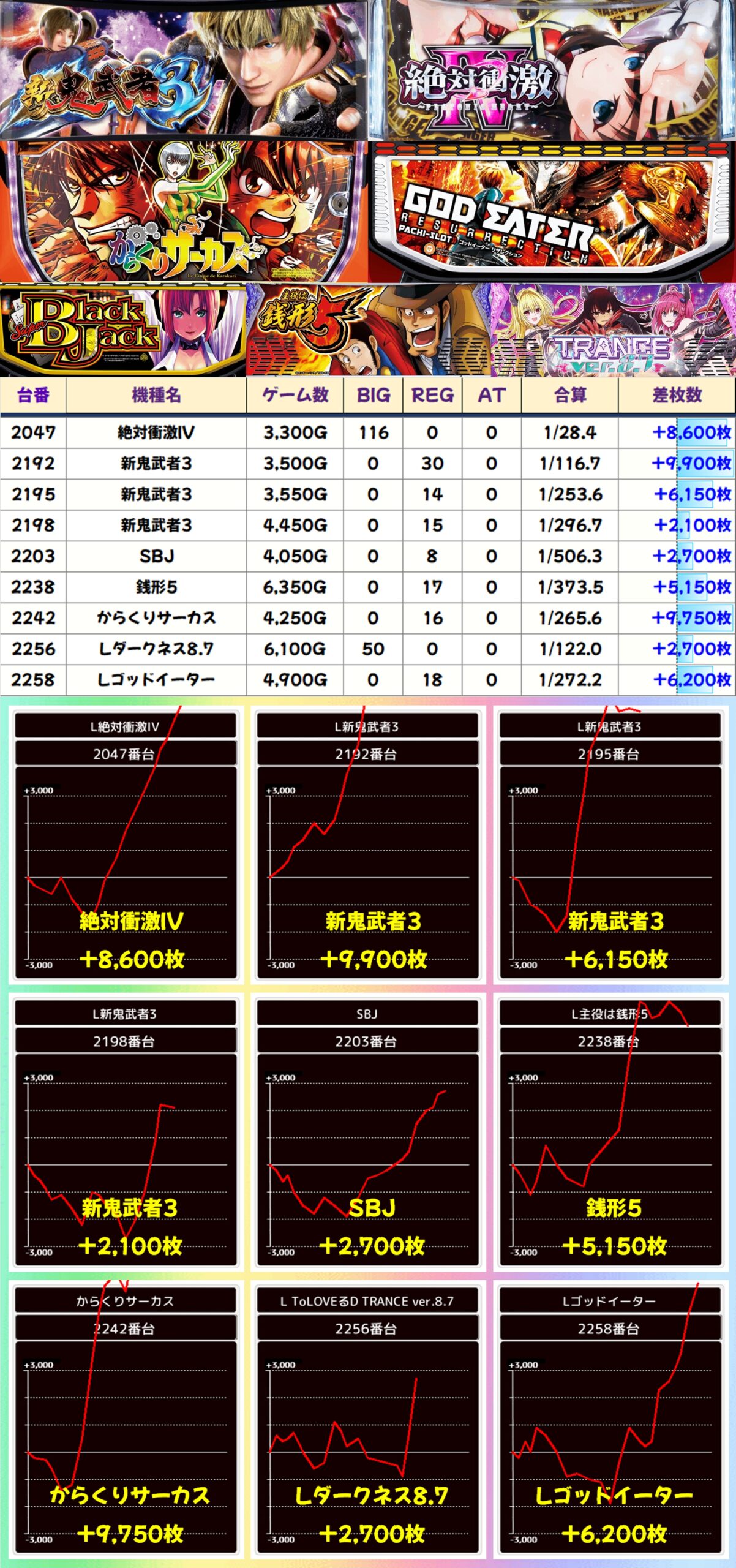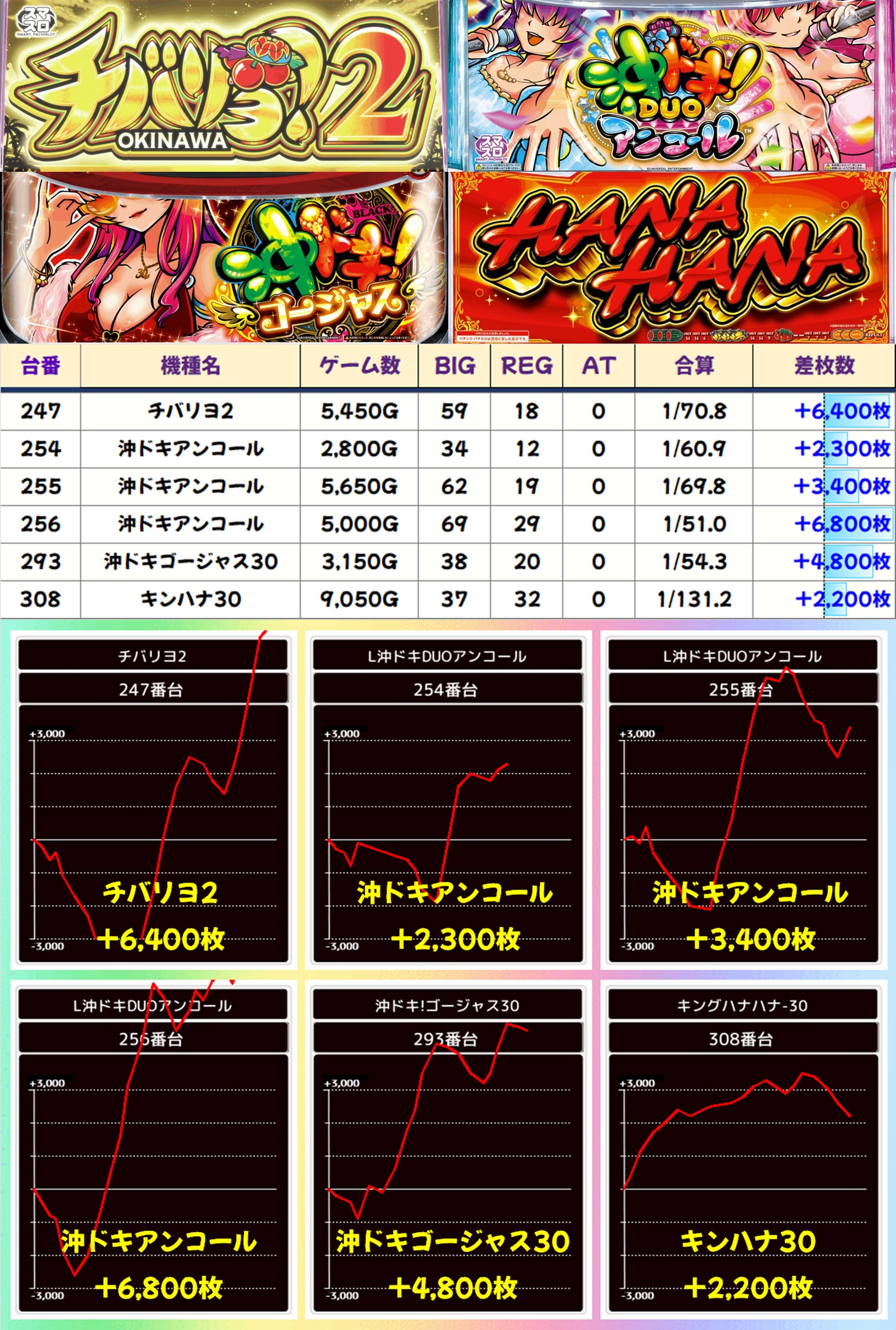 この日は総差枚+23万枚オーバーという凄まじい結果でしたが、今回に限らず7のつく日は毎回のように好結果が頻発しています。打つ台に迷った際は上記で挙げたエリアを中心に攻めるのがオススメ。悪番対策もされているので、抽選が悪くても狙える状況になっています。