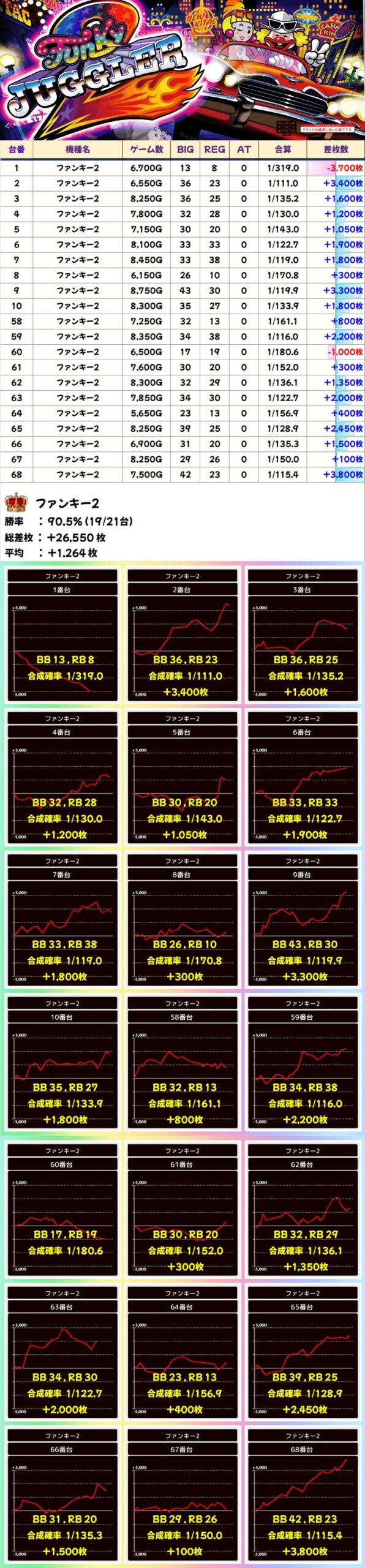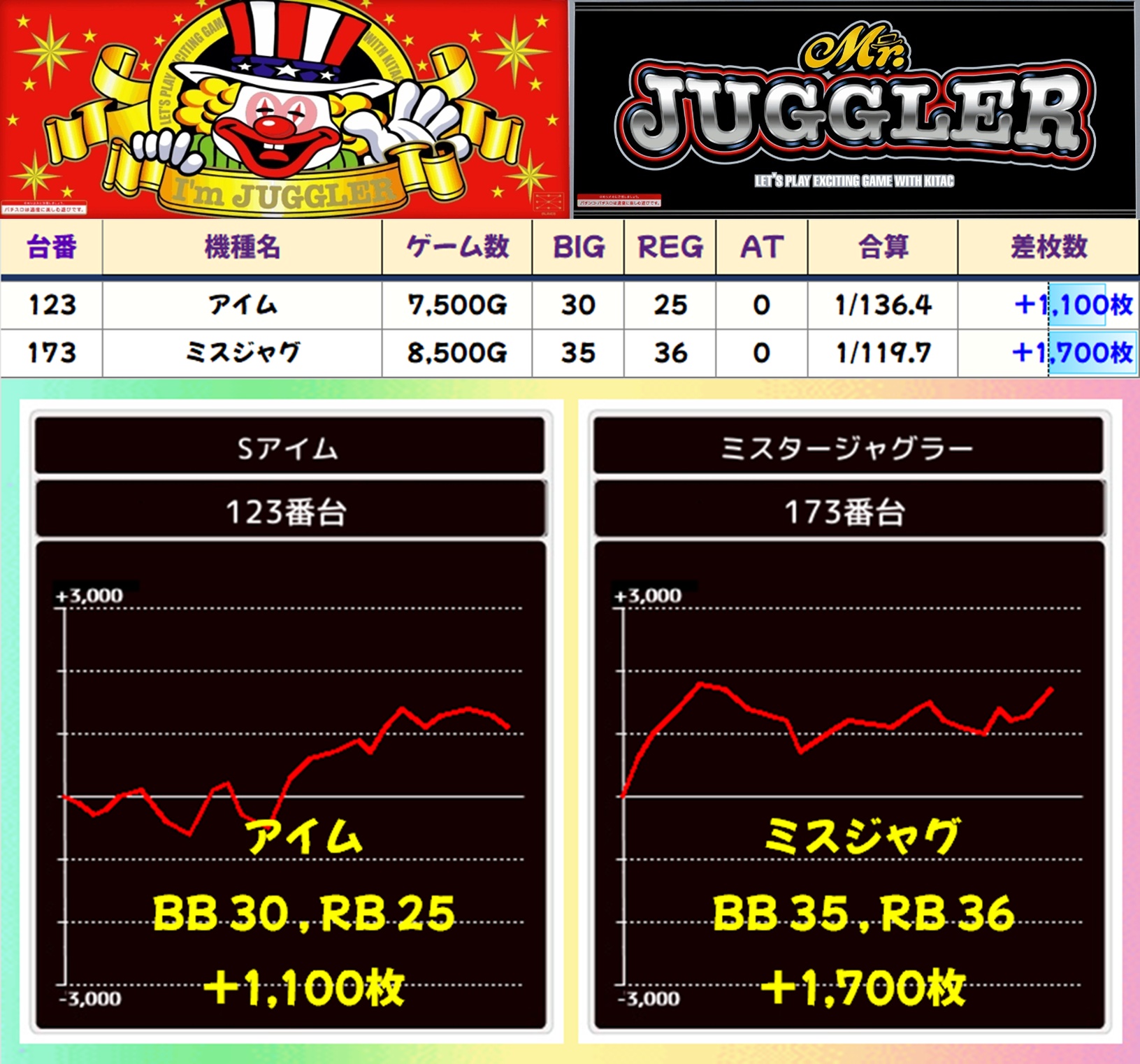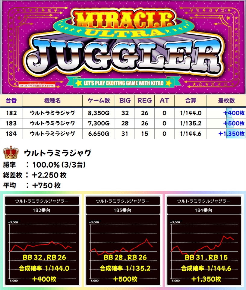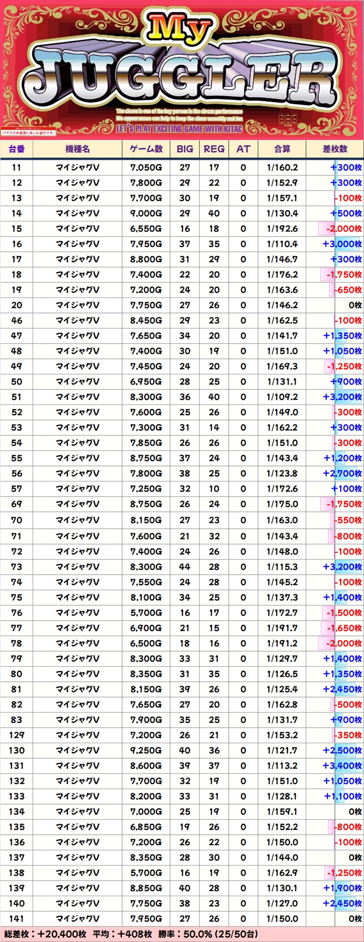 今回はファンキー2・ウルトラミラジャグの2機種が全台系濃厚。勝率は前者が90%オーバー、後者が100%という素晴らしい結果で、大いに賑わっていました。ほかにもマイジャグV・ゴージャグ3・ハピジャグの3機種が1/2系濃厚、ネオアイムも高配分と思われる結果で、いずれもトータル差枚はプラスに!