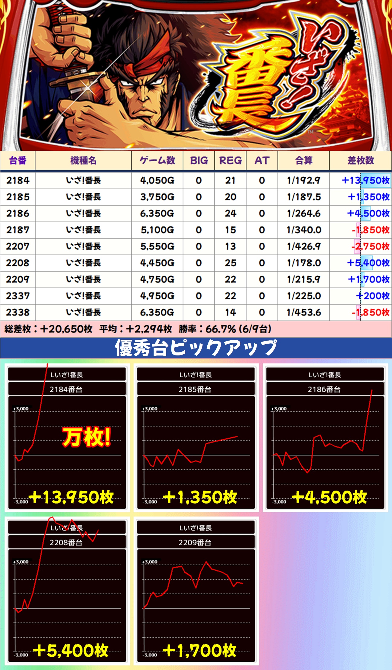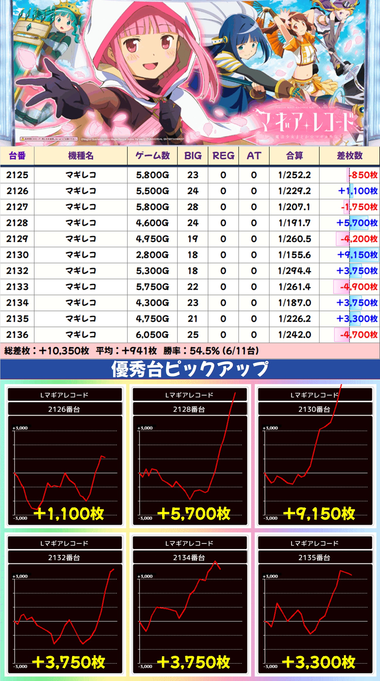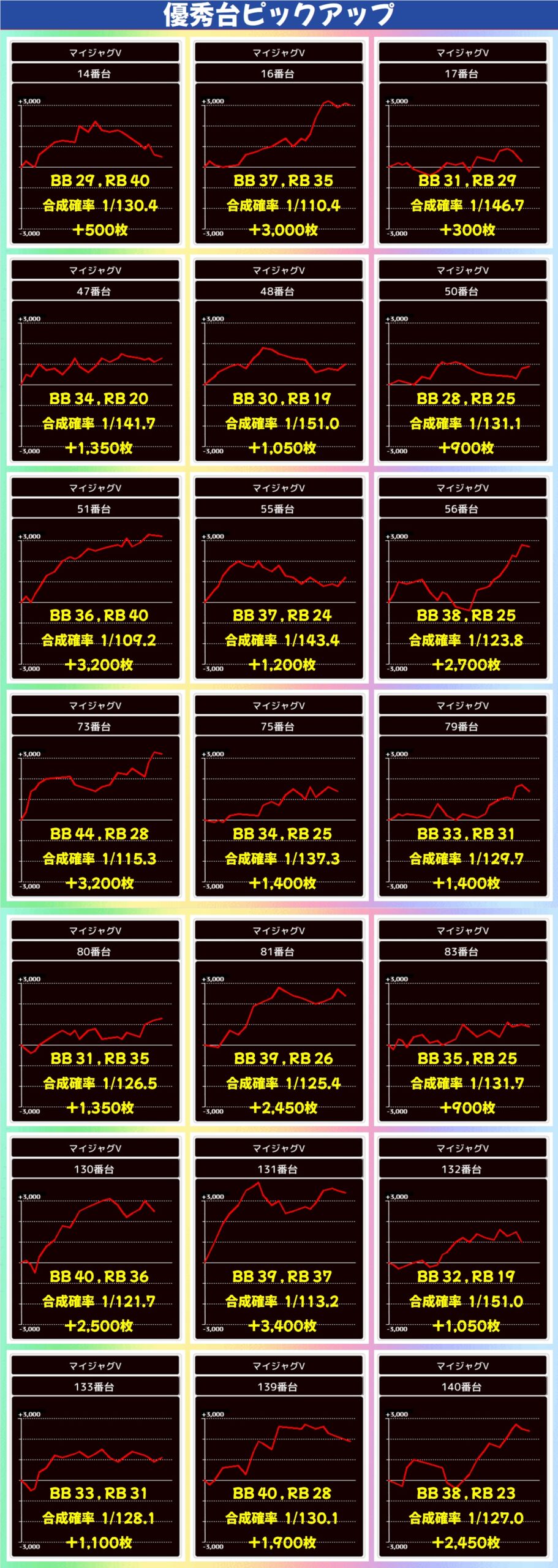 主力機ではモンキーV・マギレコ・いざ!番長が高配分と思われる結果で、いずれもトータル差枚は大幅なプラスに。大量出玉の優秀台も数多く出現し、いざ!番長には万枚突破台も確認できました。毎日オススメ機種と同様に、主力機もお宝多めとなっているのでかなり狙い目ですよ!