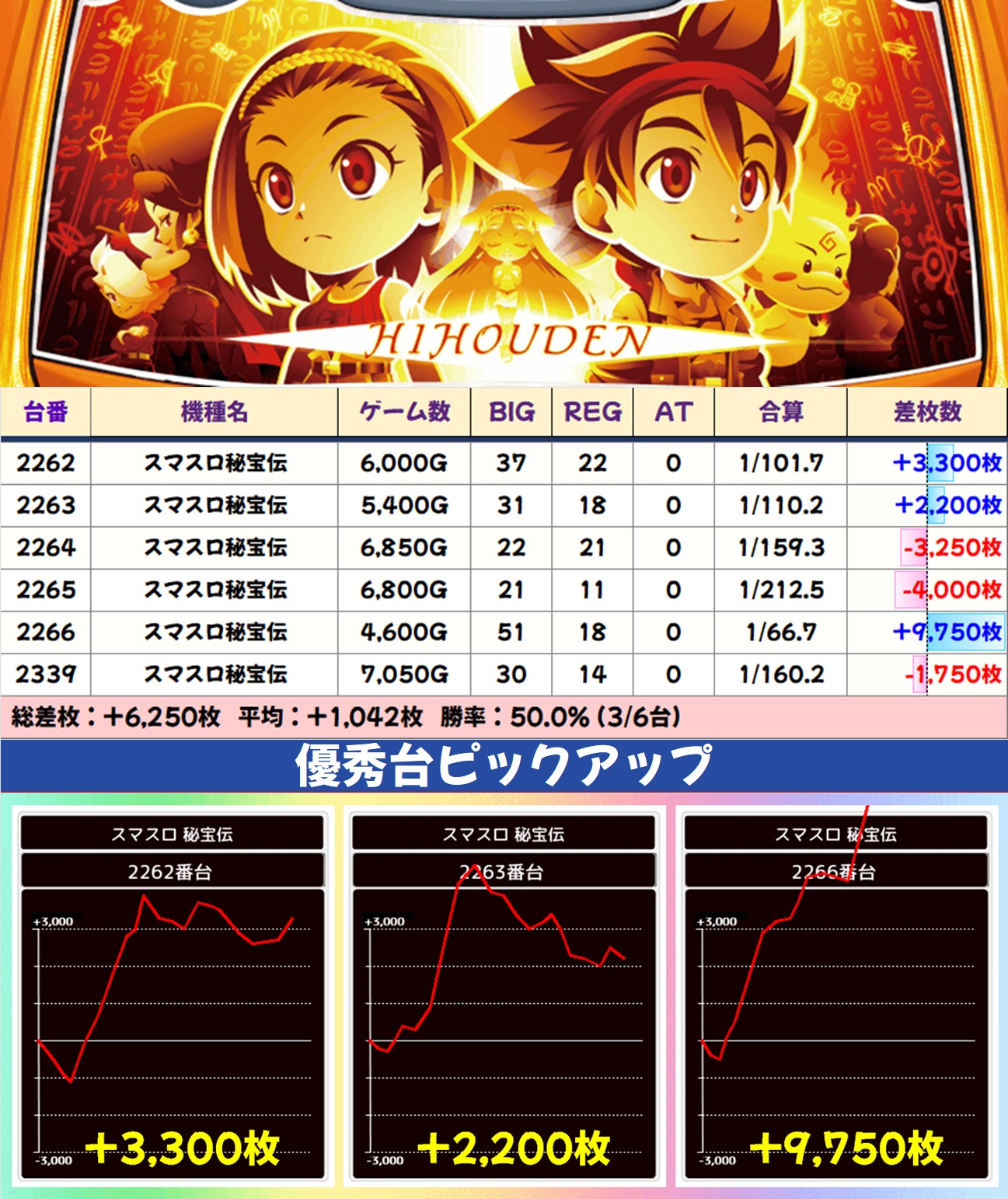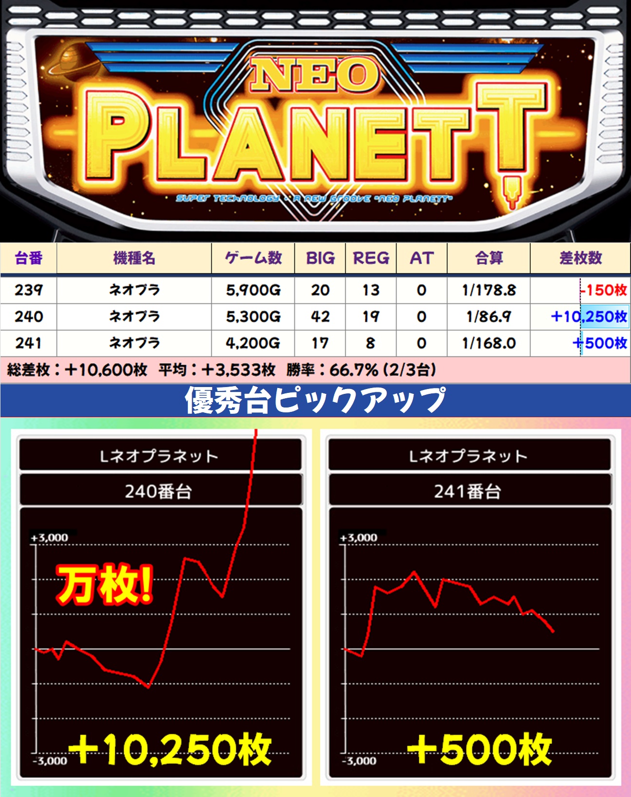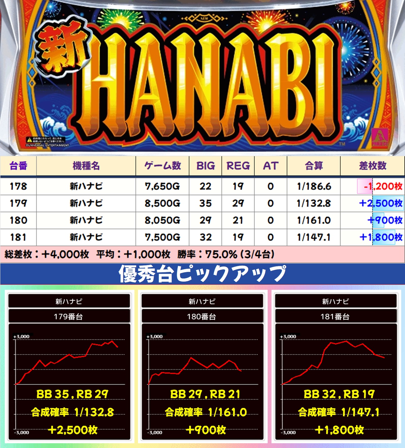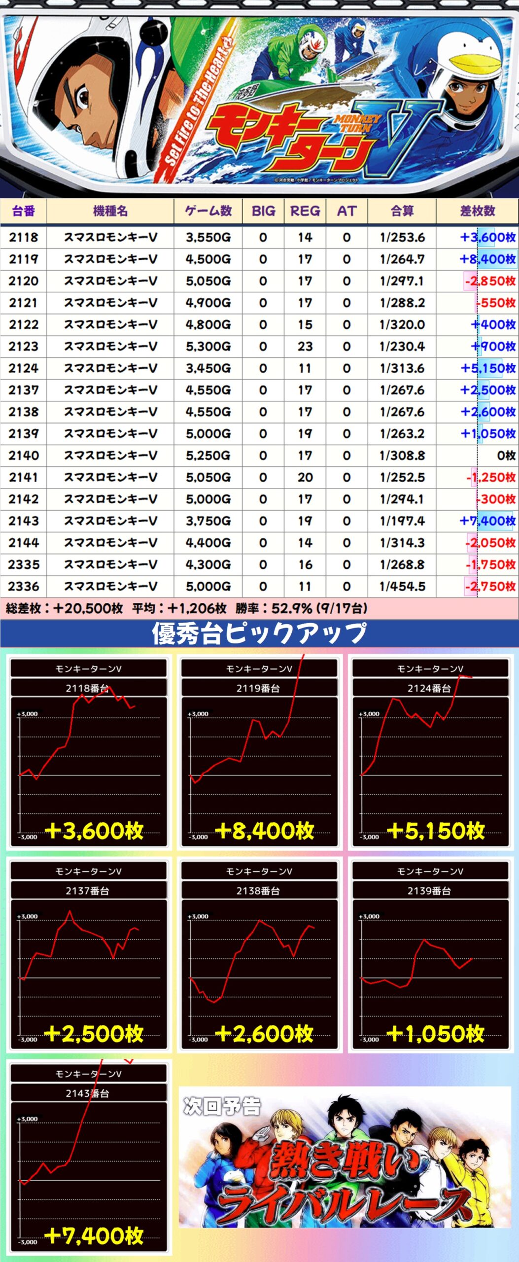 主力機ではモンキーV・マギレコ・いざ!番長が高配分と思われる結果で、いずれもトータル差枚は大幅なプラスに。大量出玉の優秀台も数多く出現し、いざ!番長には万枚突破台も確認できました。毎日オススメ機種と同様に、主力機もお宝多めとなっているのでかなり狙い目ですよ!
