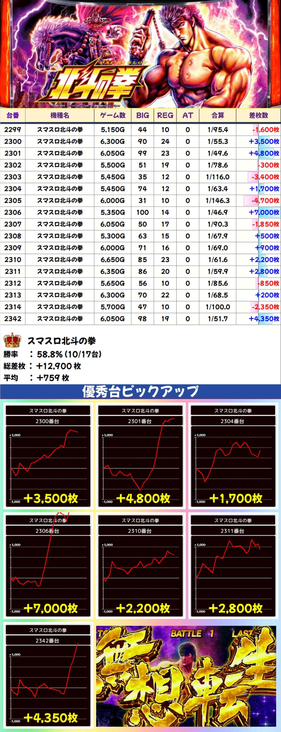 今回もスマスロ北斗にはしっかり仕掛けがあり、平均差枚は+759枚と好調。こちらは7に纏わる機種として必ずといって良いレベルで仕掛けがあるため、今後も積極的に狙っていきましょう。