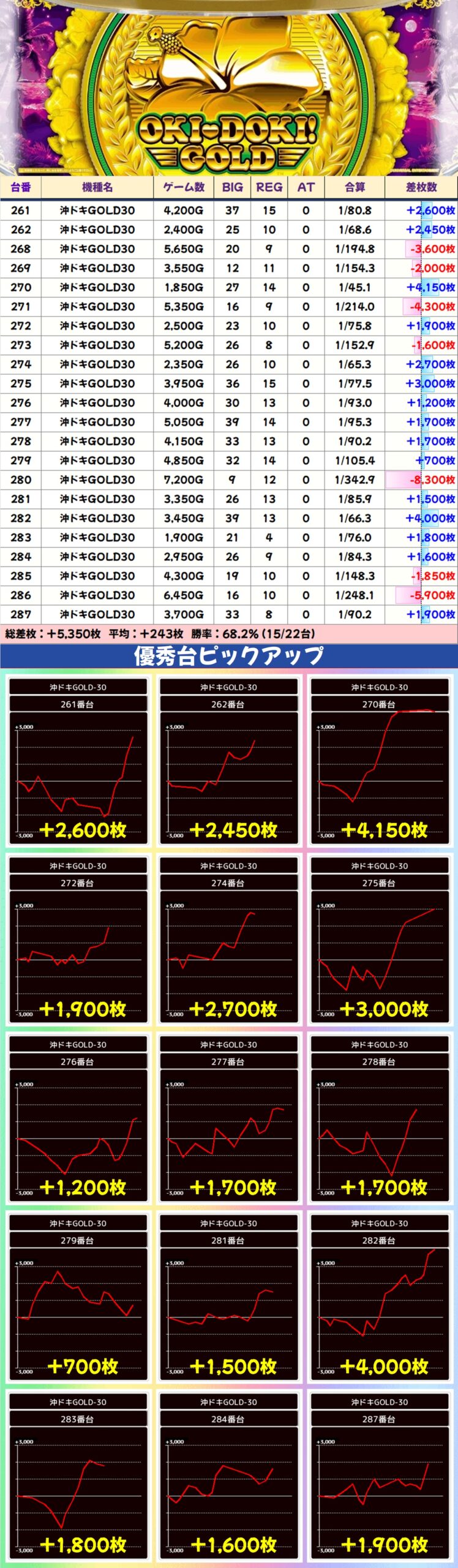 この日は総差枚+238,300枚、台平均+540枚という驚愕の結果。定番仕掛けだけでなく、様々なエリアから好調機種が多数出現し全体的に盛り上がっていました。全体勝率が50%を上回っていることからも、かなり多くのお宝が用意されていたことがお分かりいただけると思います。