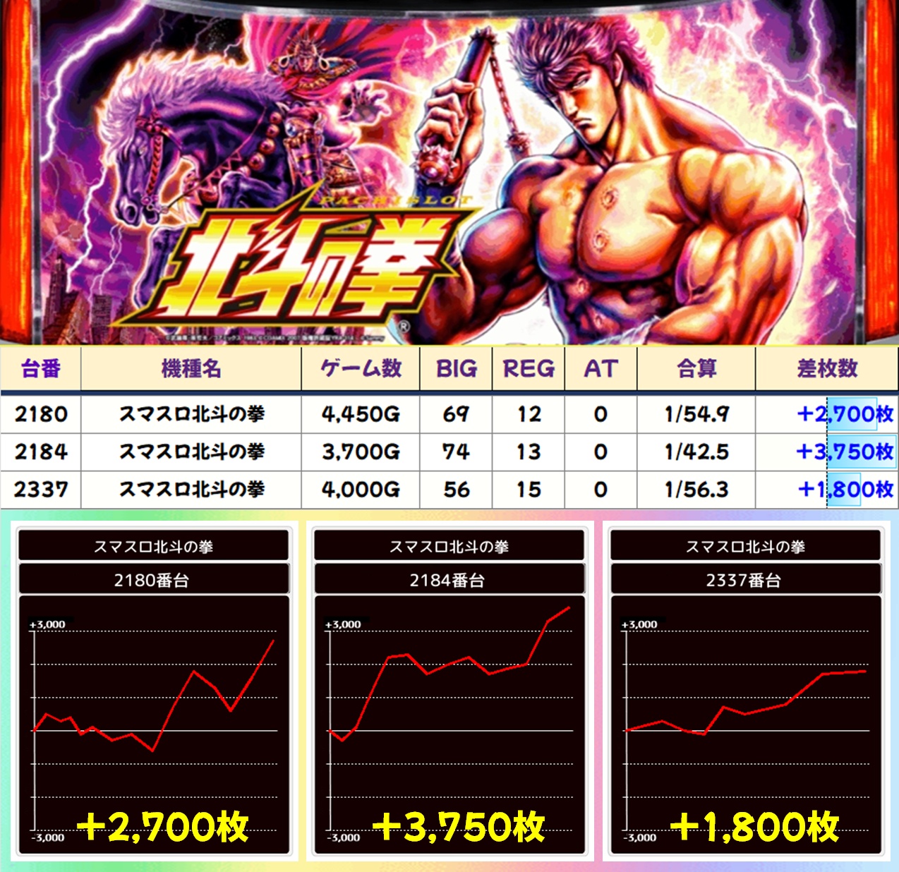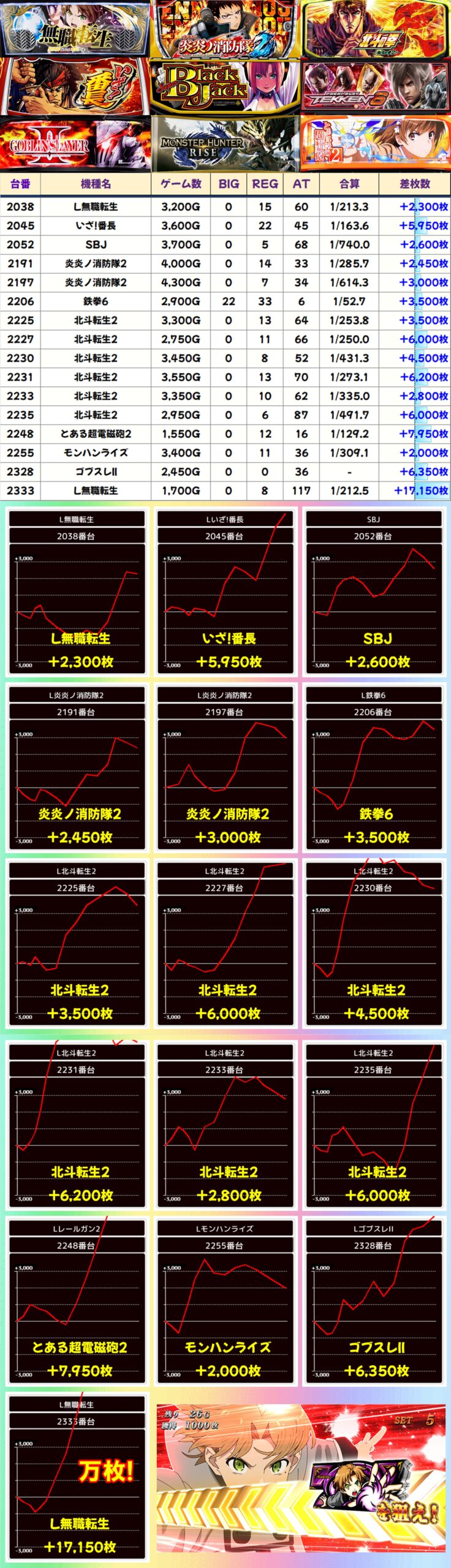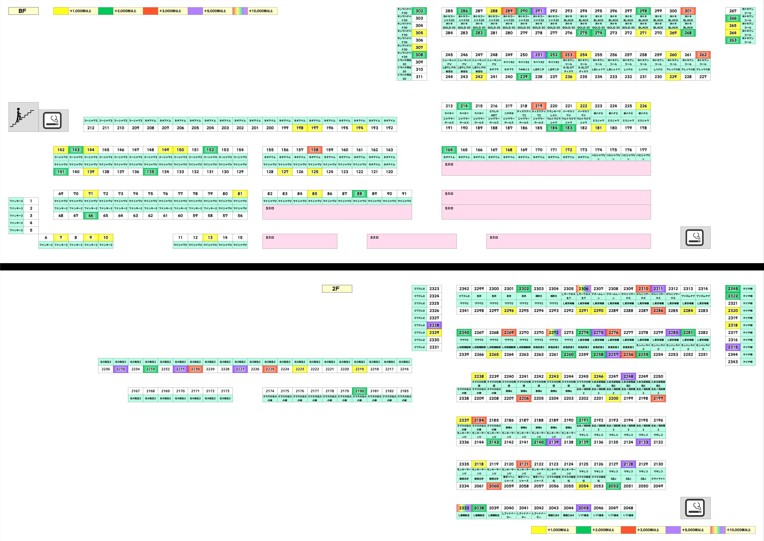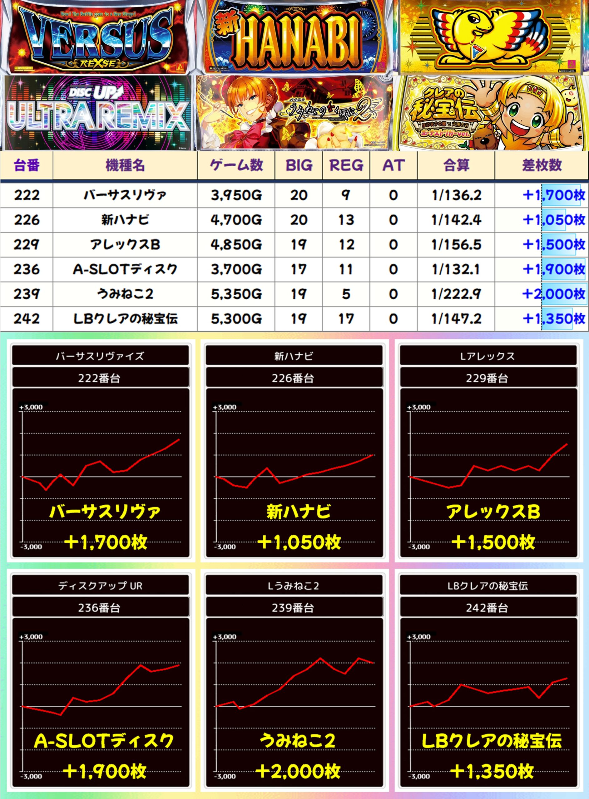 ほかにも北斗転生2をはじめ、数多くの機種に+2,000枚オーバーの優秀台を確認。無職転生にはコンプリート目前の爆裂台があったほか、新台の炎炎ノ消防隊2にも優秀台が複数あったりと、幅広くお宝が散りばめられていた様子が窺えます。