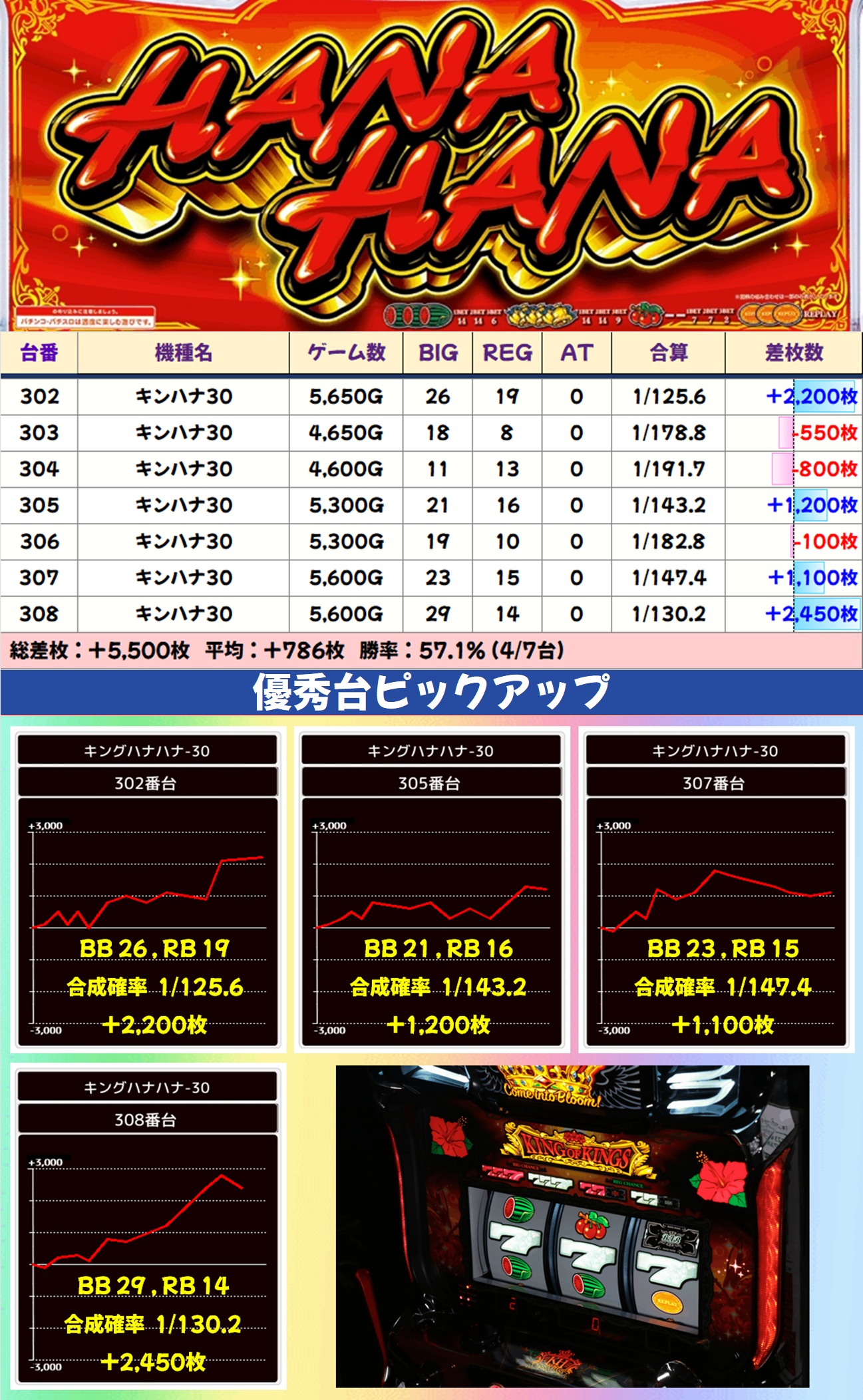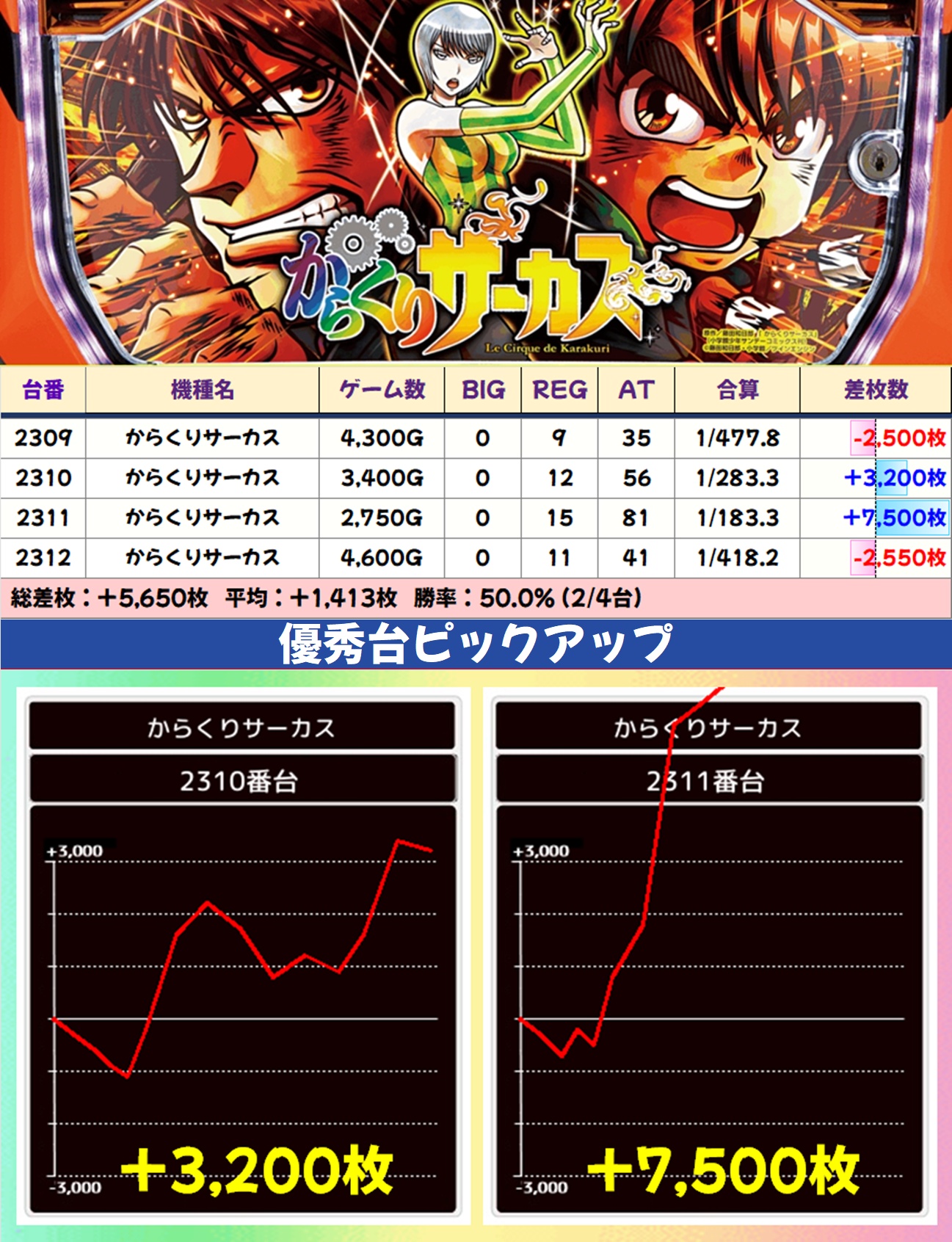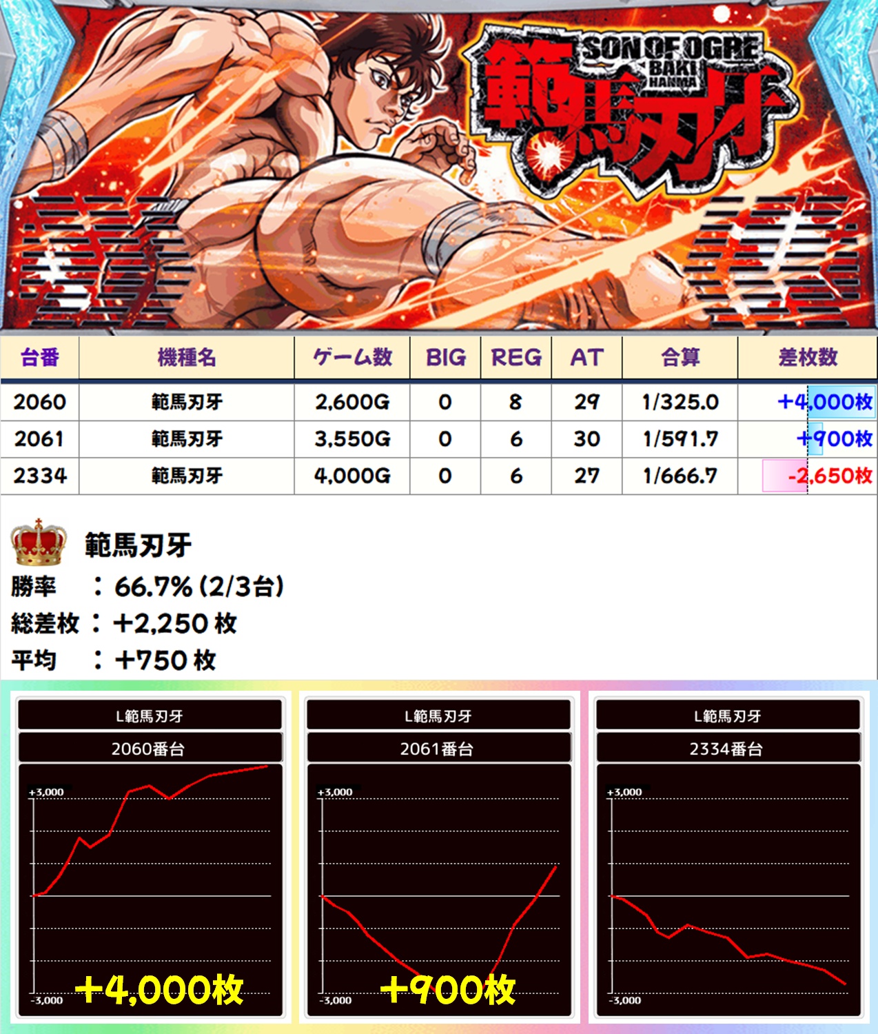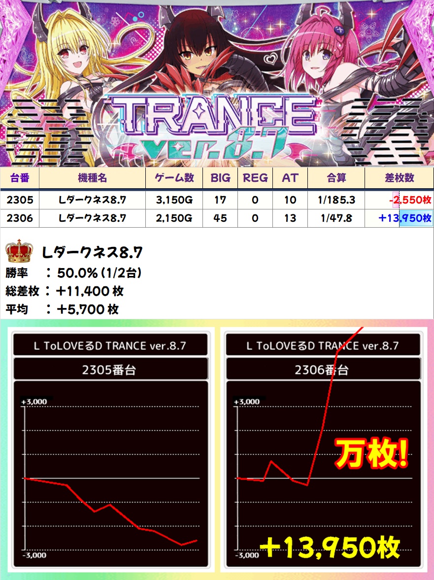 メインエリア以外ではLダークネス8.7・範馬刃牙が全台系濃厚となっており、前者からは万枚突破台が出現。吉宗・からくりサーカスも1/2系濃厚と思われる内容で、少台数機種からも好調機種が散見されました。新台も仕掛け対象になるケースが多いのは嬉しいですね!