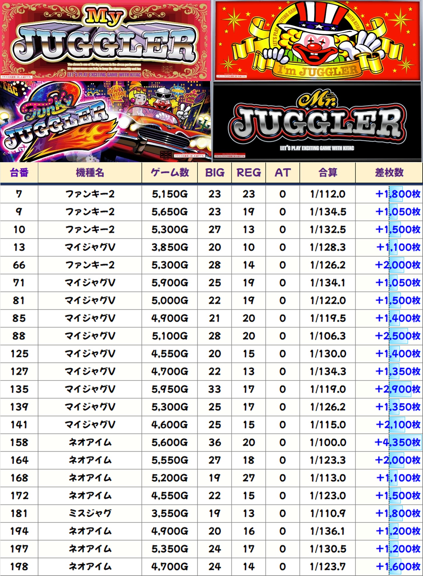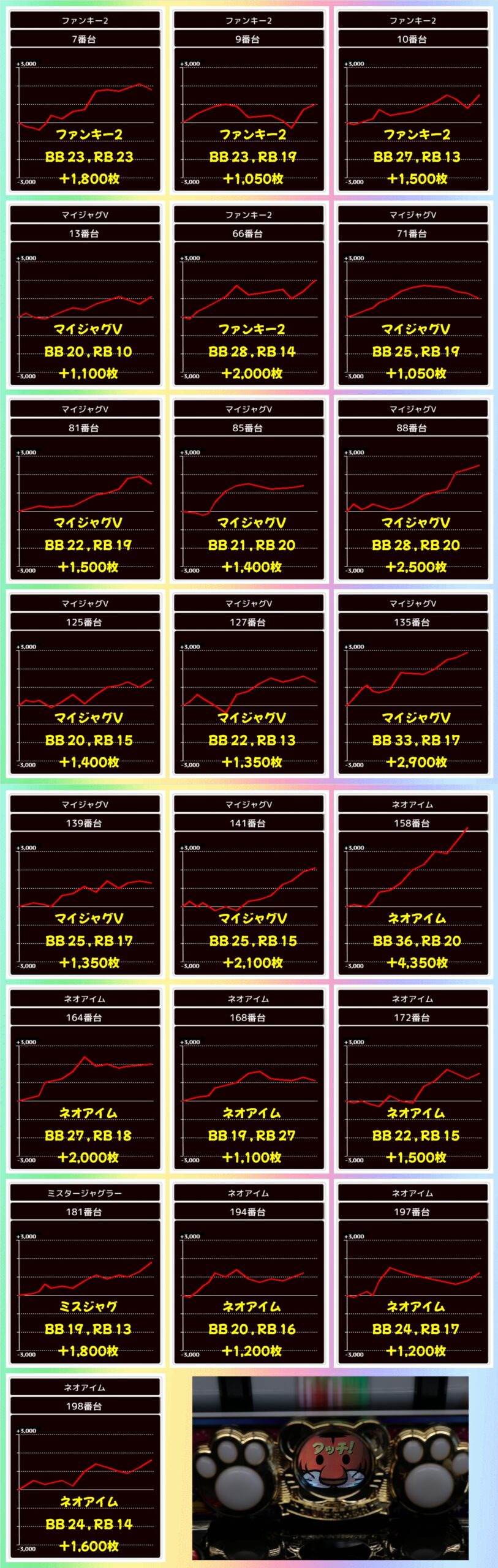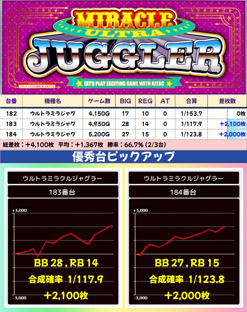今回はゴージャグ3・ウルトラミラジャグが高配分と思われる内容で、後者は3台中2台が+2,000枚オーバーと優秀。もちろんその他のシリーズからも+1,000枚オーバーの優秀台が散見され、全体的に賑わっていました。