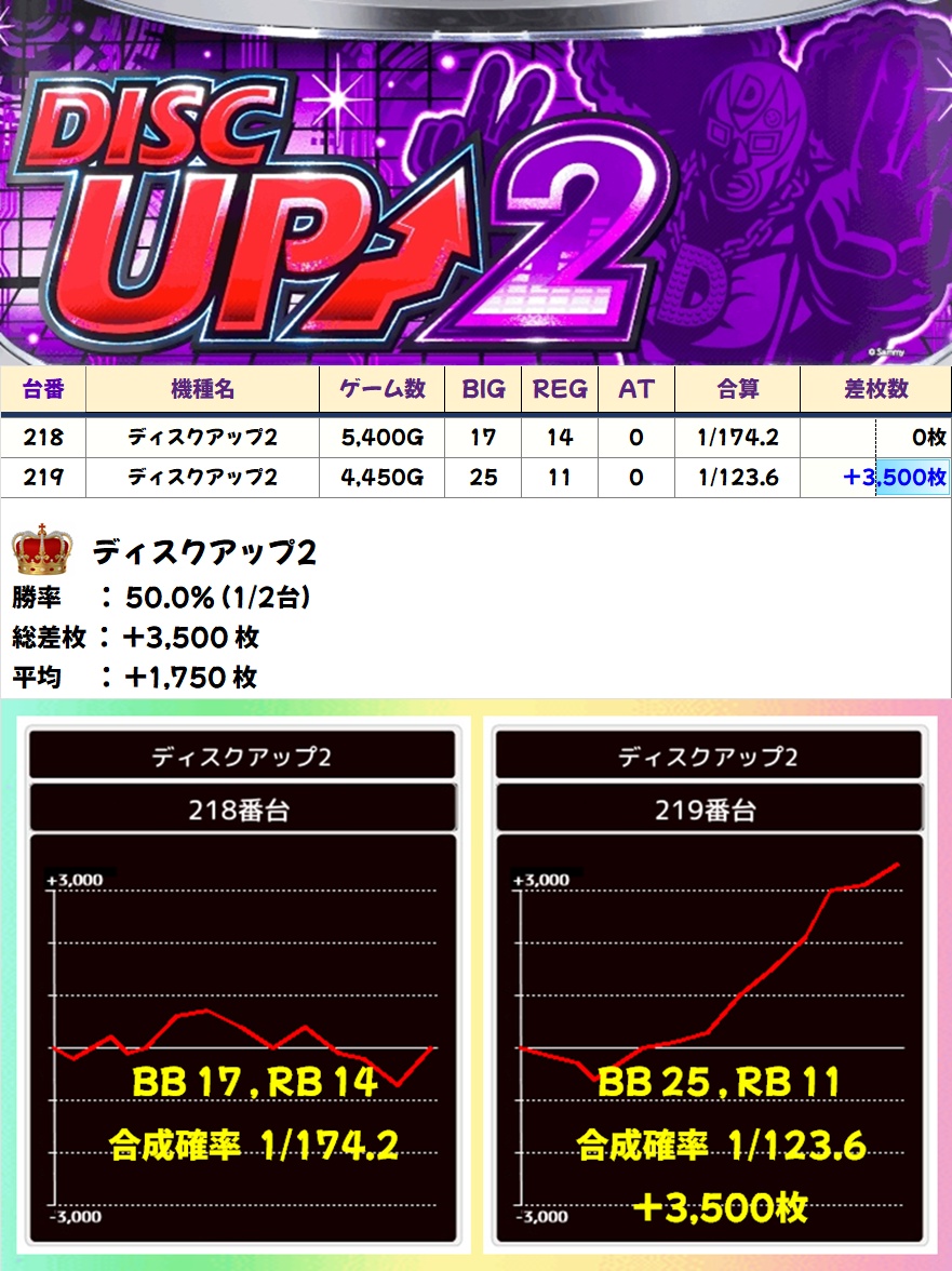 ノーマル・BT機コーナーも抜かりナシ。この日はディスクアップ2が全台系濃厚で、+3,000枚オーバー台を確認。ほかにも様々な機種で+1,000枚オーバー台が出現し、腰を据えて粘れる台も多数用意されていたようです。