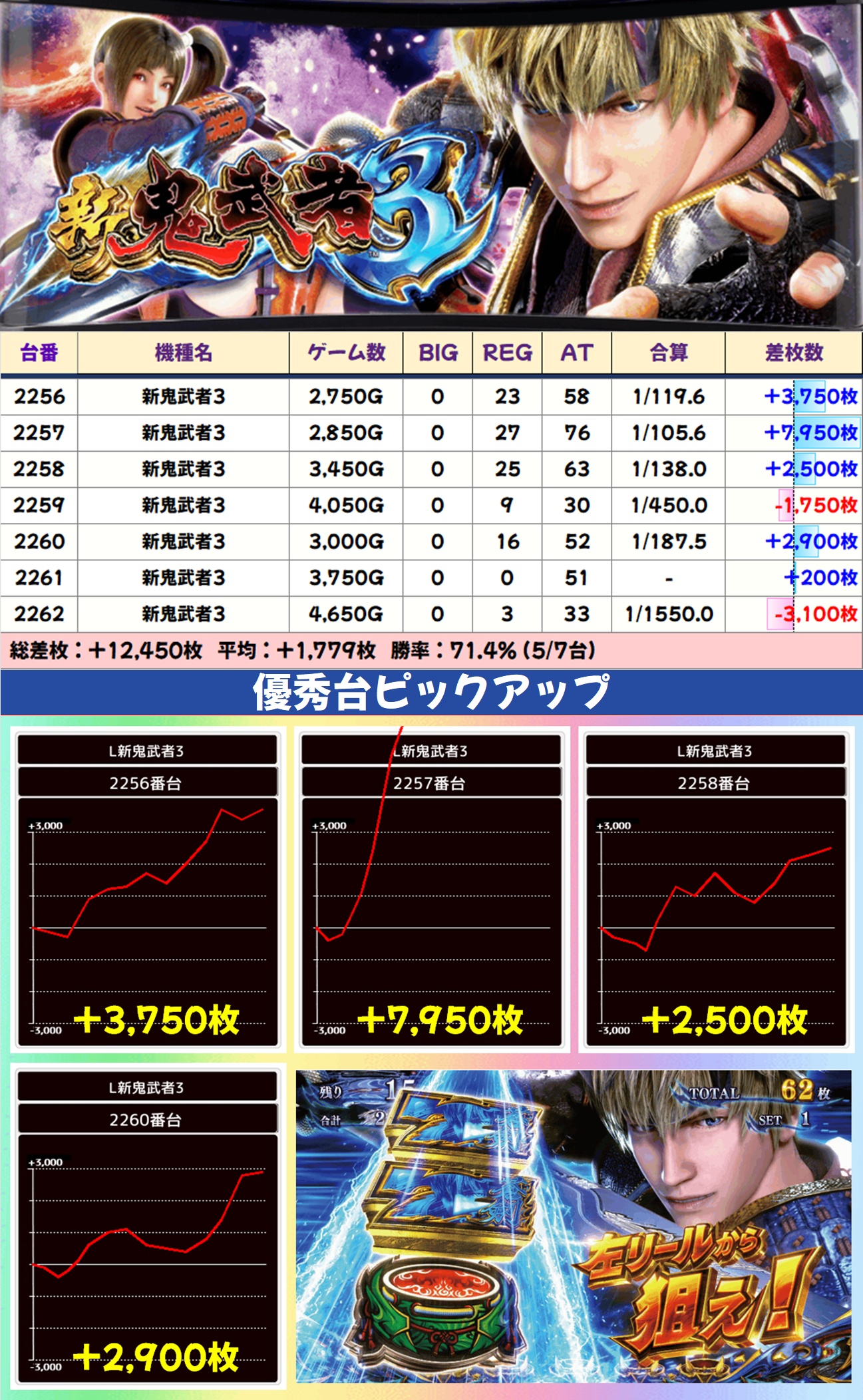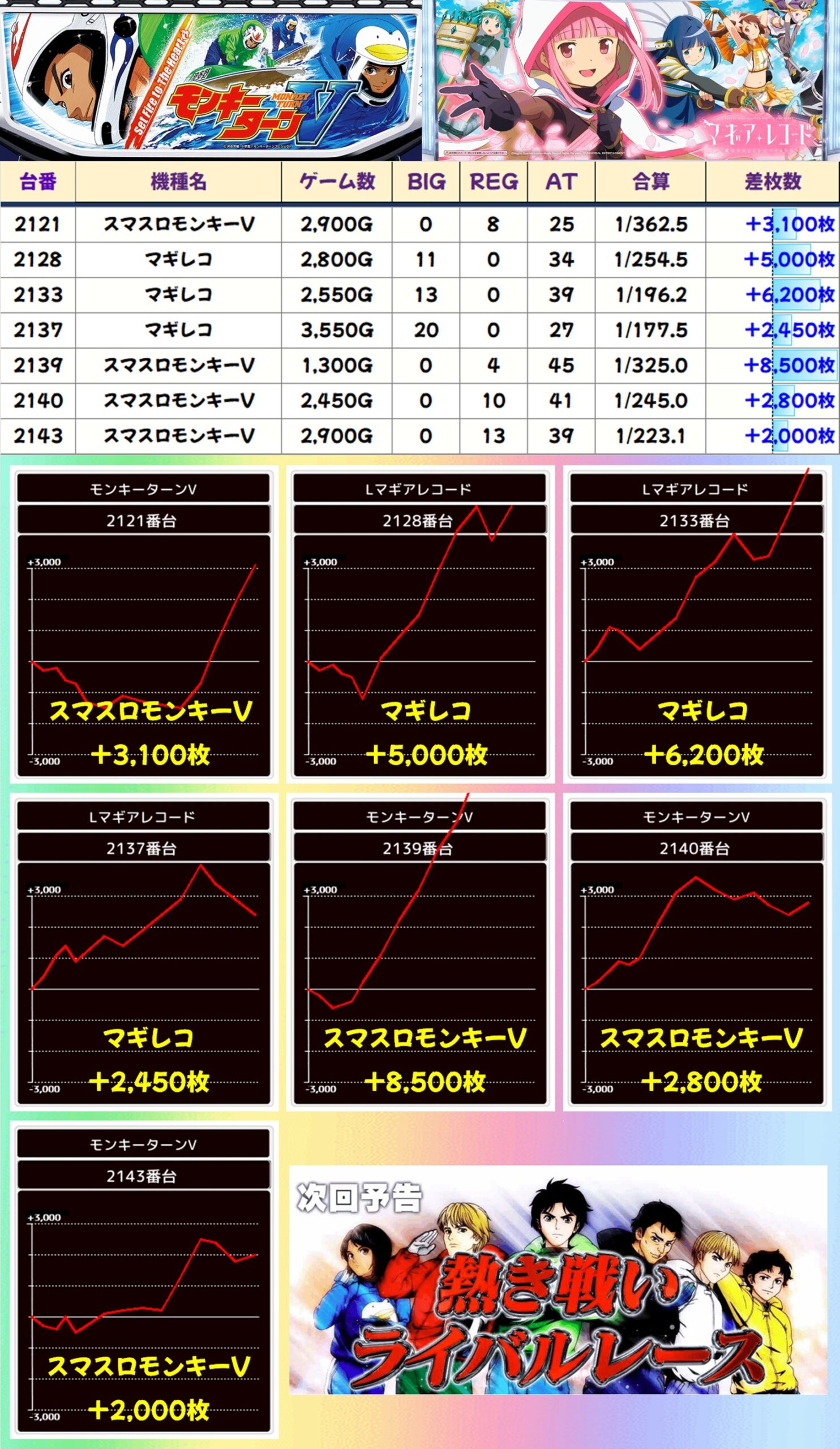 主力機も毎回注力されており、今回は新鬼武者3が1/2系濃厚で平均+1,779枚という好成績を記録。モンキーV・マギレコからも大量出玉が続出しており、それぞれに+5,000枚オーバー台があったりとしっかり狙える状況になっていました。