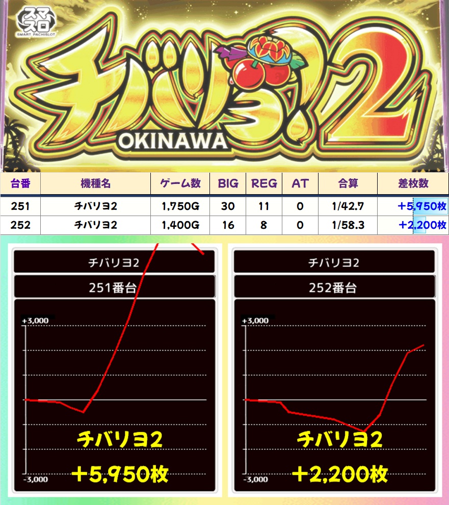 沖スロコーナーの仕掛けもかなり充実しており、沖ドキゴージャス・沖ドキBLACK・沖ドキアンコールが1/2系濃厚、沖ドキGOLD・キンハナが高配分以上と思われる状況。チバリヨ2にも優秀台が複数あったりと、全体的に高配分仕様になっていました。