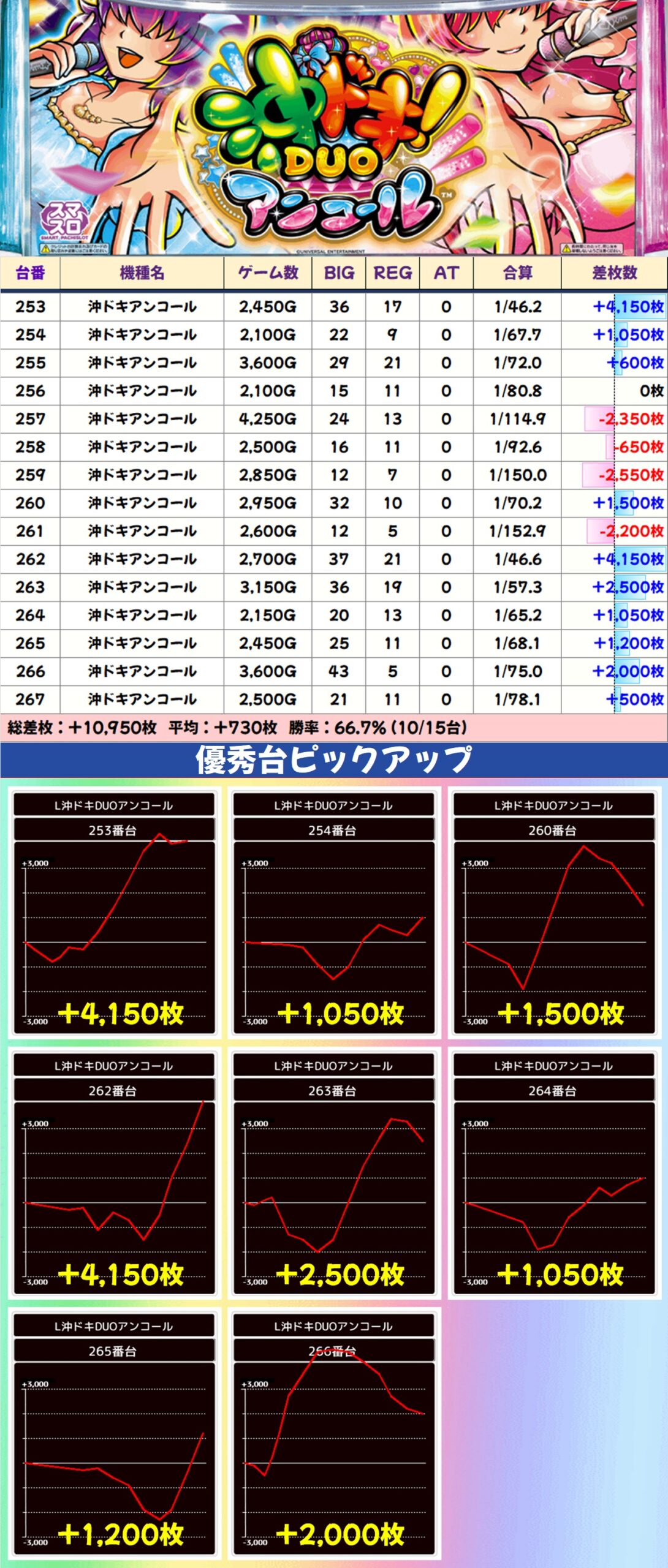 今回もジャグラーコーナーを中心に至るところから好調機種が出現し、総差枚は+3万枚オーバーとしっかりプラスに。全体の仕掛けが強化されているため、どのエリアでも勝負できるというのが魅力にもなっています。