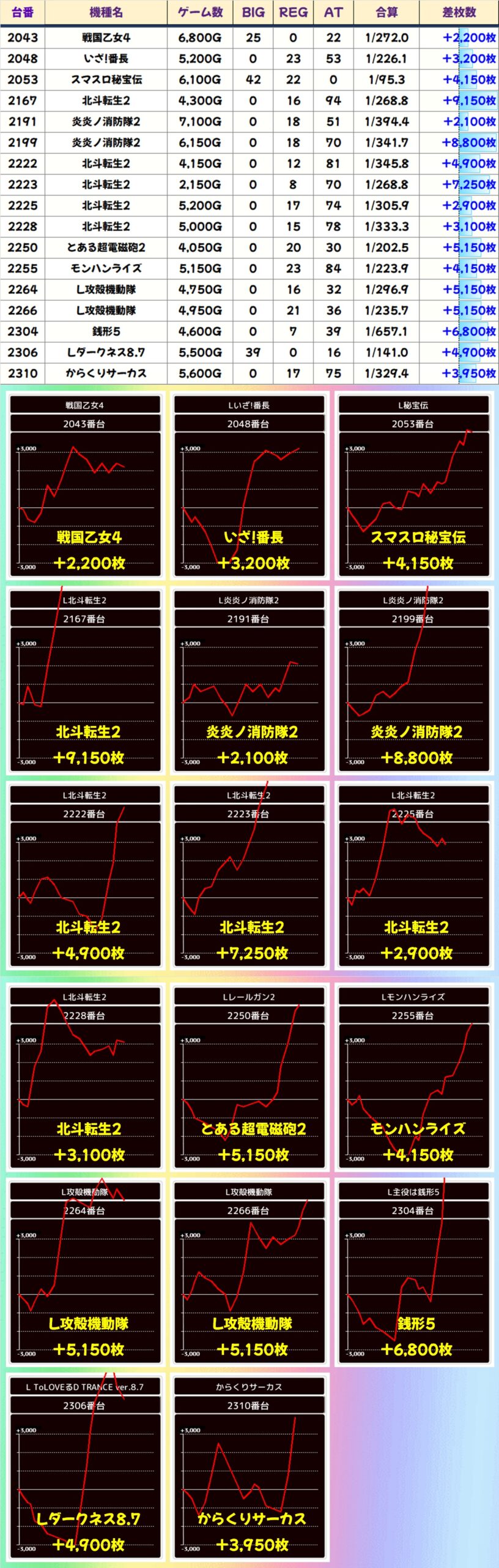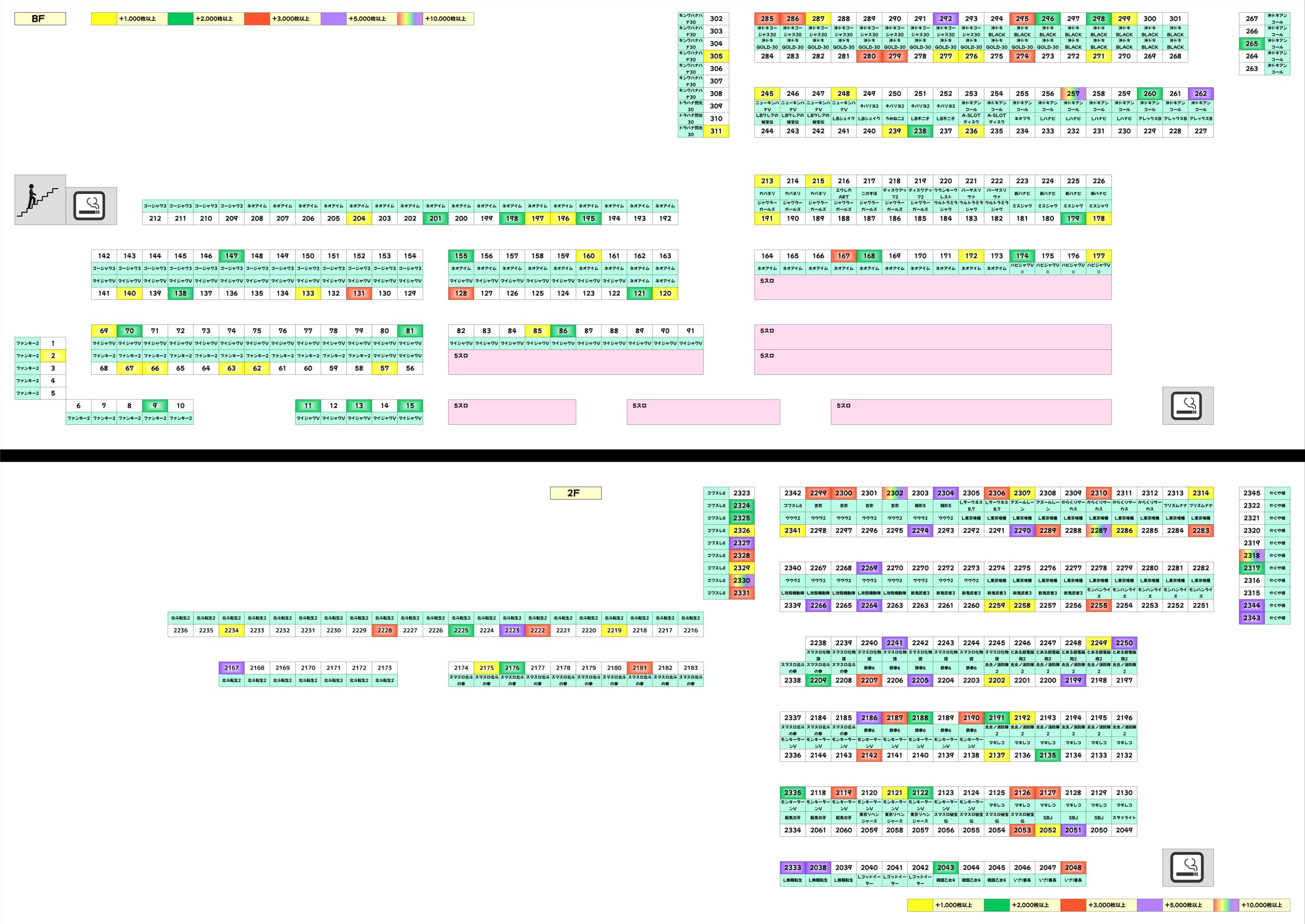 ほかにも様々な機種で単品の優秀台を確認。北斗転生2・炎炎ノ消防隊2・L攻殻機動隊には+2,000枚オーバー台が複数あり、なかには+5,000枚オーバー台もあったりと、新しめの機種も注力されている傾向が見受けられました。