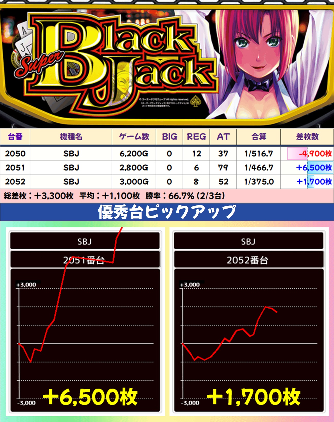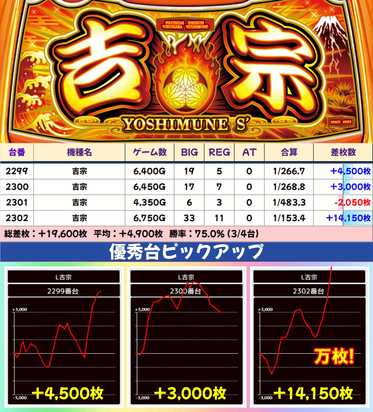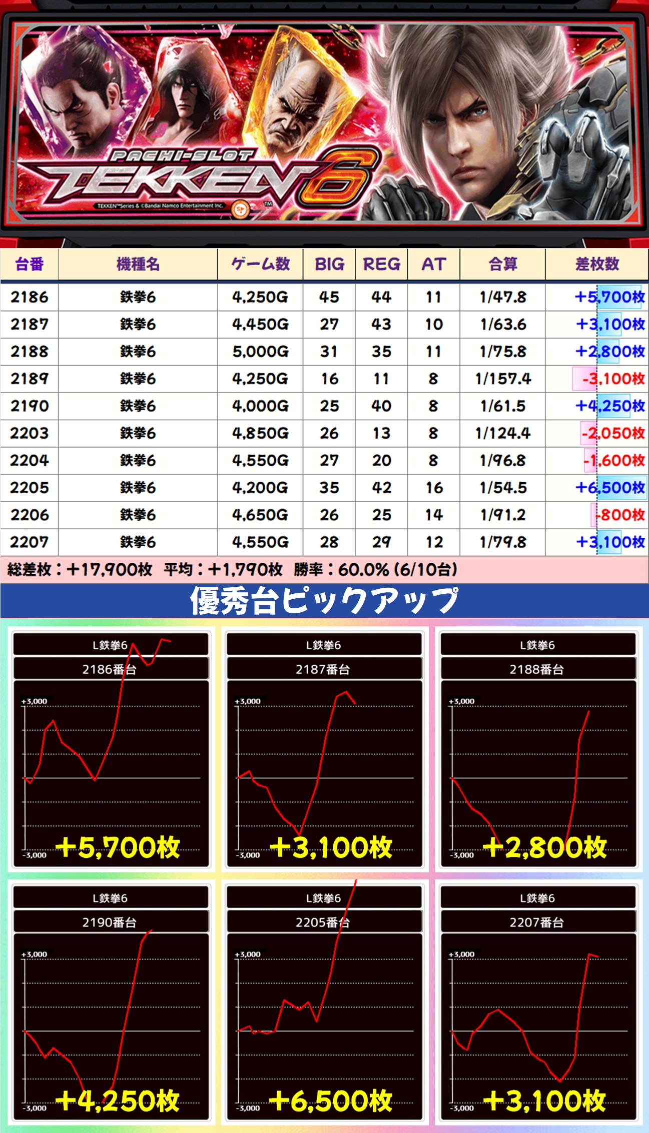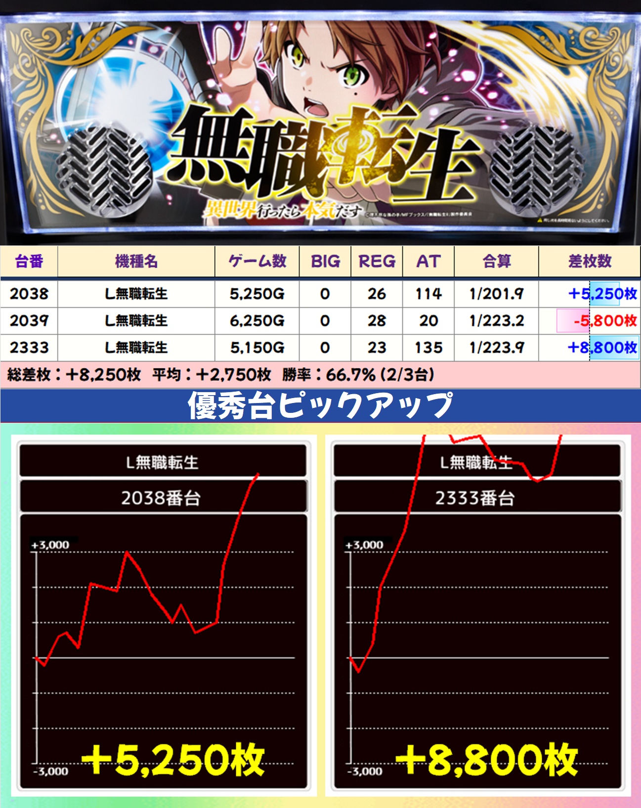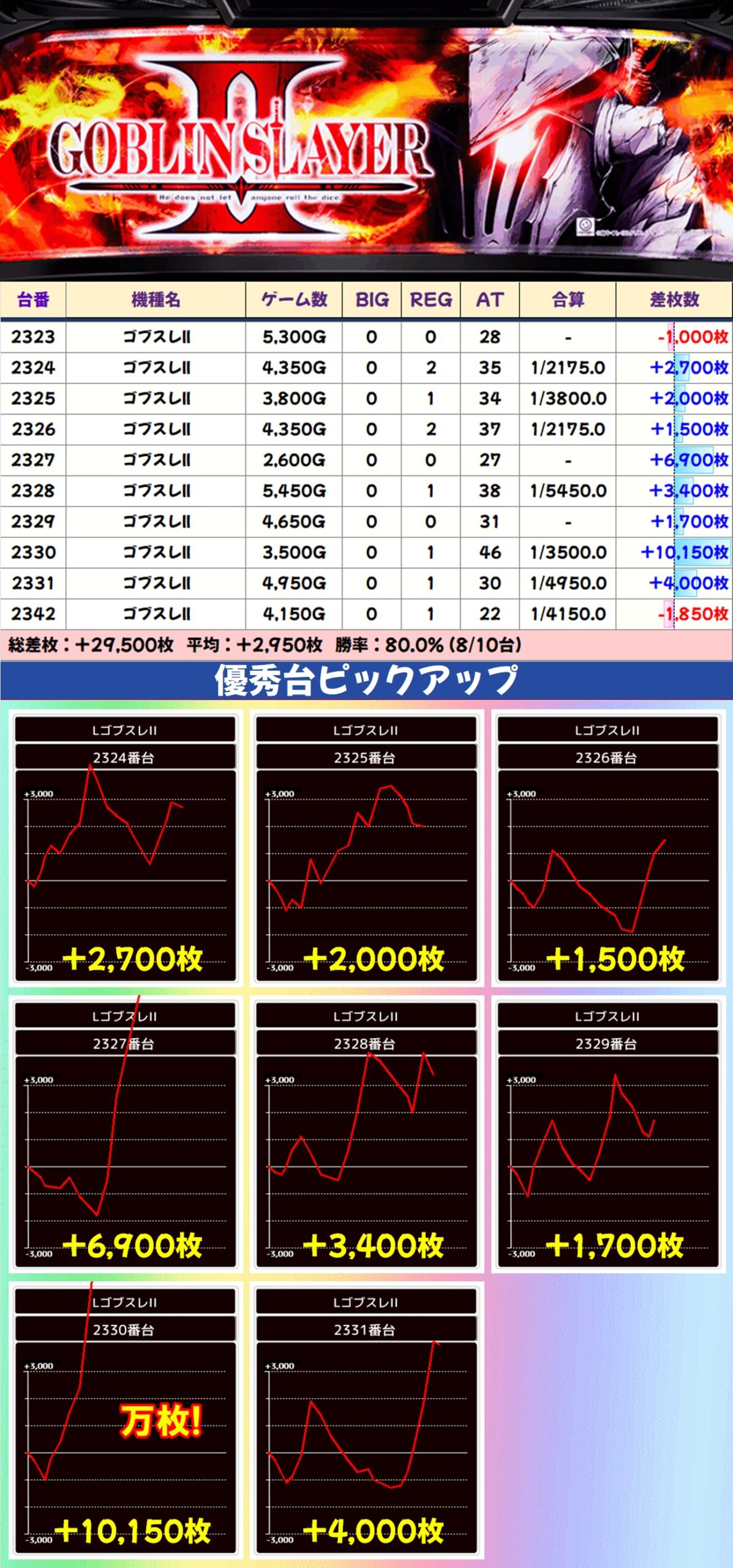 その他のエリアでは鉄拳6・ゴブスレⅡ・吉宗・L無職転生・SBJが1/2系濃厚と思われる結果で、いずれも平均差枚は大幅なプラスに。ゴブスレⅡ・吉宗からは万枚突破台も出現し、ほかにも数多くの爆裂台が確認できました。