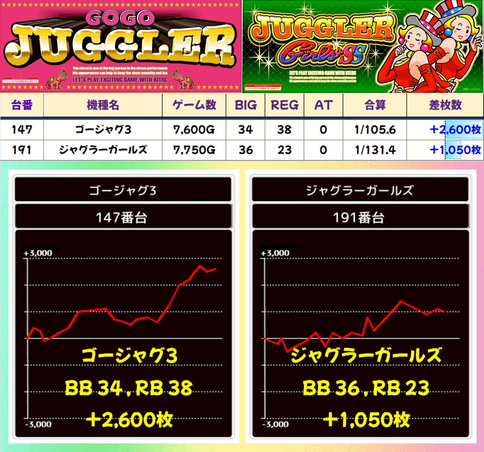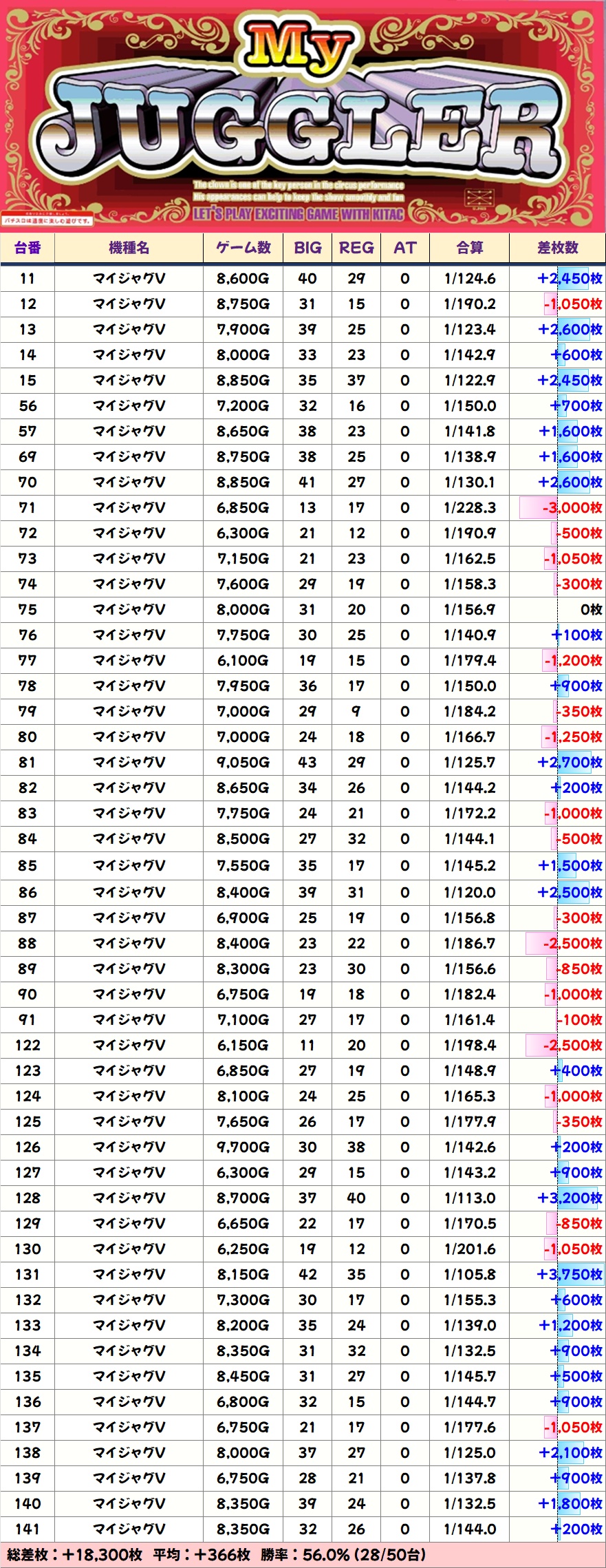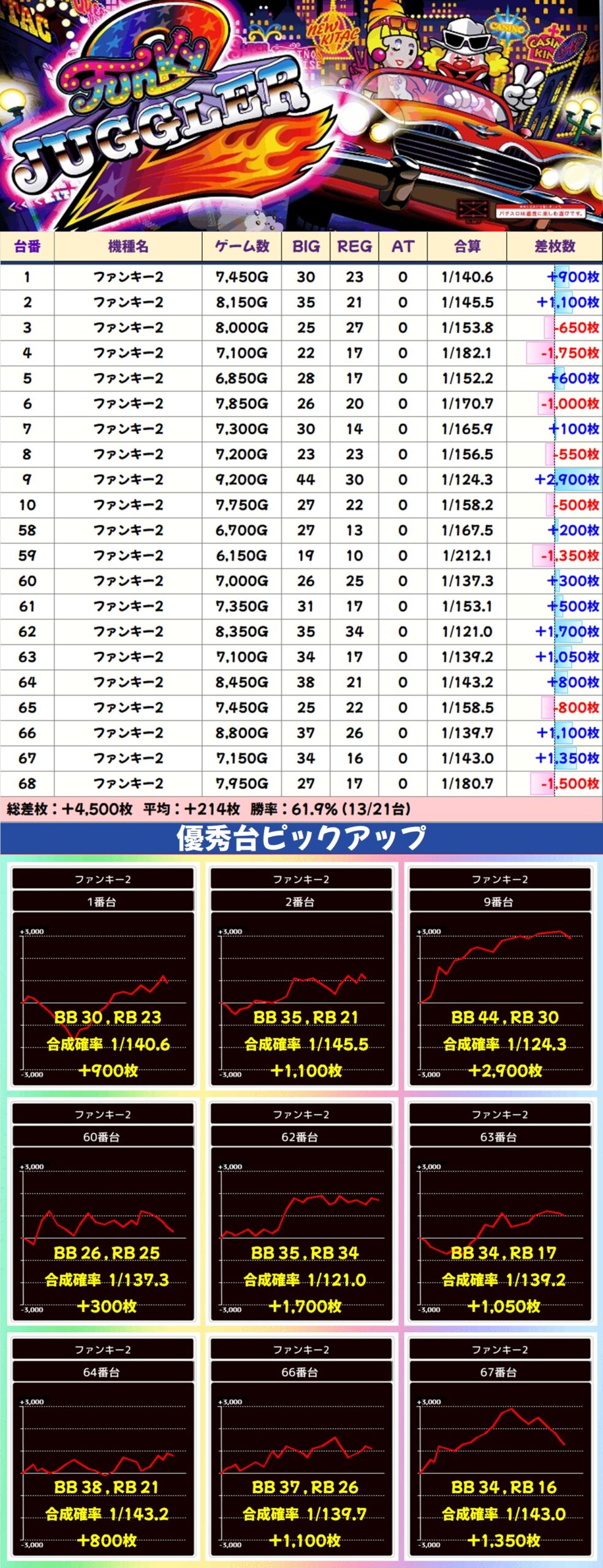 ジャグラーシリーズは少台数のハピジャグ・ミスジャグが1/2系濃厚となっており、前者は平均+1,400枚という好成績に。多台数のマイジャグV・ネオアイム・ファンキー2も高配分と思われる結果で、+1,000枚オーバーの合算良好台が散見されました。