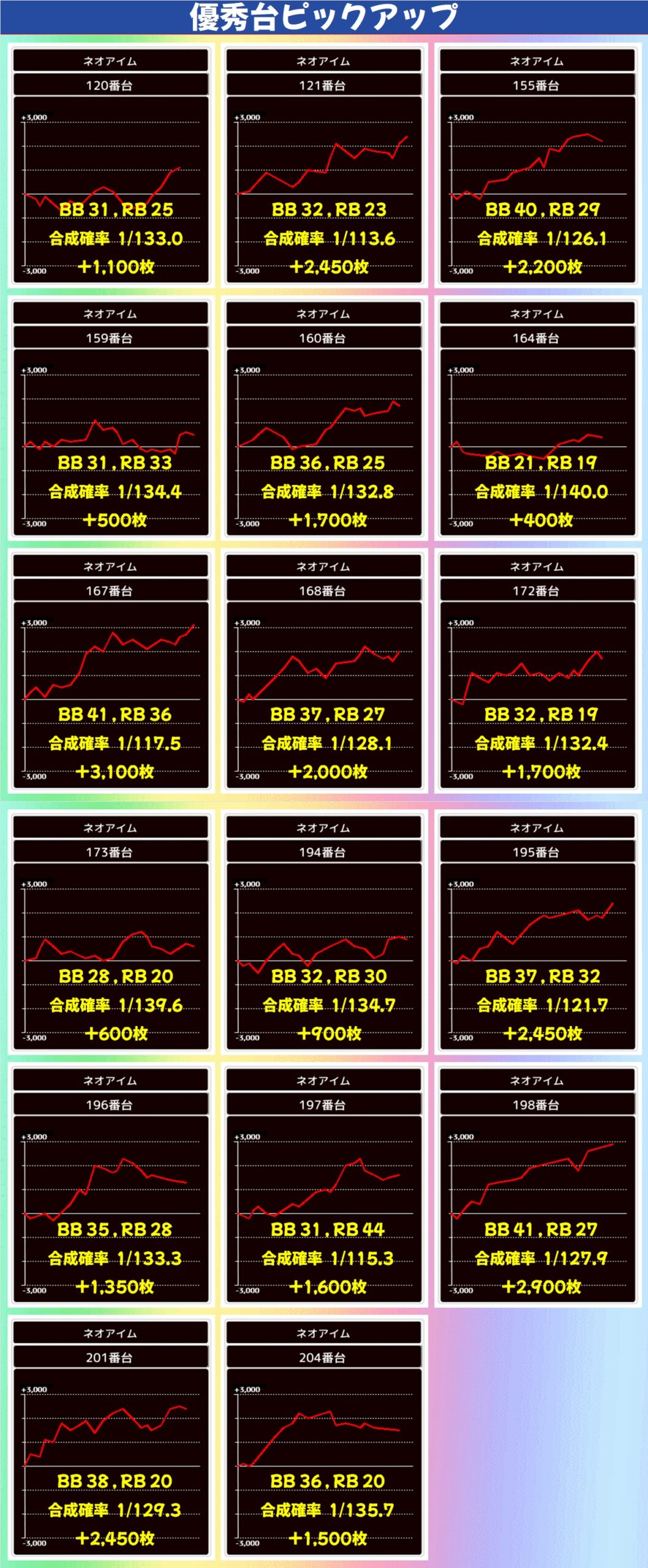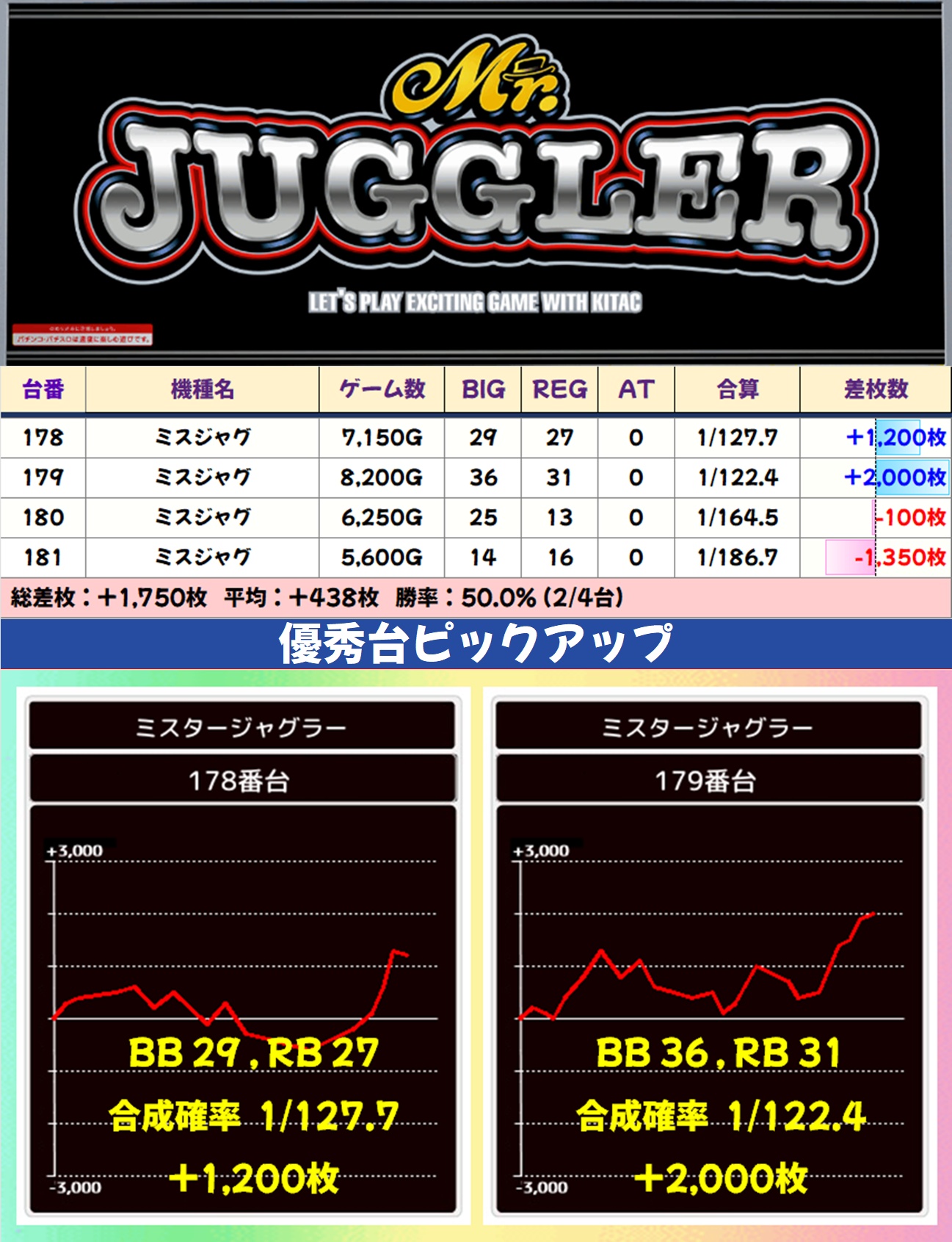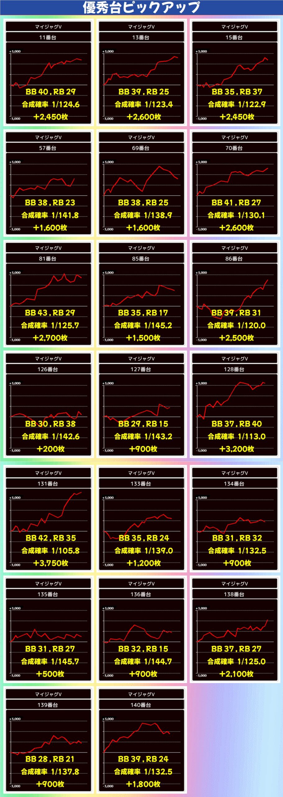 ジャグラーシリーズは少台数のハピジャグ・ミスジャグが1/2系濃厚となっており、前者は平均+1,400枚という好成績に。多台数のマイジャグV・ネオアイム・ファンキー2も高配分と思われる結果で、+1,000枚オーバーの合算良好台が散見されました。