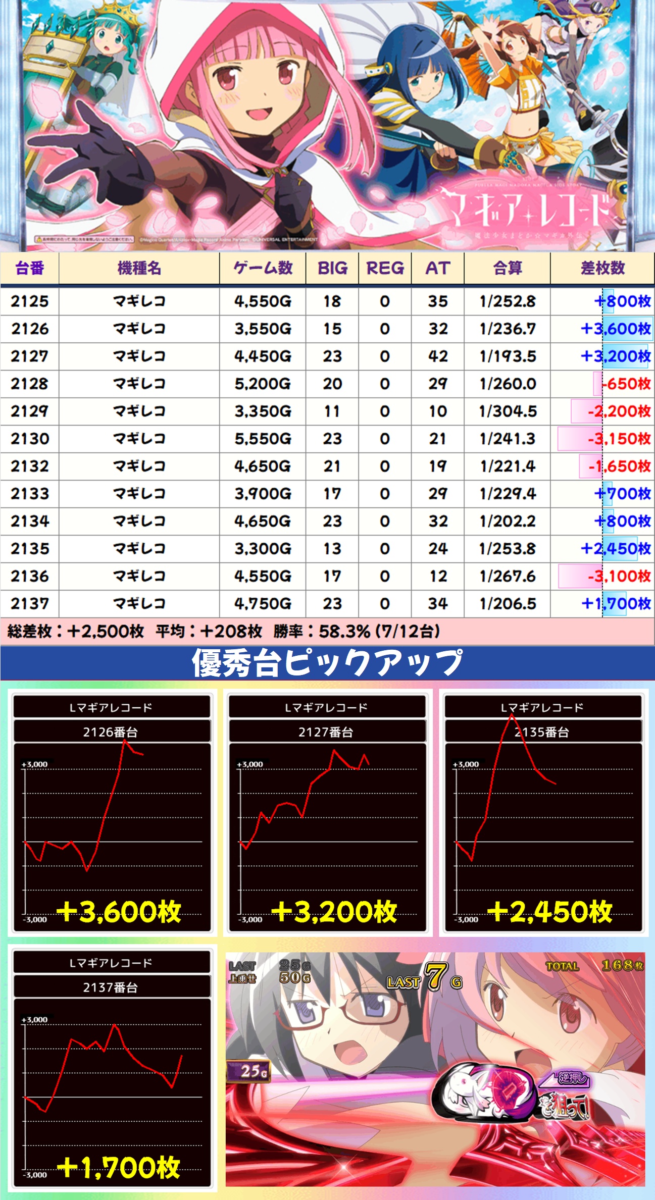 主力機はマギレコが12台中7台プラスと好調。大幅なプラスとはなりませんでしたが、+2,000枚オーバーが3台あり、2台が+3,000枚オーバーを記録しました。