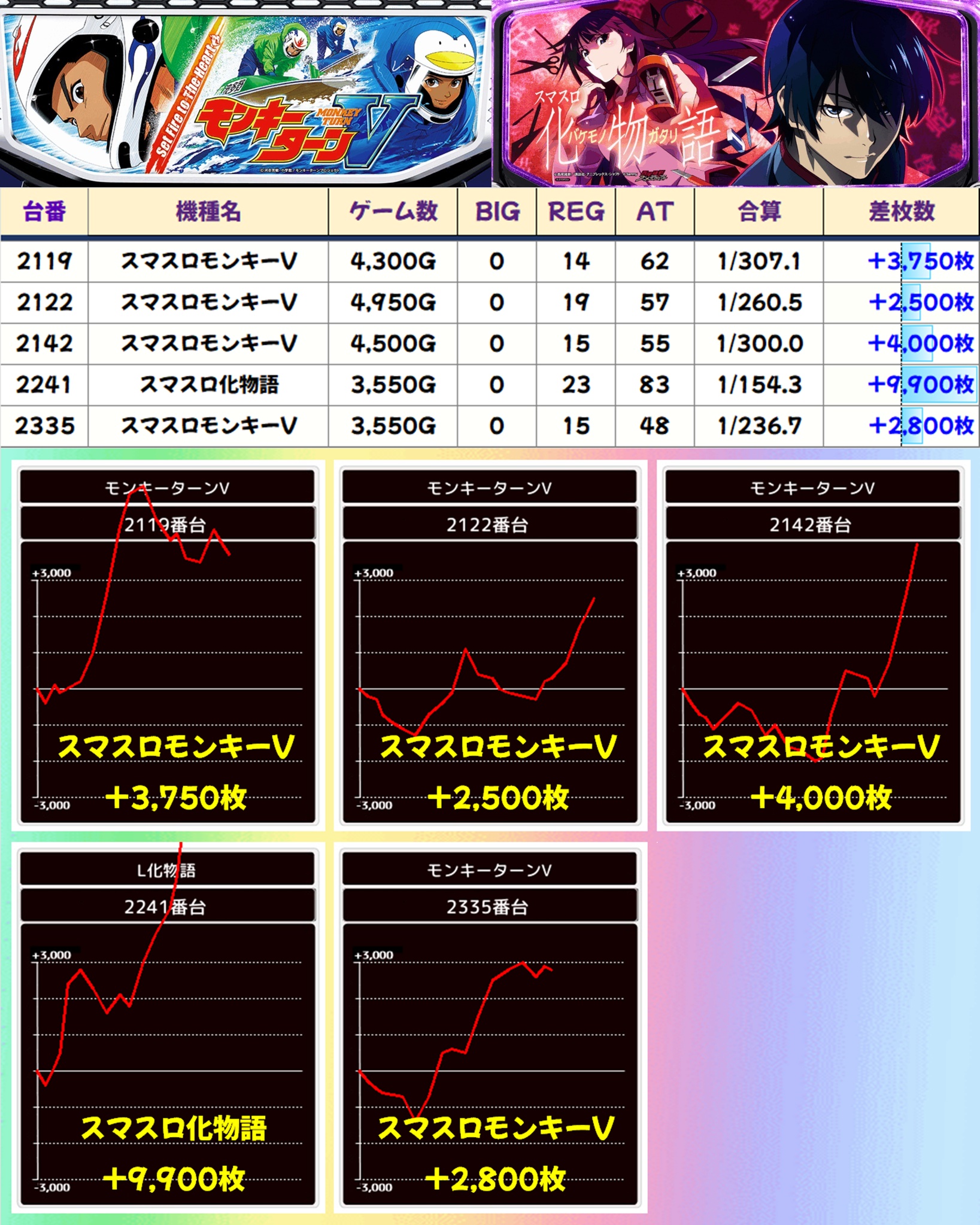 主力機からは単品の優秀台も続出。モンキーVは4台が+2,000枚オーバー、化物語には+9,900枚の爆裂台があったりと、随所で盛り上がりをみせました。
