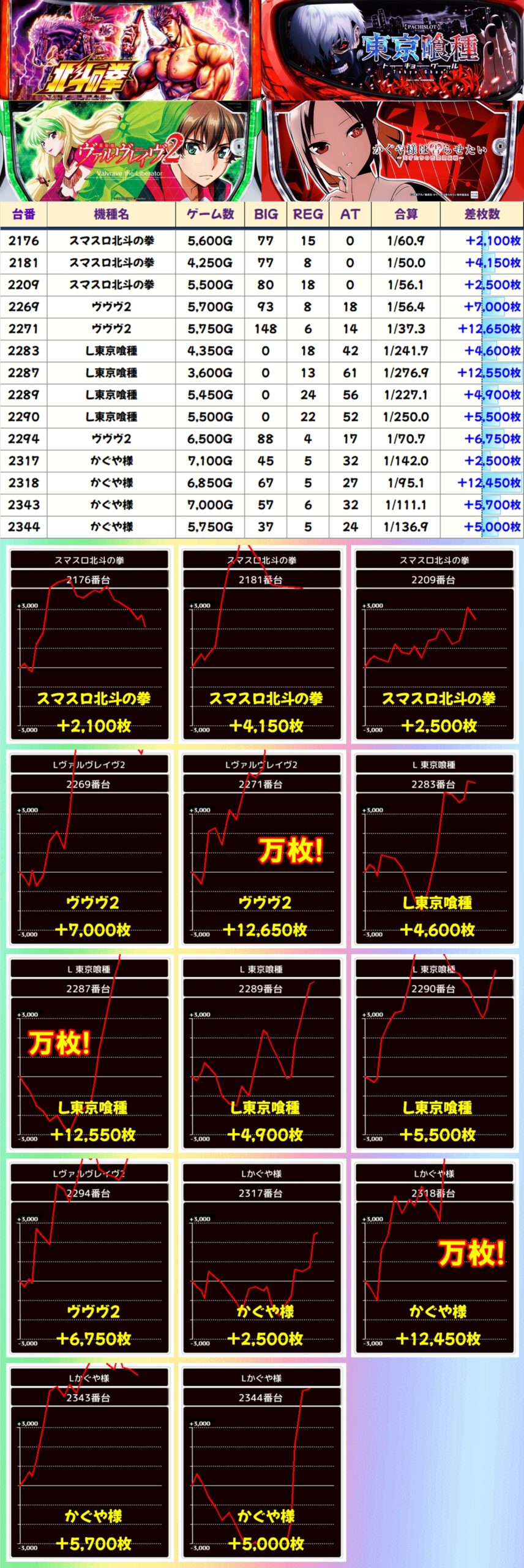 毎日オススメ機種は各機種に大量出玉の優秀台を複数確認。東京喰種・ヴヴヴ2・かぐや様からは万枚突破台も出現しており、多くのお宝が投入されている様子が窺えました。