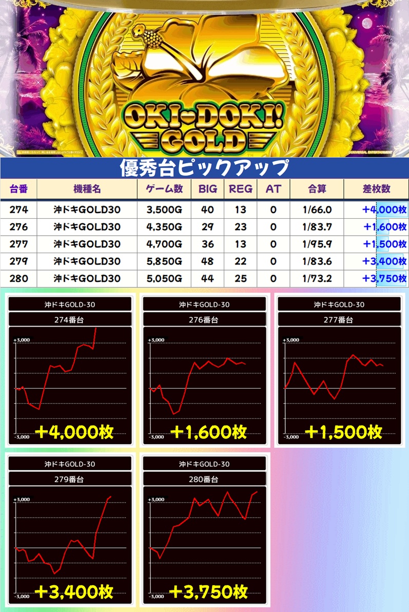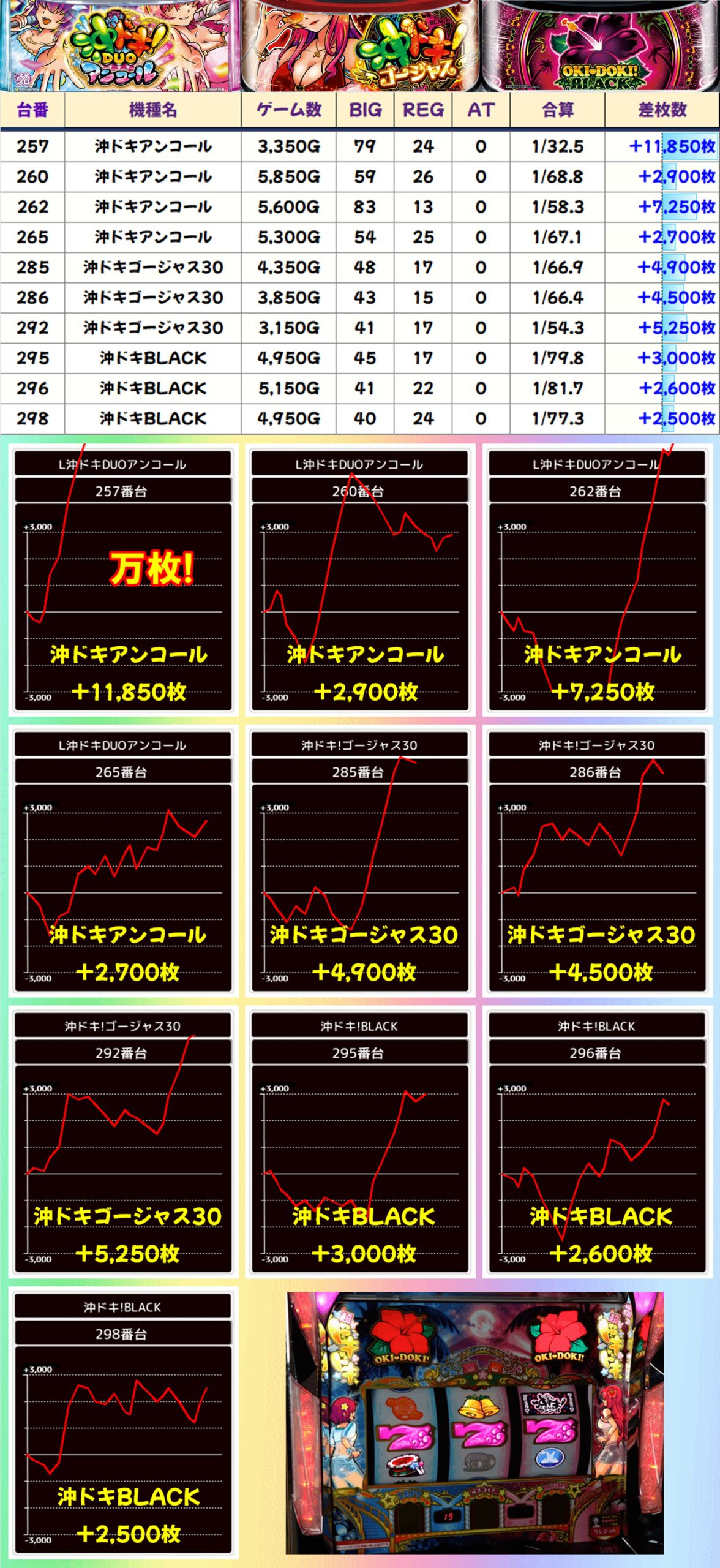 今回の沖スロは沖ドキ系から優秀台が続出。沖ドキGOLDは高配分以上濃厚となっており、3台が+3,000枚オーバーをお持ち帰り。その他シリーズからも大量出玉の優秀台が散見され、沖ドキアンコールからは万枚突破台も出現しました。