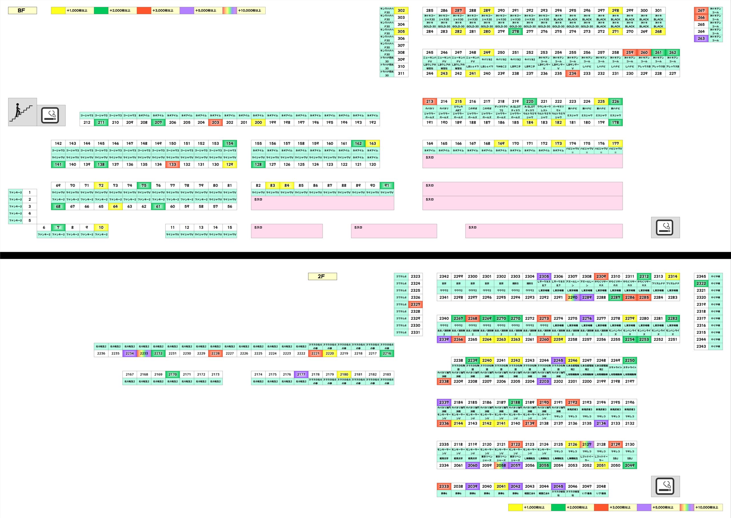 今回も全エリアに満遍なく仕掛けが盛り込まれ、高配分以上の優秀機種が多数出現。単品も幅広く散りばめられており、至るところで優秀台が散見されました。メインどころの仕掛けが充実しているだけでなく、ノーマル系や少台数機種にもしっかり仕掛けがあり、全体的にチャンスがあるようになっていたと思います。