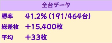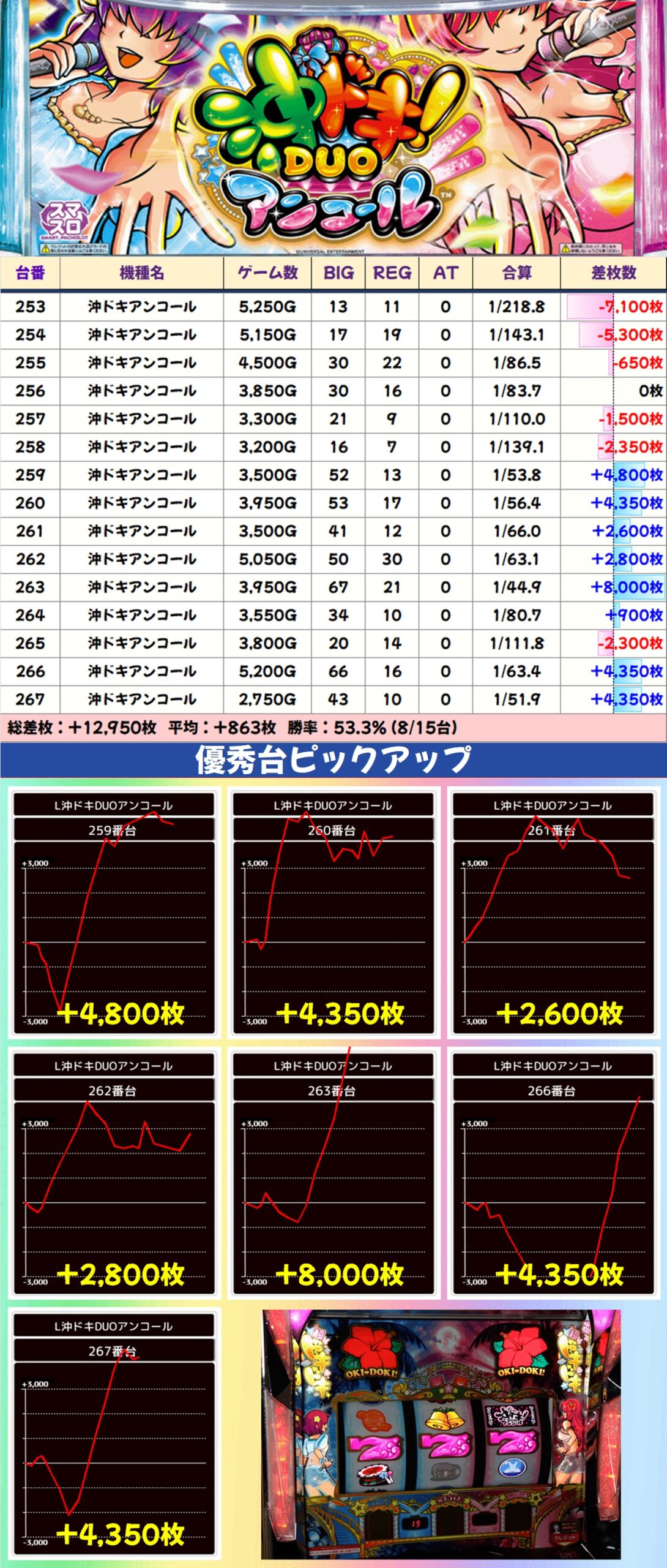 沖スロは沖ドキアンコールが高配分と思われる結果で、5台が+4,000枚オーバーを記録。ほかにも沖ドキGOLDに約+3,000枚・沖ドキゴージャスに約+4,000枚の優秀台が確認できました。これまでに比べ仕掛け量が少ない印象ですが、今回が不発だっただけでまだまだ隠れたお宝が多数あった可能性が高いです。