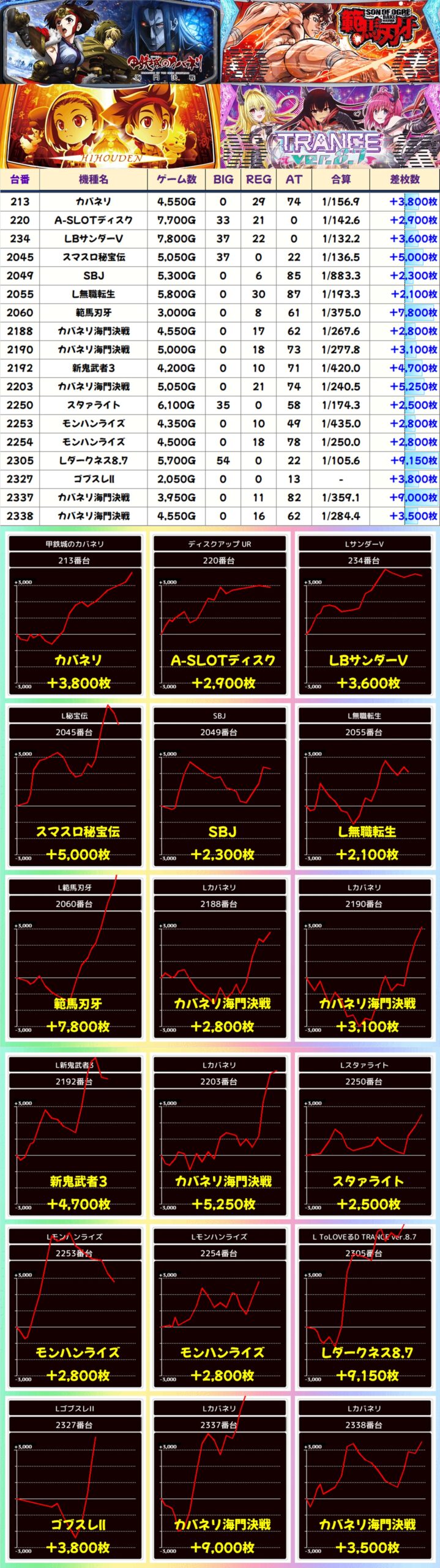 上記でまとめた仕掛け箇所以外にもまだまだ単品の優秀台を多数確認。なかでも最新台のカバネリ海門決戦には大量出玉の優秀台が複数あり、+5,000枚台、+8,000枚台の爆裂台も。新しめの機種も注力されている傾向があるので、安心して狙えます。