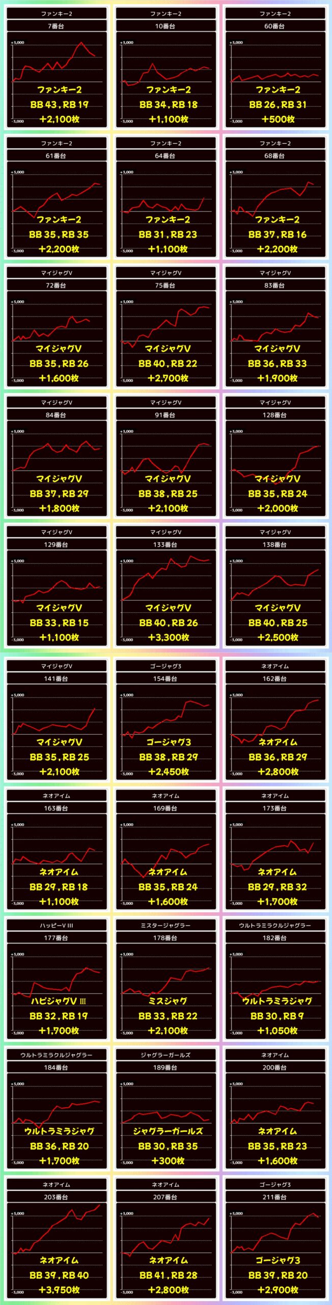 ジャグラーコーナーからも優秀台が続出。なかでも多台数のマイジャグV・ネオアイム・ファンキー2は合算良好台が多く見受けられました。こちらは毎回お宝が多めに投入されているだけでなく、列や並びといった塊仕掛けも頻発しているので、好調台付近に空き台があれば狙い目になるかもしれません。