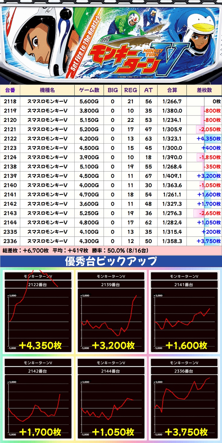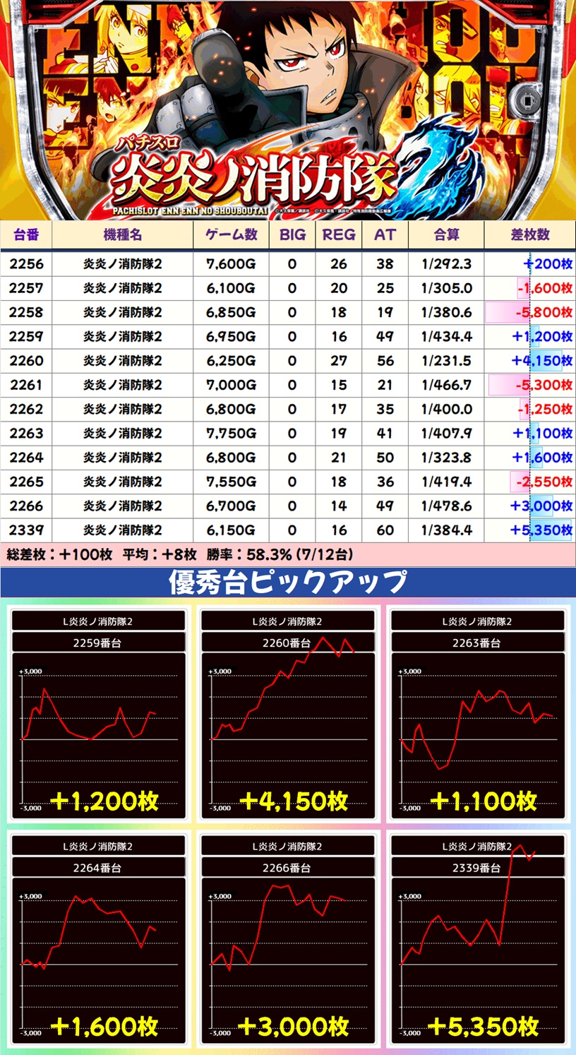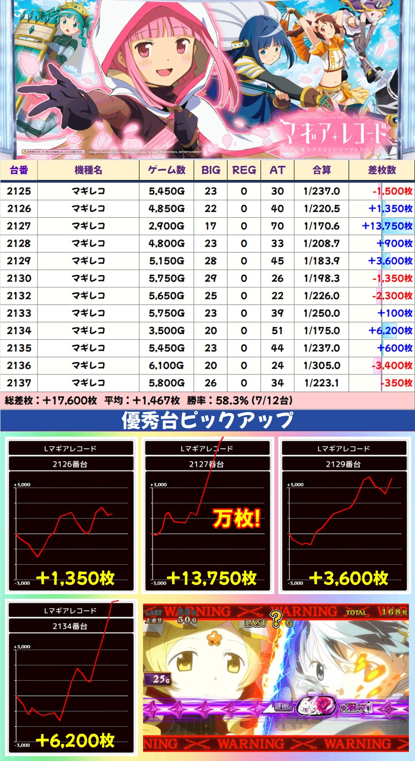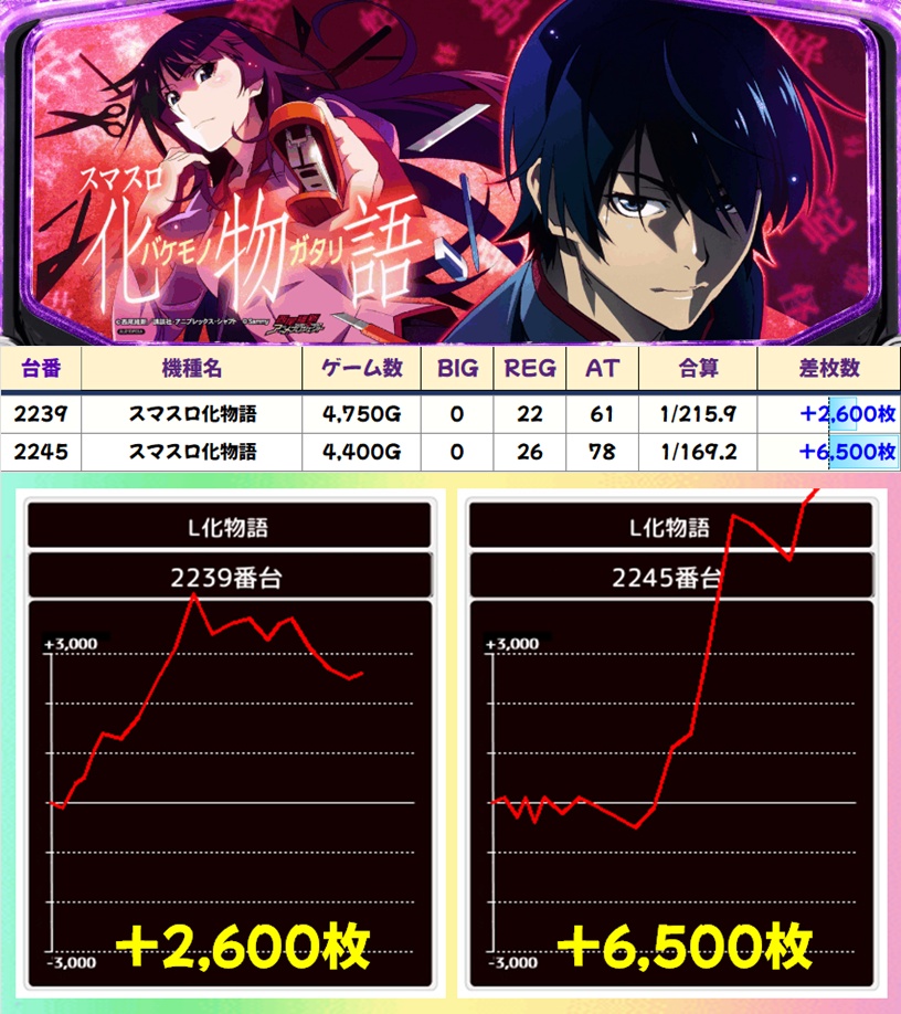 主力機もモンキーV・マギレコ・炎炎ノ消防隊2の3機種が高配分以上濃厚。なかでもマギレコは万枚突破台が出現たこともあり、平均+1,467枚と特に優秀でした。化物語にも優秀台が複数あったりと、主力機も全体的にお宝満載の状況。こちらは必ず仕掛けが用意されているので、積極的に狙っていきましょう。
