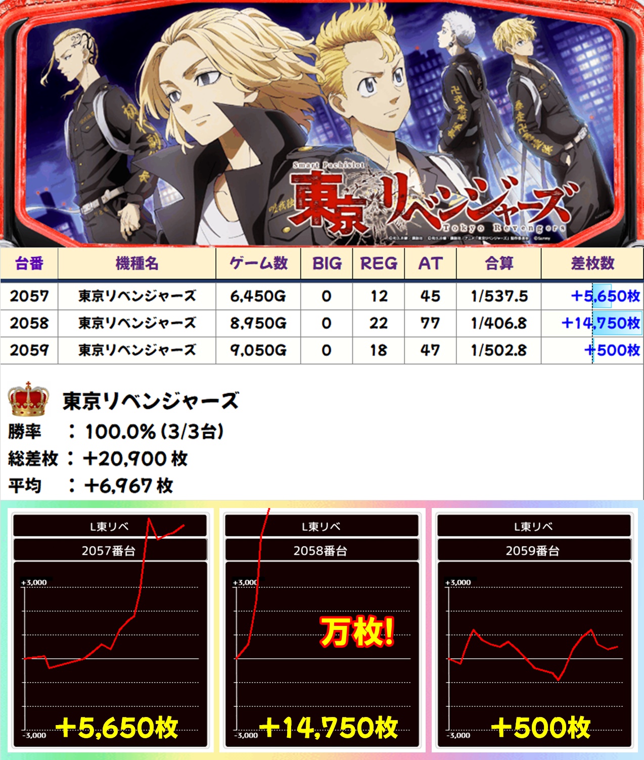 東リベは3台全てがプラスで、2057番台が+5,000枚オーバー、2058番台が万枚突破と優秀。平均差枚は約+7,000枚という凄まじい結果でした。