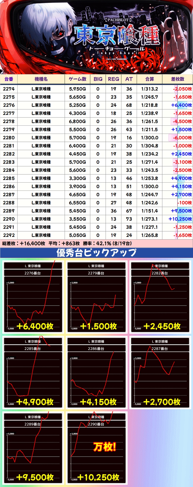 毎日オススメ機種は東京喰種・北斗転生2・ヴヴヴ2が高配分以上濃厚で、特に多くの優秀台が出現。東京喰種・北斗転生2には万枚突破台も確認できました。こちらは高配分機種があるだけでなく単品も多めになっているので常に狙い目です。