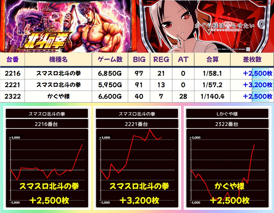 毎回どのエリアにも満遍なく仕掛けが用意されているため、悪番でも十分戦えます。打つ台に迷った際は主力機のモンキーV・炎炎ノ消防隊2・マギレコ・化物語、毎日オススメのスマスロ北斗・北斗転生2・東京喰種・ヴヴヴ2・かぐや様が狙い目なので、次回以降もぜひ注目してみてください。