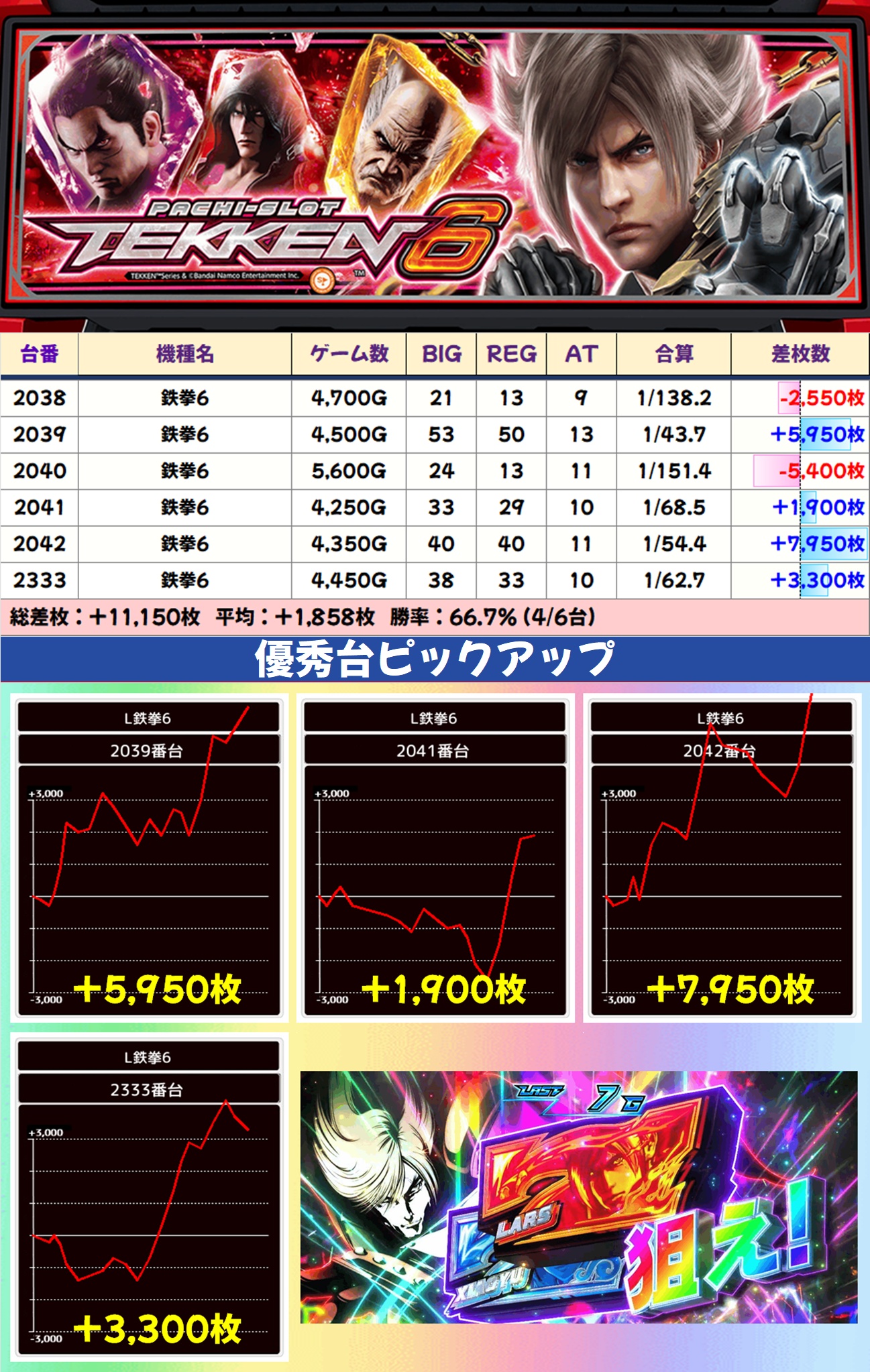 鉄拳6は6台中4台がプラスで平均+1,858枚という好成績。+3,000枚台、+5,000枚台、+7,000枚台の爆裂台が出現し、大いに盛り上がっていました。