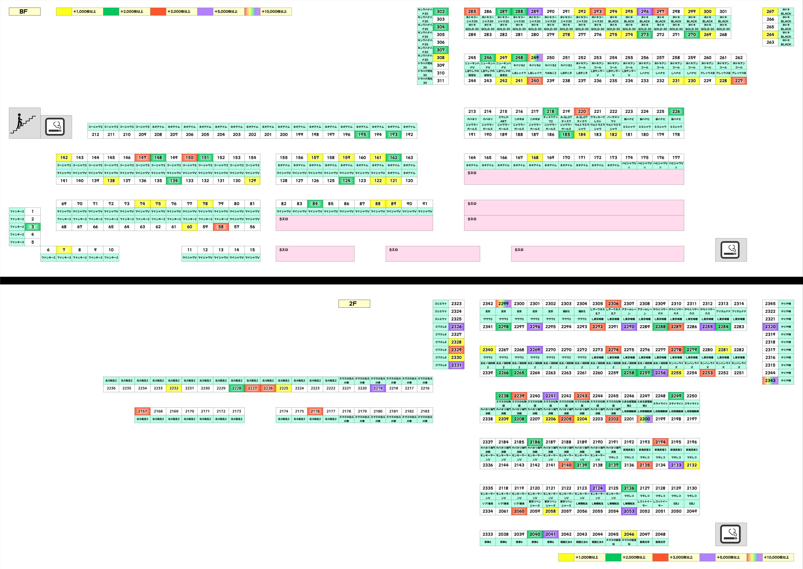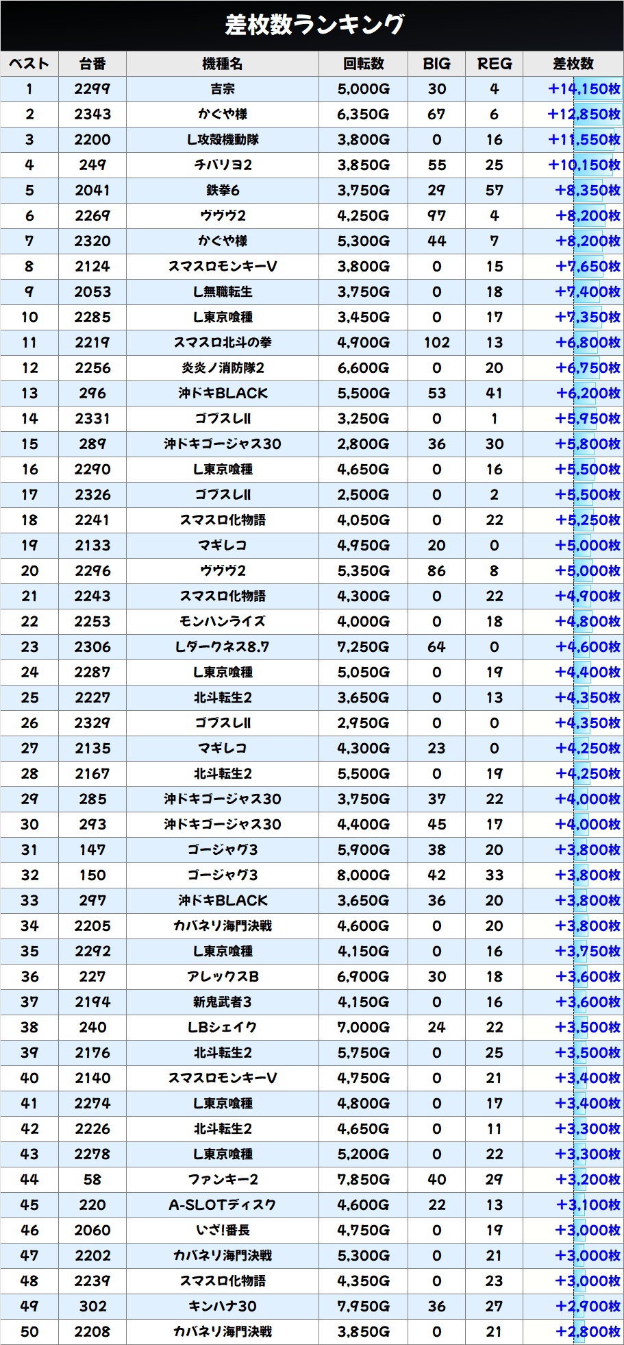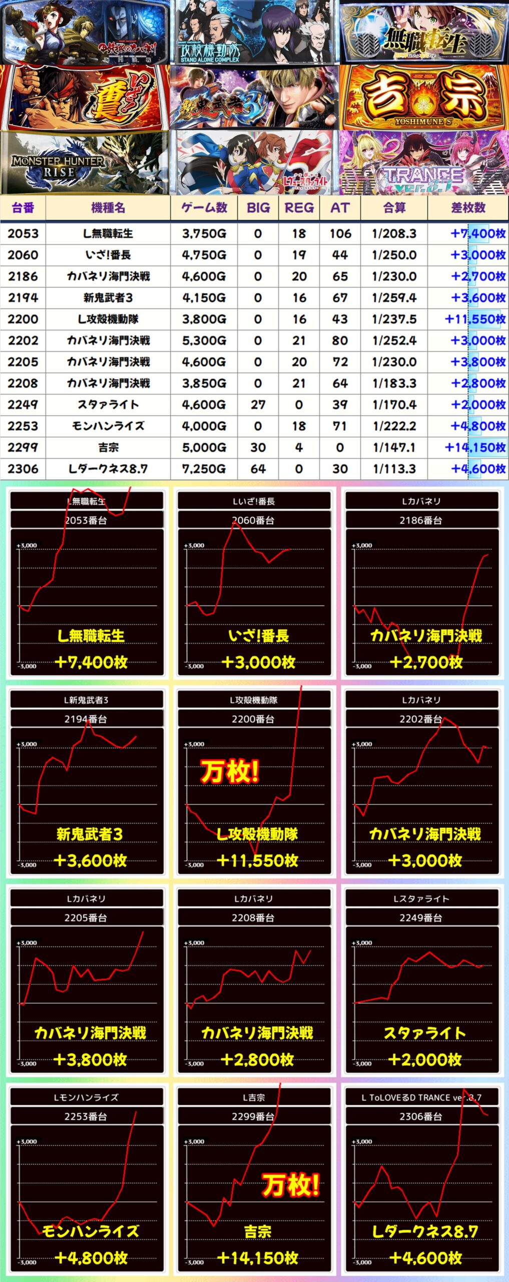 まだまだ単品の優秀台が盛りだくさん。L攻殻機動隊・吉宗には万枚突破台があり、週間オススメ機種の新鬼武者3・モンハンライズにも+3,000枚オーバー台を確認。新台のカバネリ海門決戦からも+2,000枚オーバー台が4台出現していたりと、新しめの機種にもしっかり注力されている様子が見受けられました。