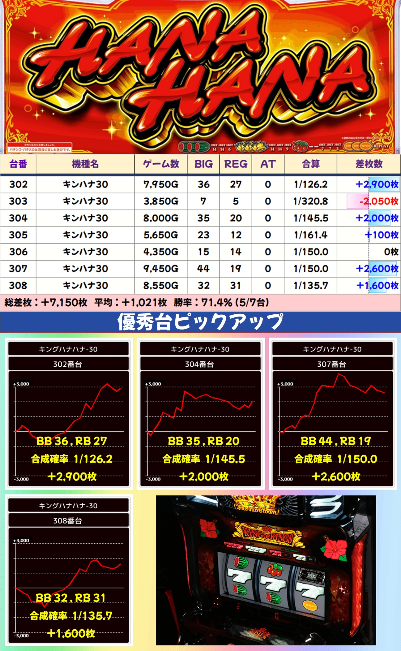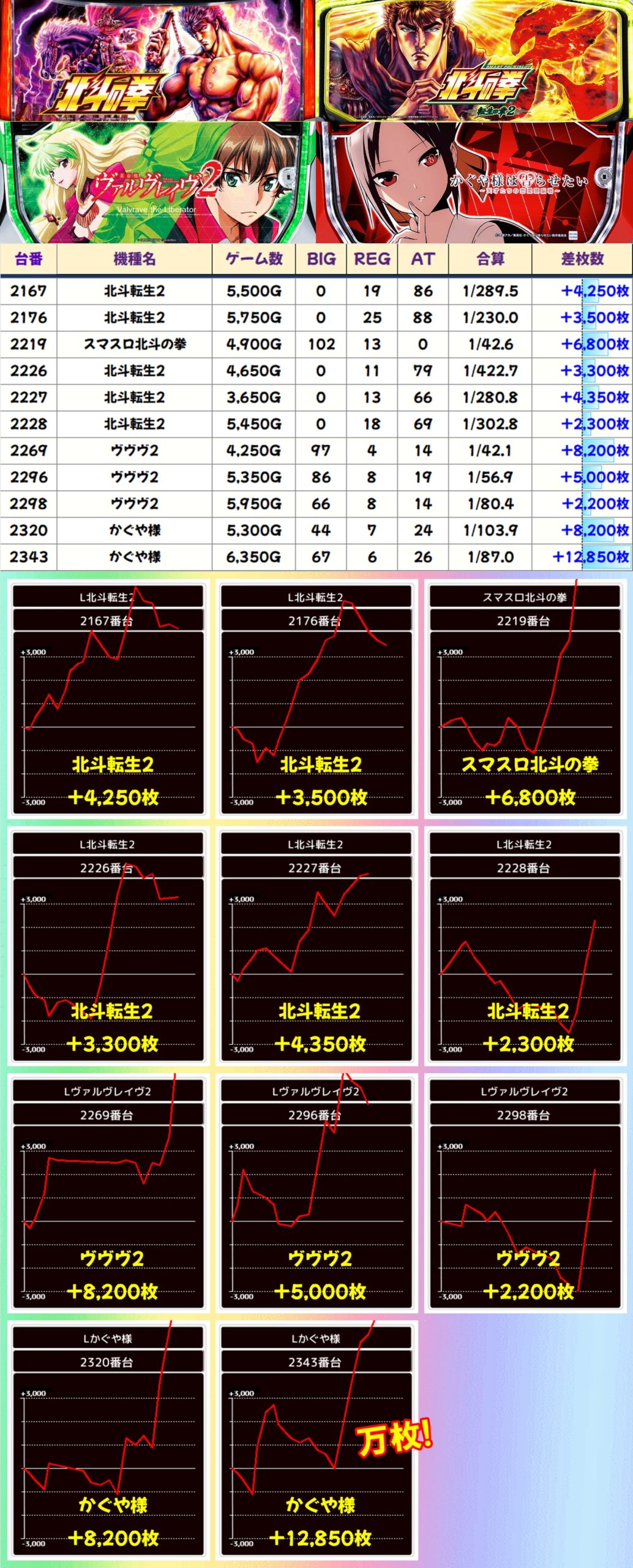 3のつく日は実績抜群で、今回も総差枚はしっかりプラス。結果からもお分かりいただけると思いますが、とにかく狙いドコロ満載の1日となっています。スマスロで打つ台に困った際は主力機のモンキーV・炎炎ノ消防隊2・マギレコ・化物語、毎日オススメのスマスロ北斗・北斗転生2・東京喰種・ヴヴヴ2・かぐや様が狙い目なので、ぜひこれらのメイン機種から攻めてみてください。