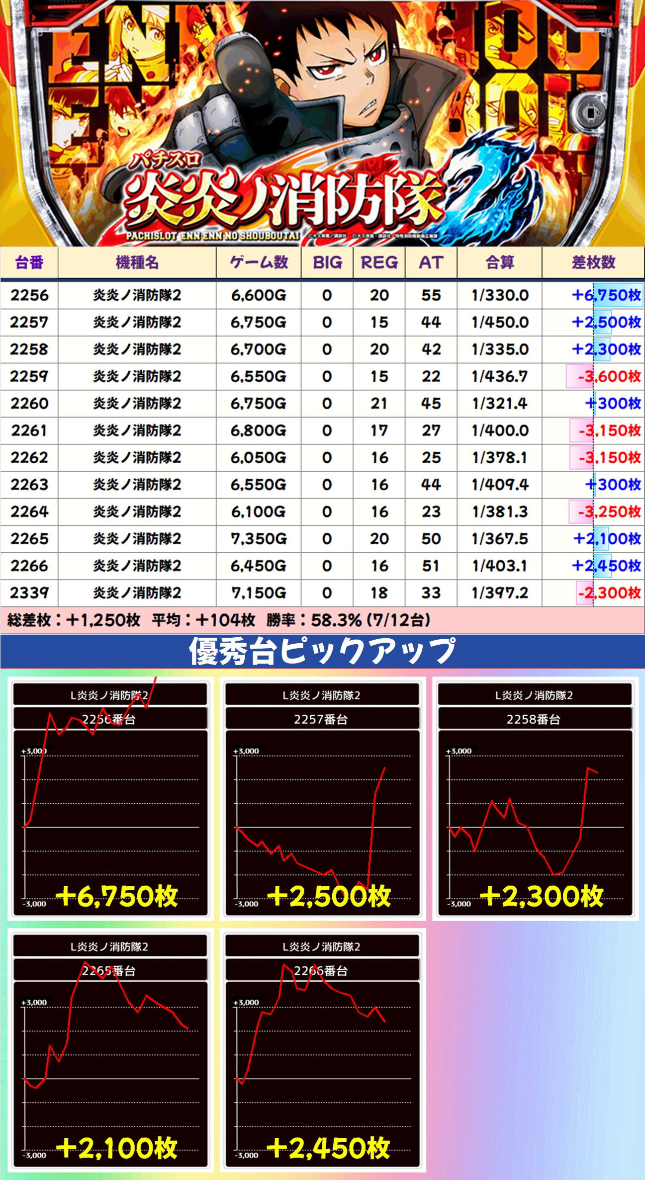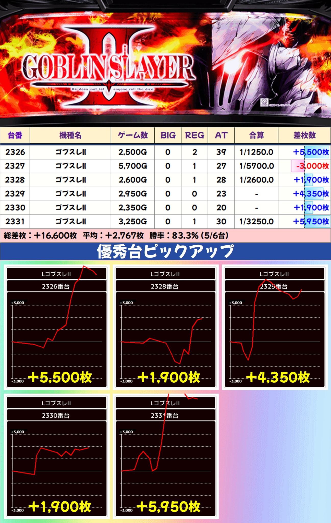 ゴブスレⅡは6台中5台がプラスで平均+2,767枚という好成績。荒めな機種ではありますが、これだけ勝率が高いとなると全台系だった可能性も十分考えられます。比較的安定して出ているグラフが多かったことからも質の高さが窺えますね!